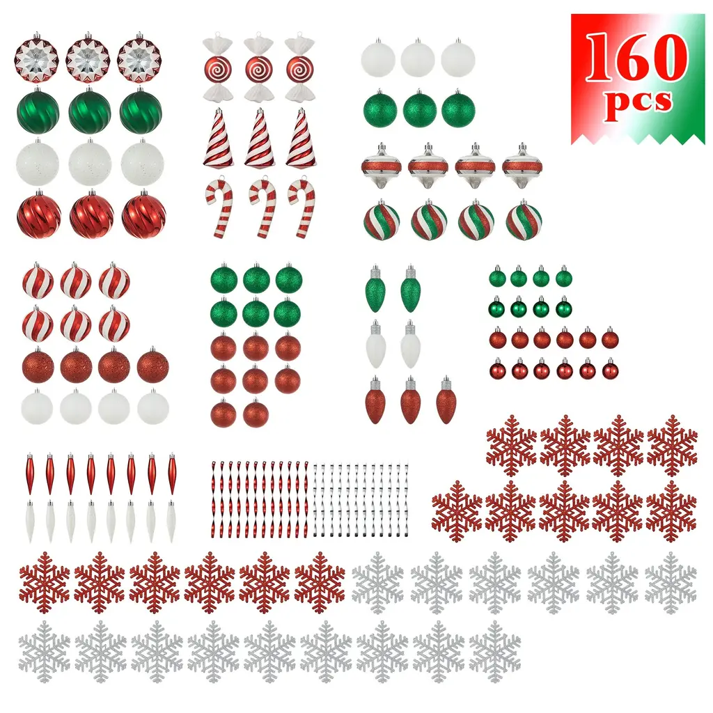 Enjoy the convenience of our set of 160ct shatterproof ornaments, featuring a variety of sizes and designs that effortlessly combine into one cohesive decoration set. Save time and energy by eliminating the need to select individual decorations, allowing you to quickly adorn your tree with ease.Features:Brand Profiles: