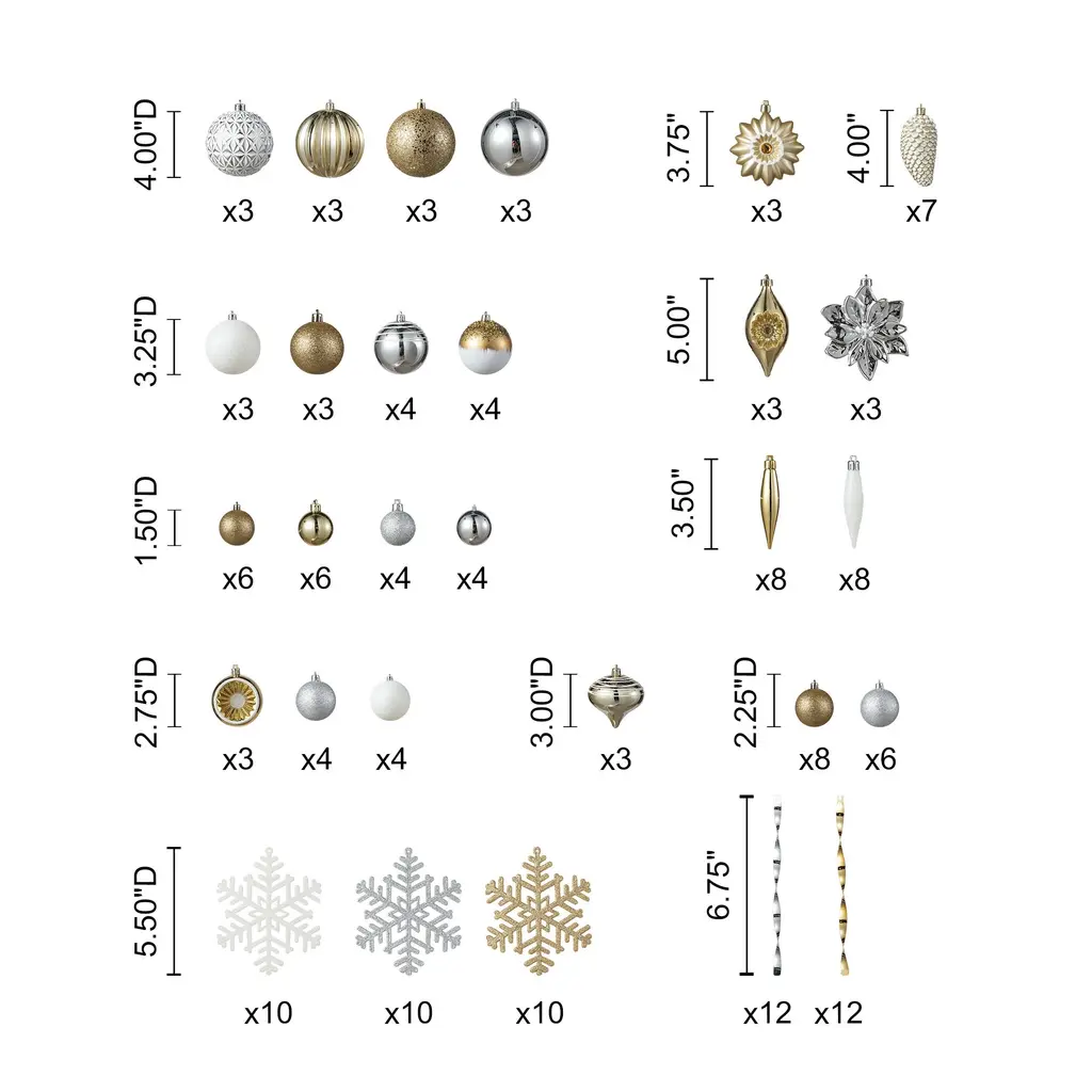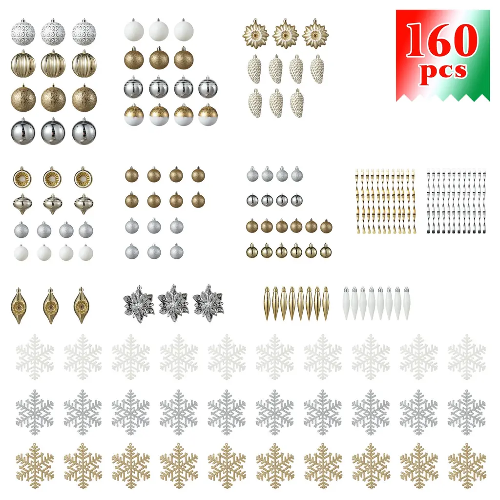 Enjoy the convenience of our set of 160ct shatterproof ornaments, featuring a variety of sizes and designs that effortlessly combine into one cohesive decoration set. Save time and energy by eliminating the need to select individual decorations, allowing you to quickly adorn your tree with ease.Features:Brand Profiles: