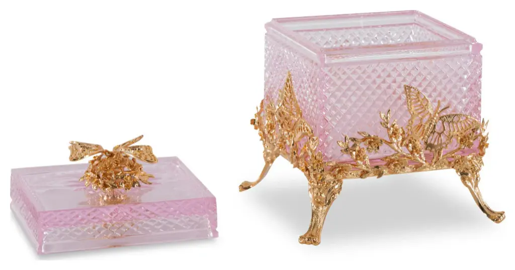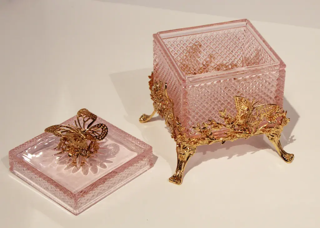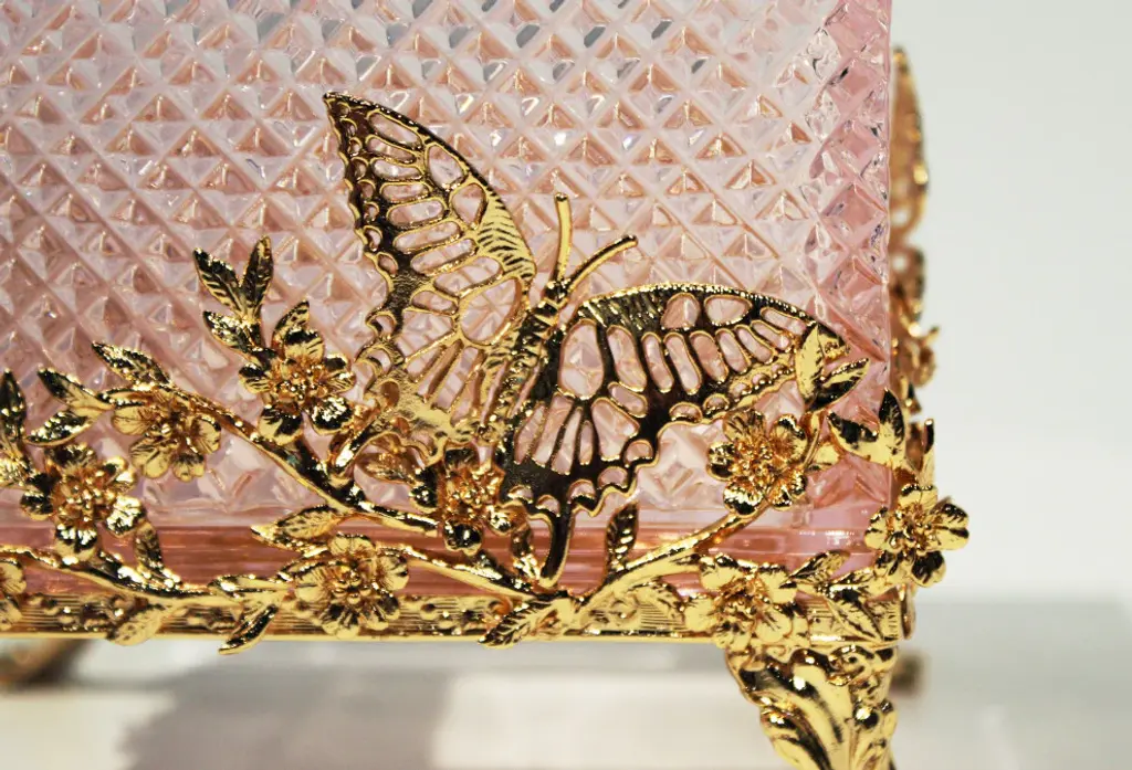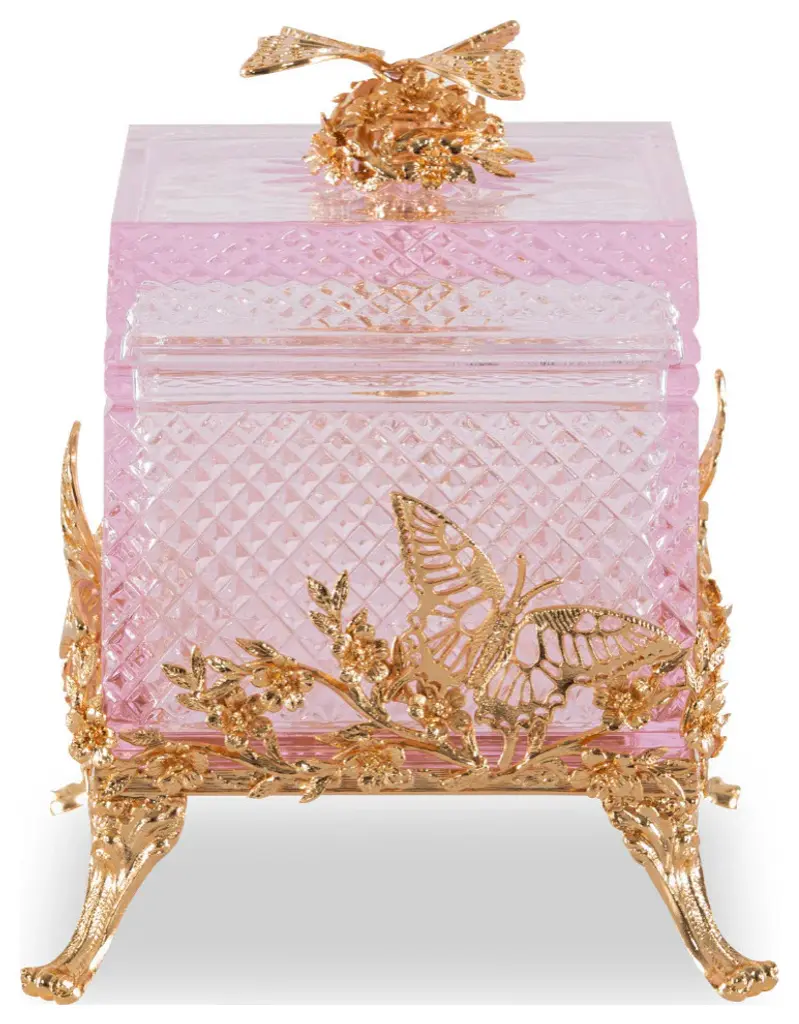 Square Pink Crystal box, engraved by hand with elegant woven patterns. Lost-wax cast solid brass butterflies delicately perch upon its frame, finished in gold