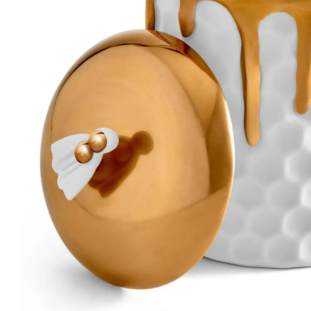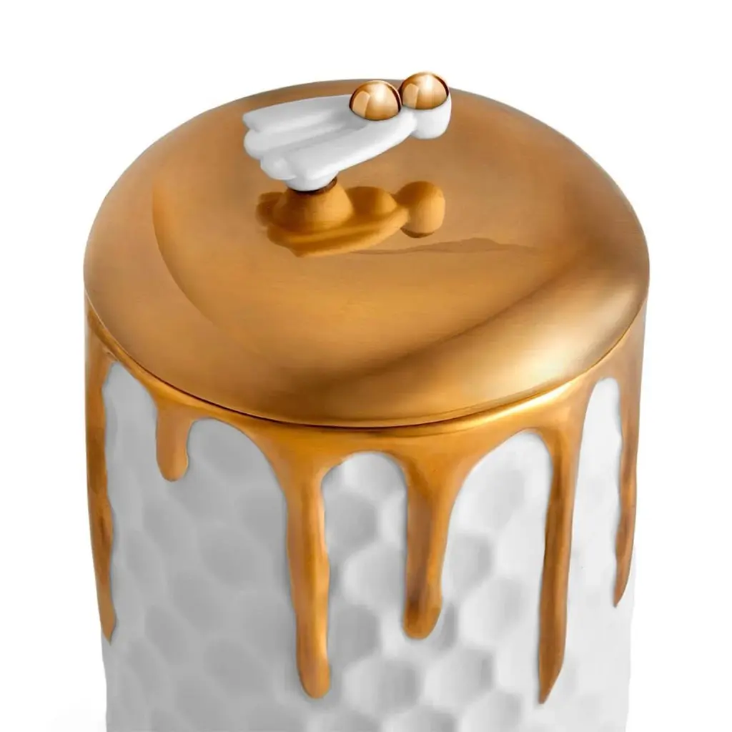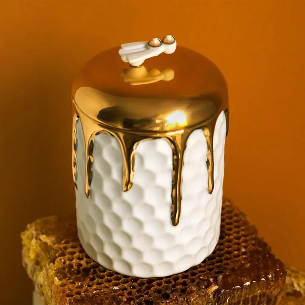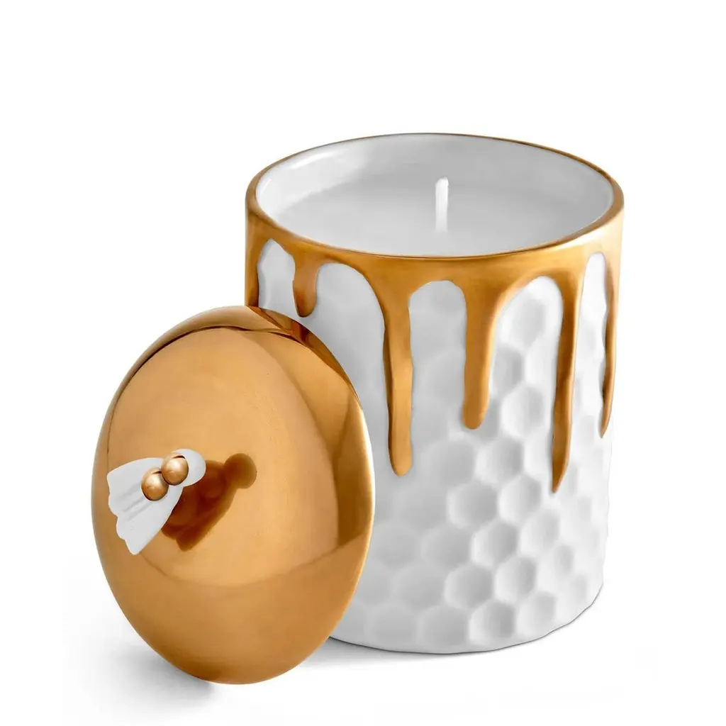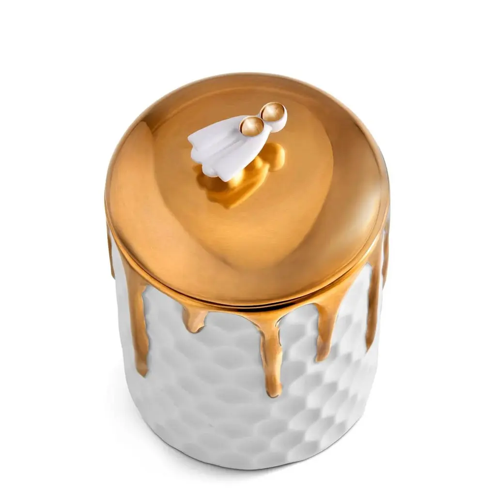 Candle Box Golded Bee made in porcelain with bee onthe lid. Lid in 24 24-karat gold-plated. In white finish porcelain and in 24-karat gold-plated. Include paraffin wax with single wick. Delivered in a luxury gift box.