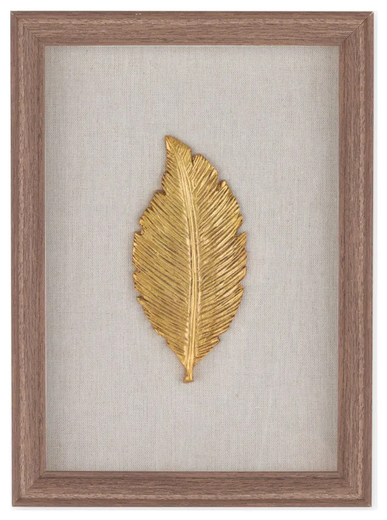Accent your space with the elegant beauty of nature. This charming shadow box features a golden leaf mounted on a linen backing and finished with a wood look poly-composite frame. Great on its own or pair it with it''s matching counterparts for a more impactful design. Each sold separatelyProduct Size: 9" x 2" x 12"Each sold separatelyFramedReady to Hang