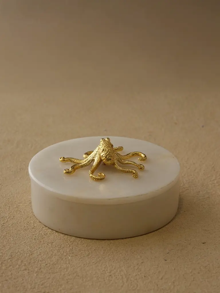Elevate your space with the refined elegance of this White & Gold Octopus Marble Storage Box. Expertly carved from solid marble, this luxurious piece blends organic texture with artistic detailing. The sculptural octopus lid, accented in lustrous gold, lends a sense of fantasy and sophistication—perfect for storing jewelry, keepsakes, or simply serving as a striking decorative accent. Whether styled on a vanity, console, or coffee table, it adds a touch of oceanic opulence to any setting.