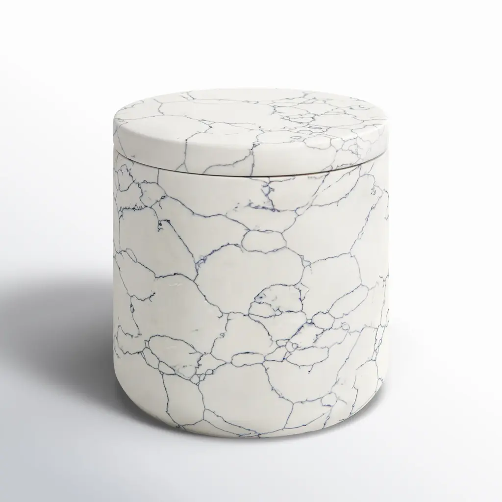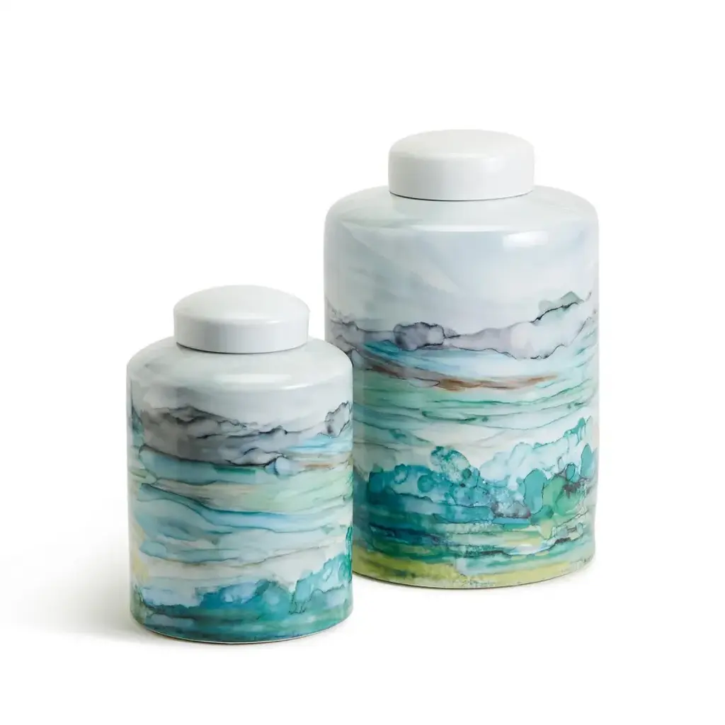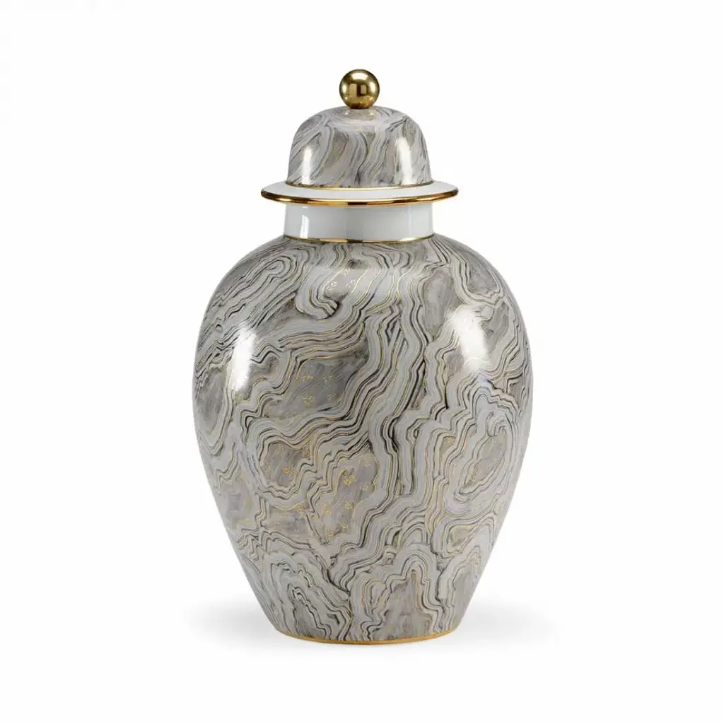 Golden smoke provides the illusion of movement with its black and gray decal over the white glazed porcelain canister. The metallic gold trim adds an elegant touch while the removable lid adds functional storage for small trinkets.