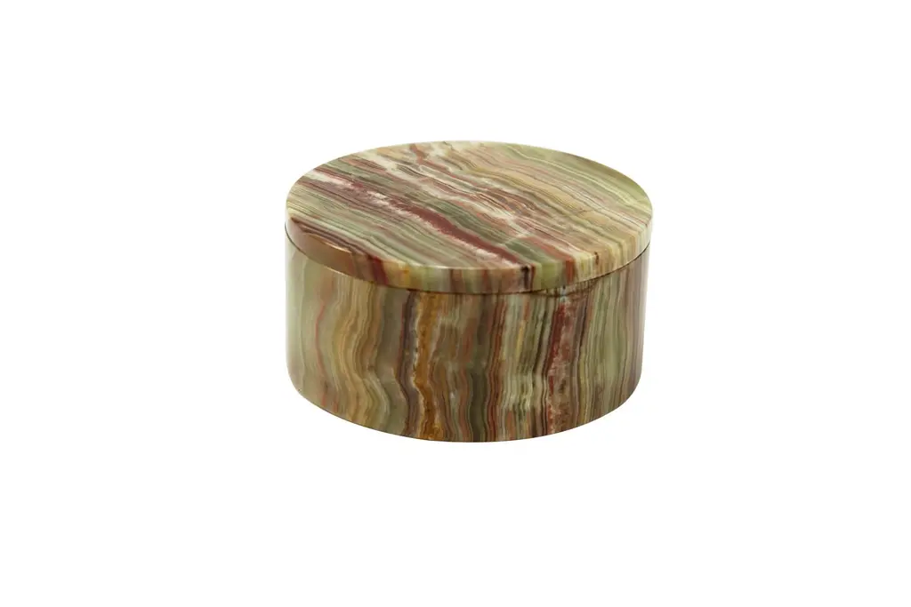 A Eirenne Collection Whirl Green Onyx 5" Circular Keepsake Box.