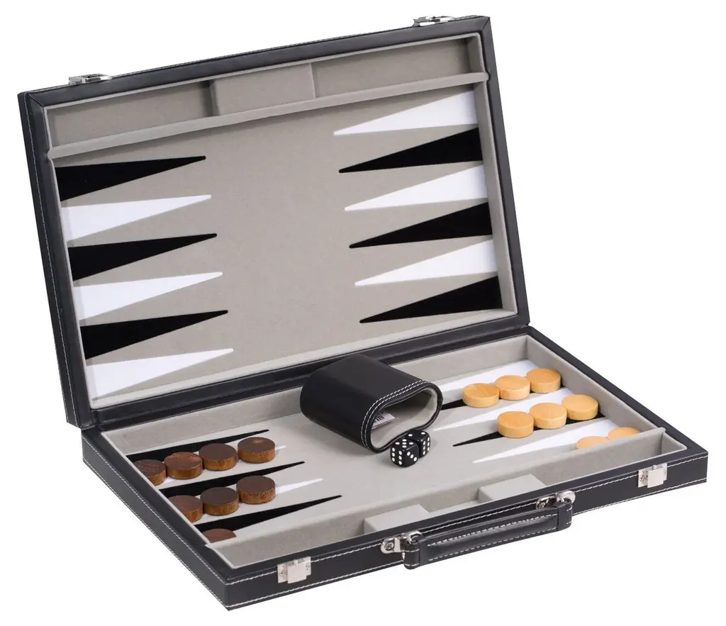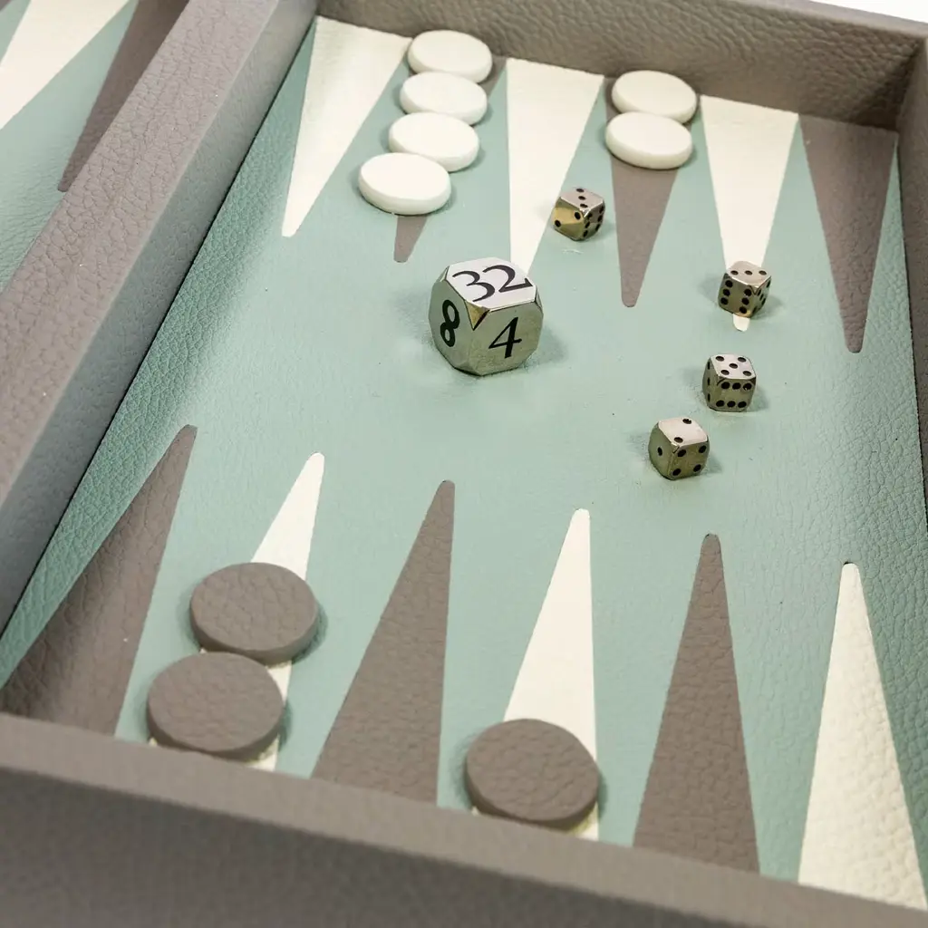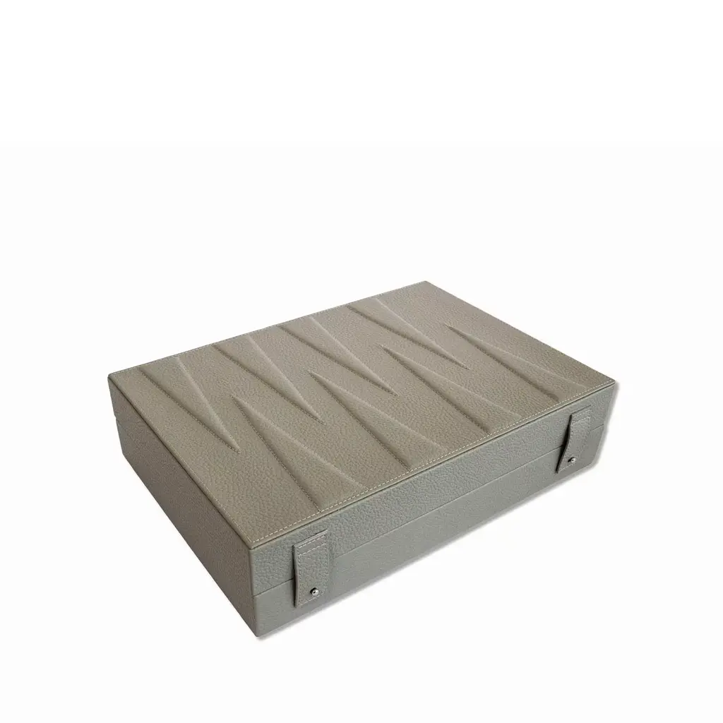 Wooden handmade backgammon game dressed in fine and soft genuine leather with brass dice in palladium plating. Available in different colors. Please, ask the Concierge for further details.