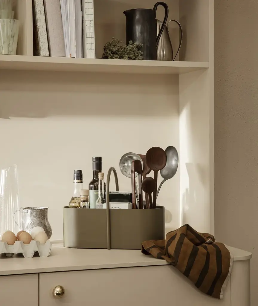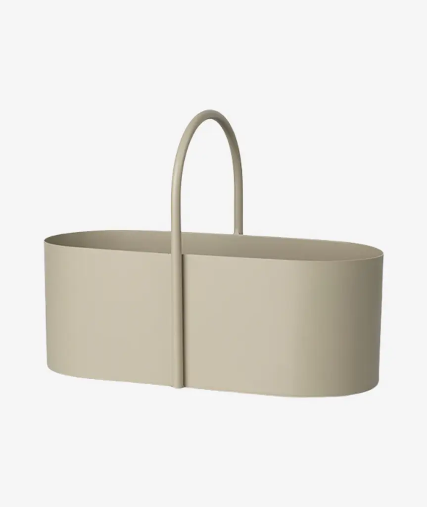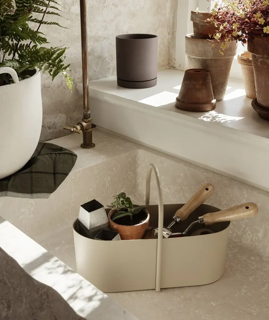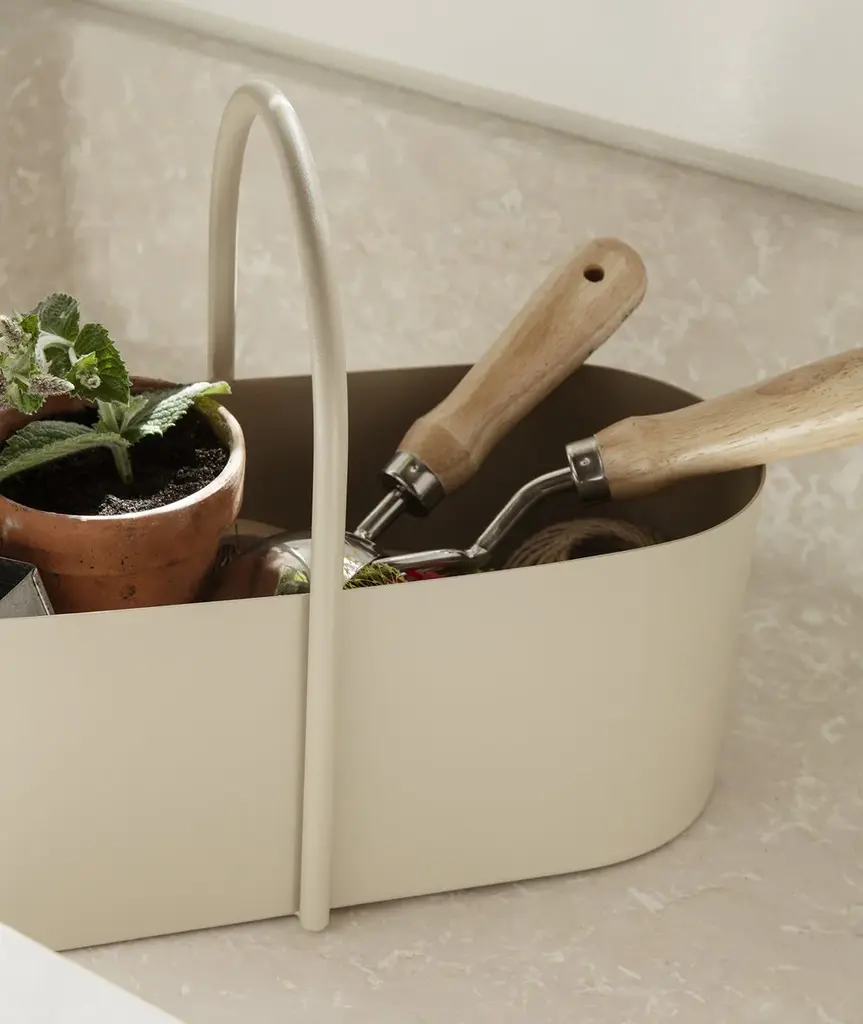 The Grib Toolbox is a handy solution for your various indoor-outdoor needs. Made from powder-coated metal, the gentle curves of its oval form are mirrored in the spherical handle, which rests comfortably in your palm when carried. We call it a toolbox, but you can use it for anything – gardening utensils, cleaning articles, office supplies or bathroom essentials.