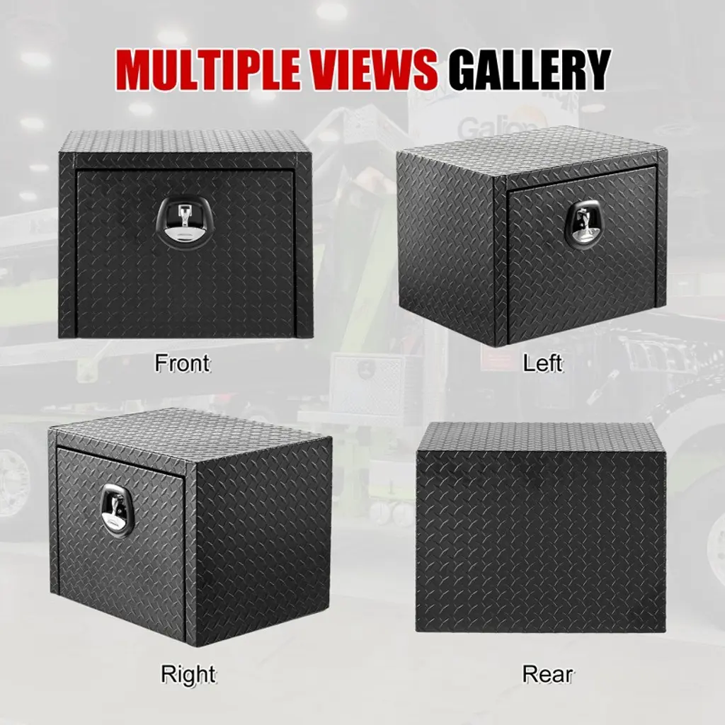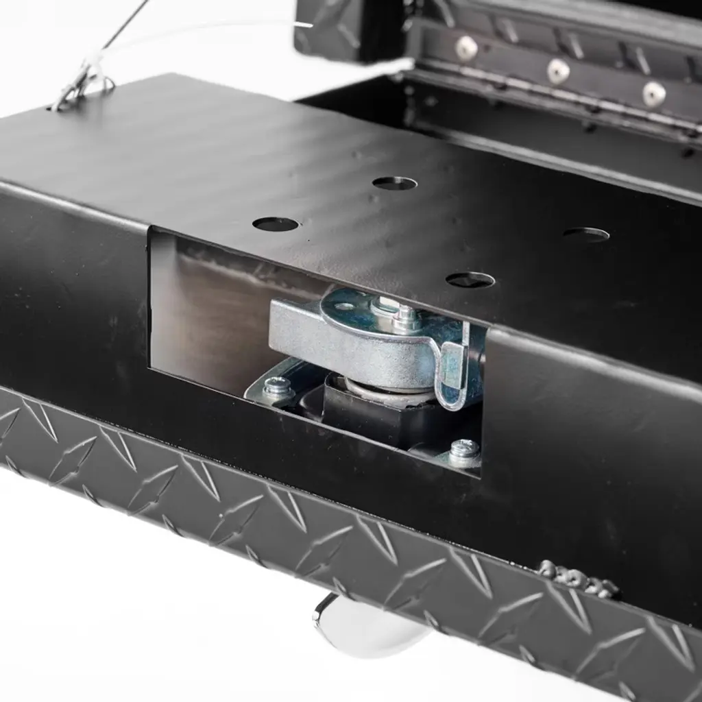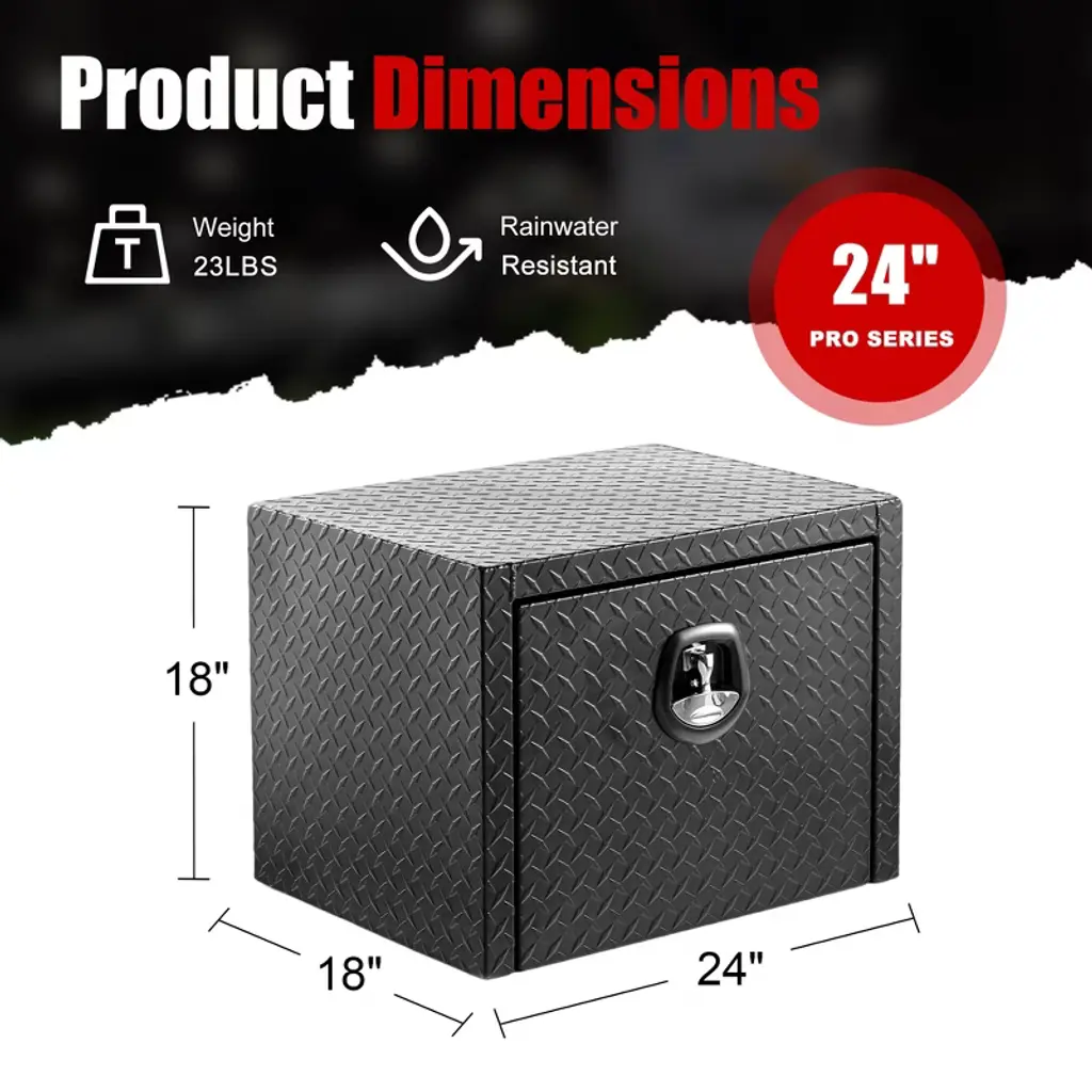 This Pro Series underbody truck tool box combines strength and style, made from 0.1" diamond thread aluminum with a scratch-resistant matte black finish. Available in 24"-48" lengths, it fits perfectly under flatbeds, dump trucks, and trailers. The 90-degree opening door with stainless hidden hinges ensures easy access, while the die-cast latch allows one-handed use and the whale tail lock adds security. With a drip rail and sealing ring for waterproofing, it keeps tools dry and organized--perfect for professionals and DIY enthusiasts upgrading their work vehicles.
