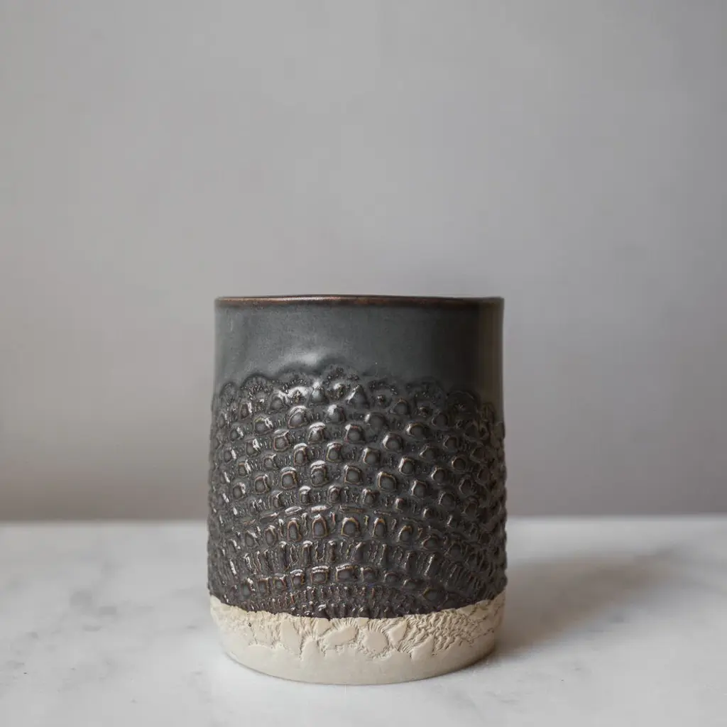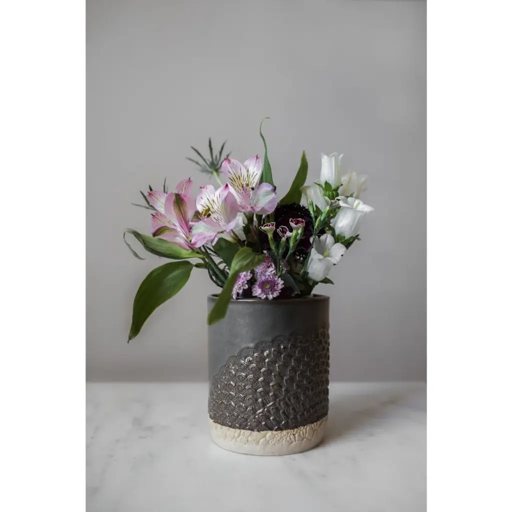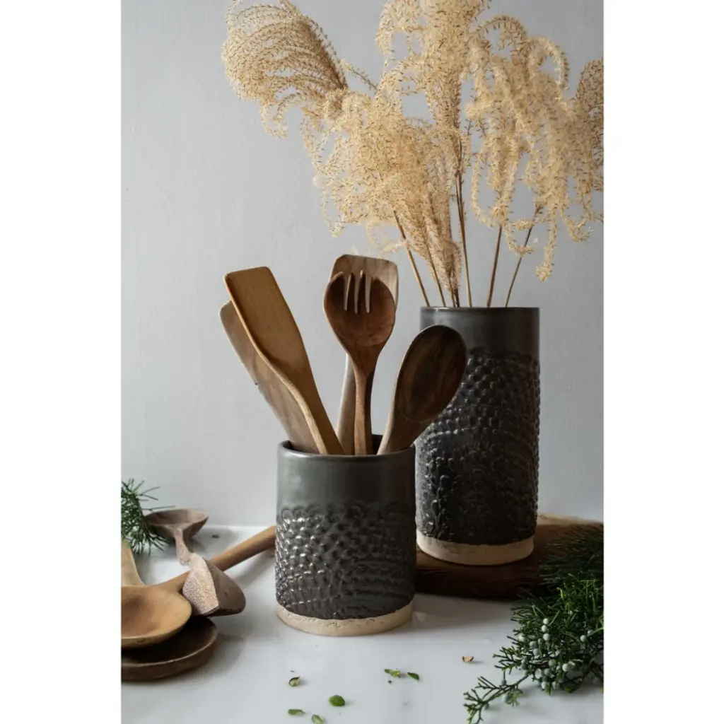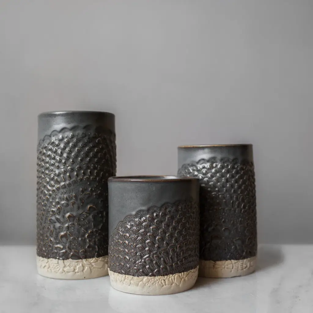 Hand-built with care and adorned with delicate lace, our stunning ceramic canister is not only a beautiful addition to any kitchen, but a functional one too. Use it to hold spoons and utensils or as a vase for a large floral arrangement. Elegant and versatile, it's a must-have for any home.