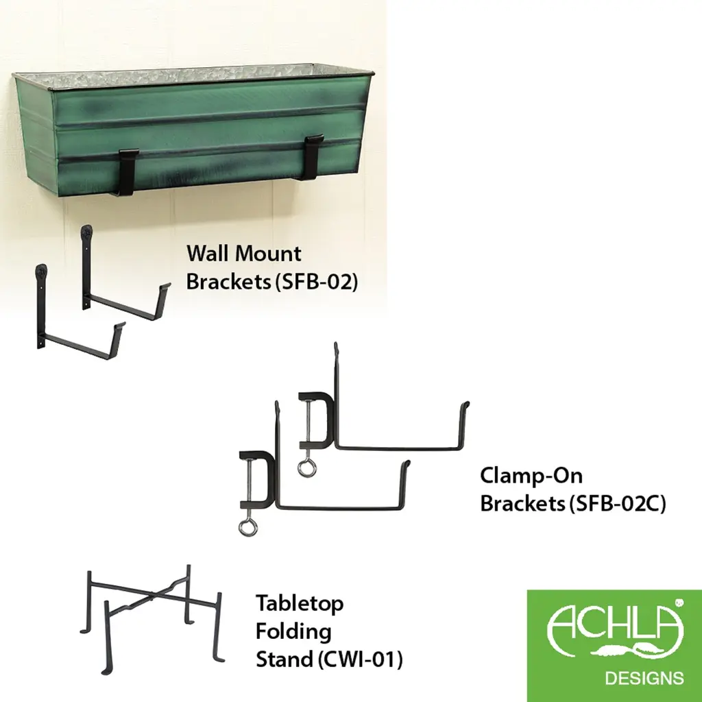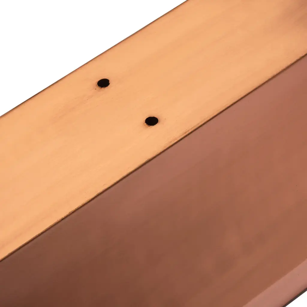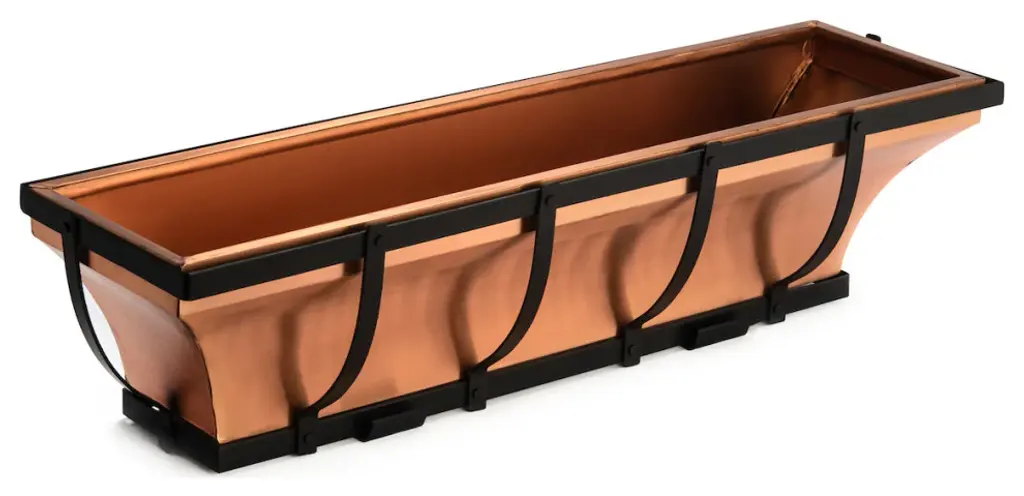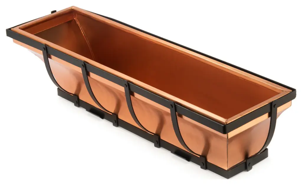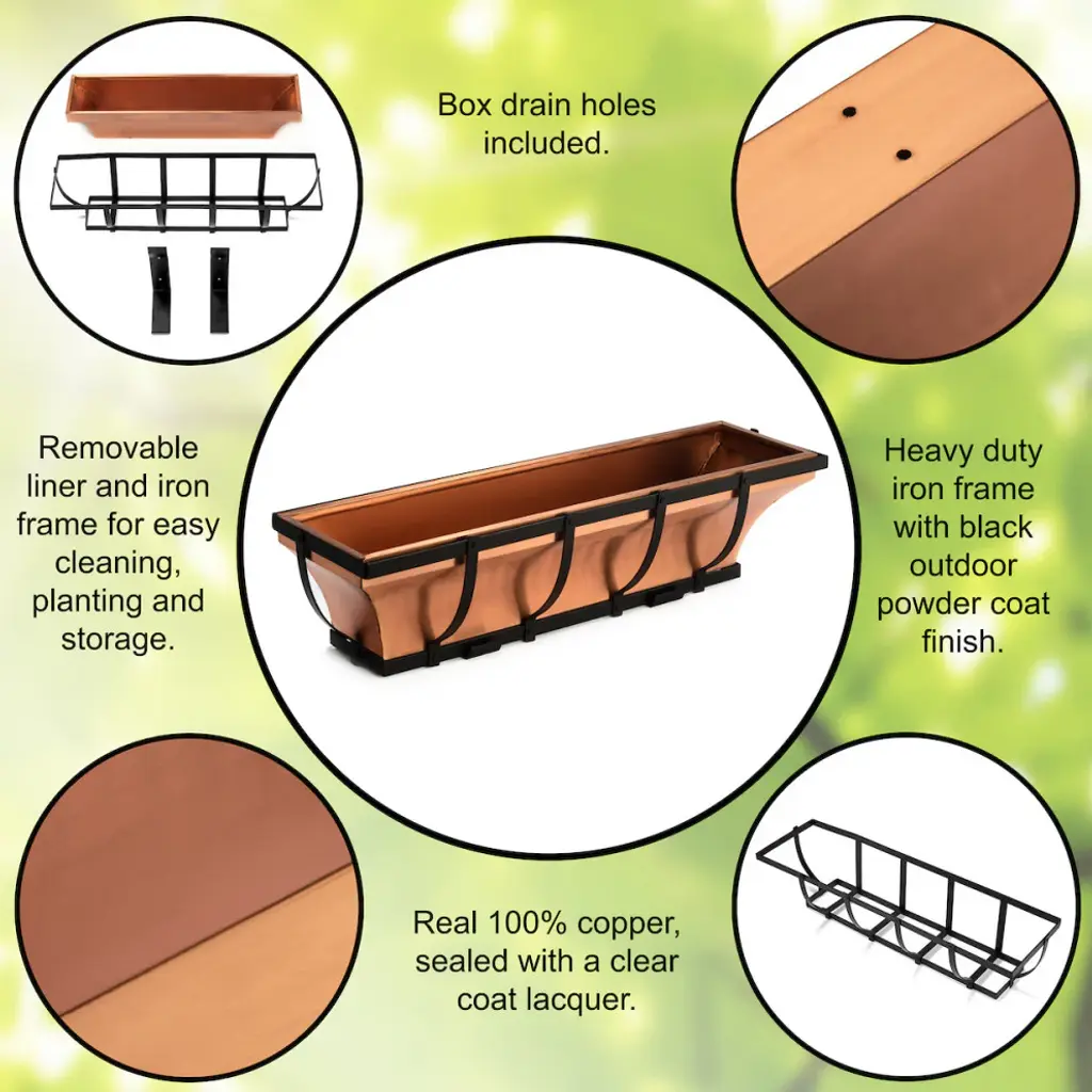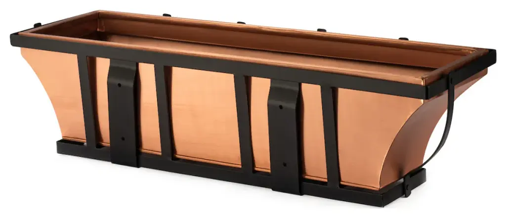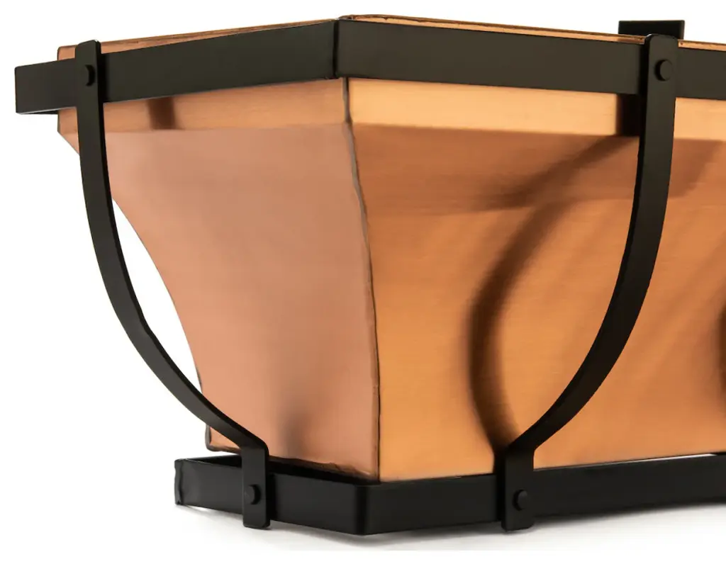 Real copper, not just a copper finish. Excellent drainage. Mounting brackets allow you to mount under windows or on wooden decks. Included brackets also make removal easy for planting and care. Black Iron has a powder coat finish to protect against rusting Designed and Manufactured by H Potter. Weighs 18 pounds