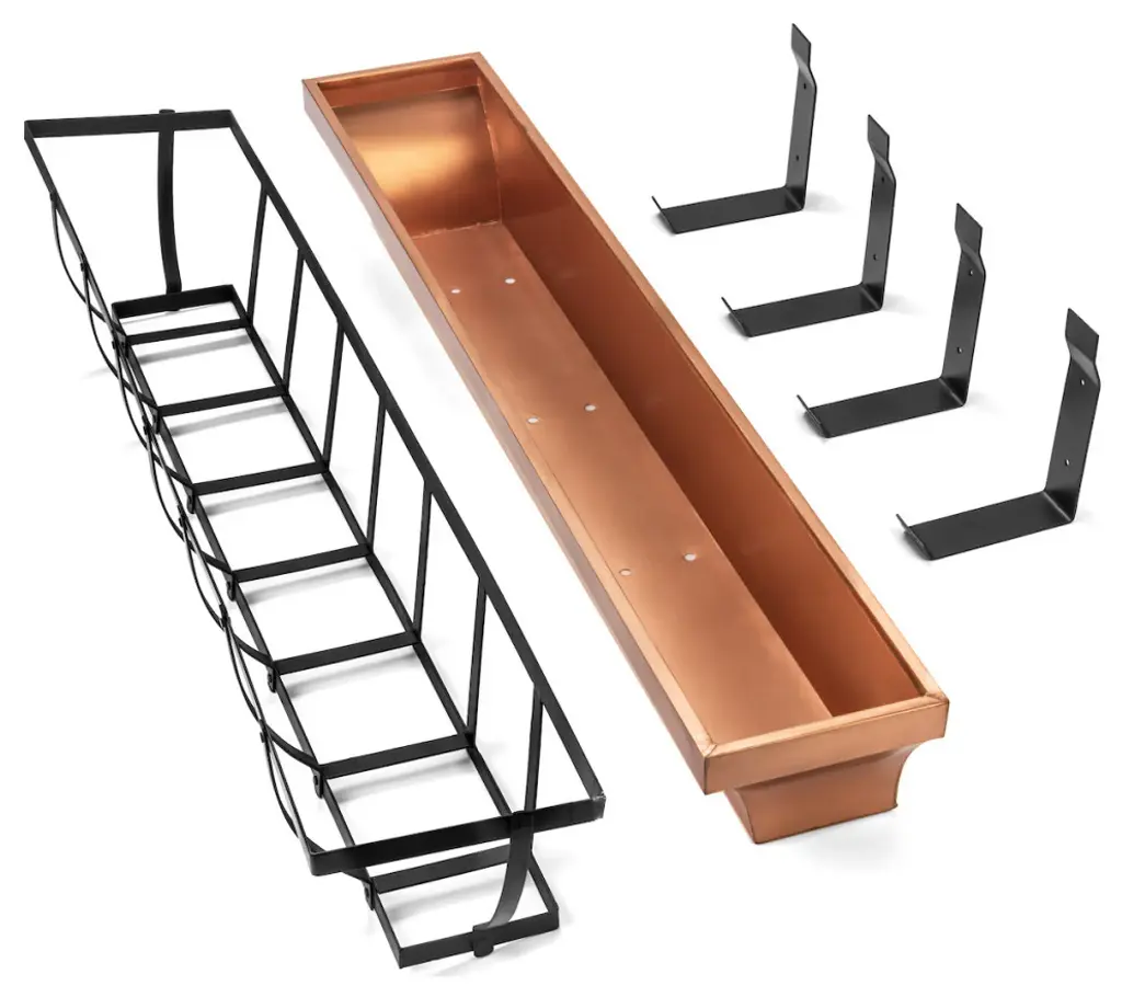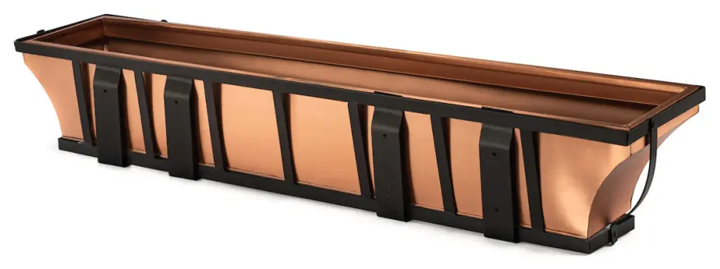 Real copper, not just a copper finish. Excellent drainage. Mounting brackets allow you to mount under windows or on wooden decks. Included brackets also make removal easy for planting and care. Black Iron has a powder coat finish to protect against rusting Designed and Manufactured by H Potter. Weighs 18 pounds