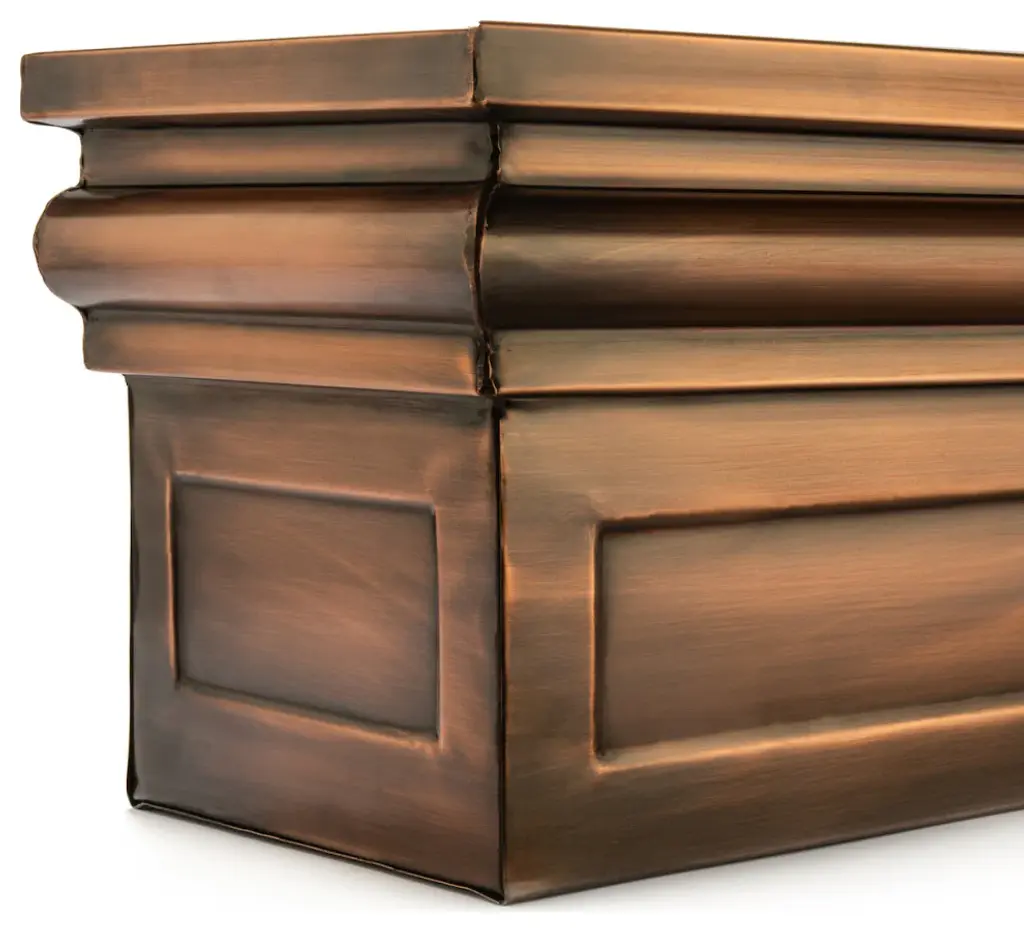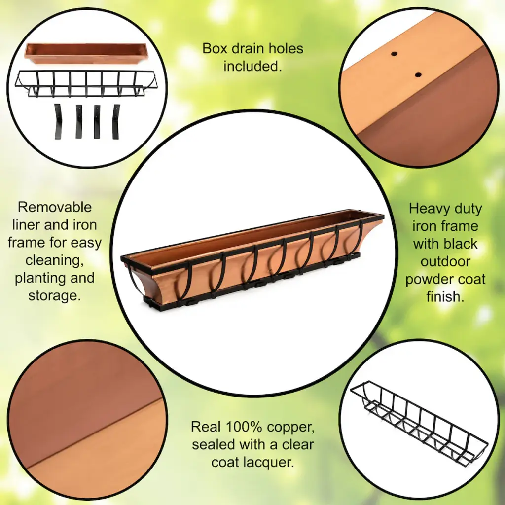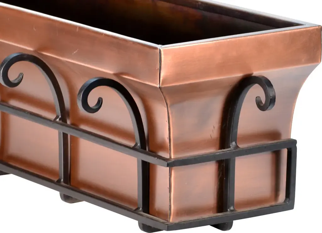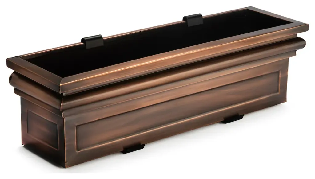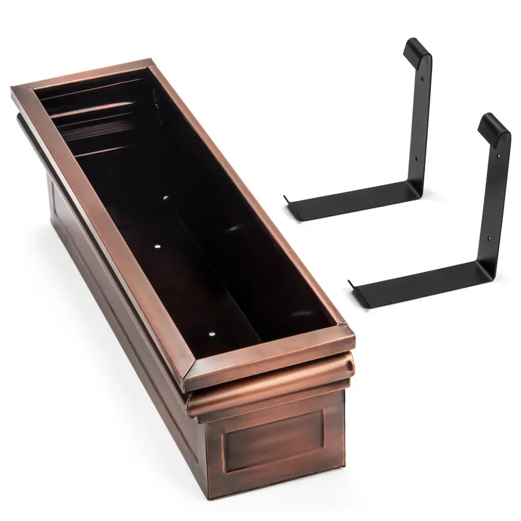 Stainless Steel with a Antique Copper Finish Mounting brackets allow you to mount under windows or on wooden decks. Included brackets also make removal easy for planting and care. Black Iron has a powder coat finish to protect against rusting Designed and Manufactured by H Potter. Available in three sizes. Weighs 20 pounds