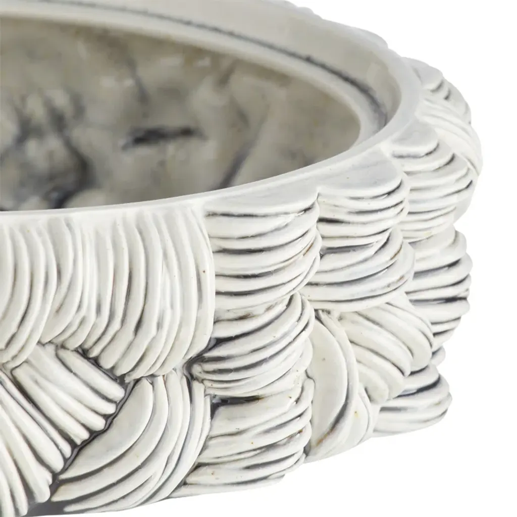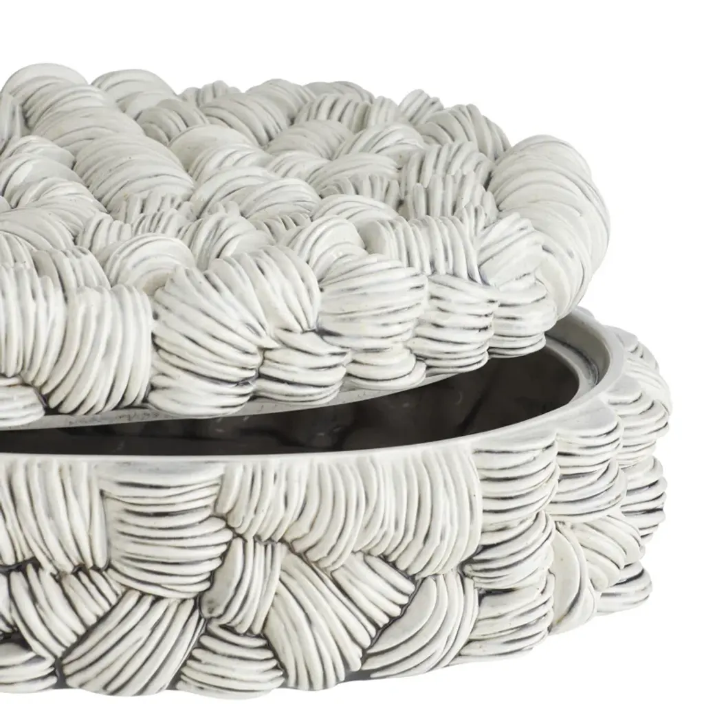 The Super Ellipse Boxes & Tray feature a contemporary design with sleek curves, crafted from individual white bone tiles that are meticulously applied by artisans for a refined look.