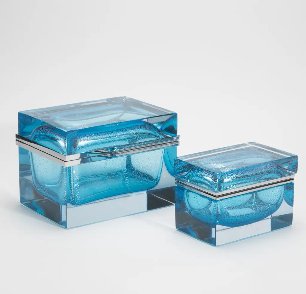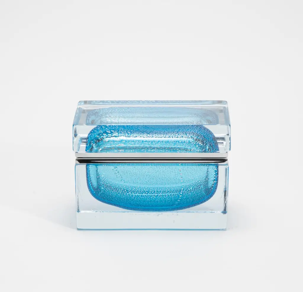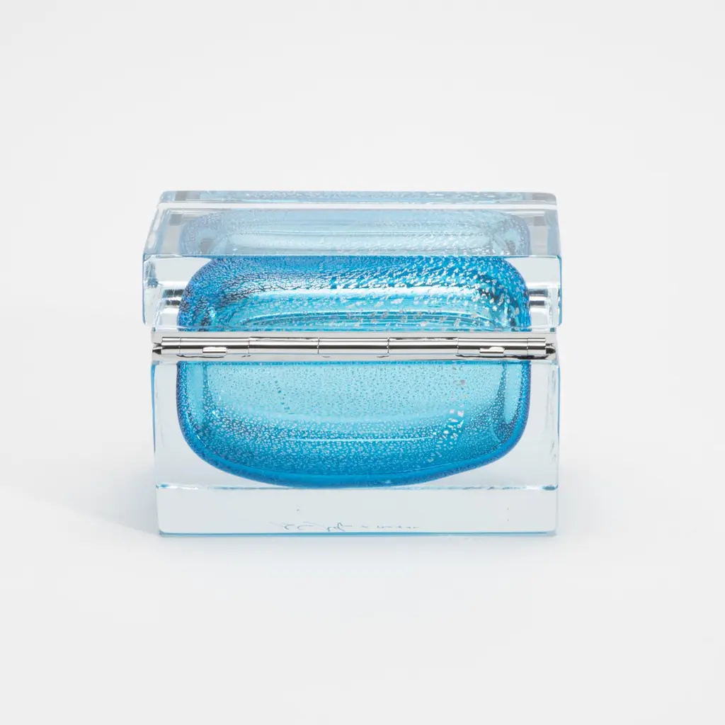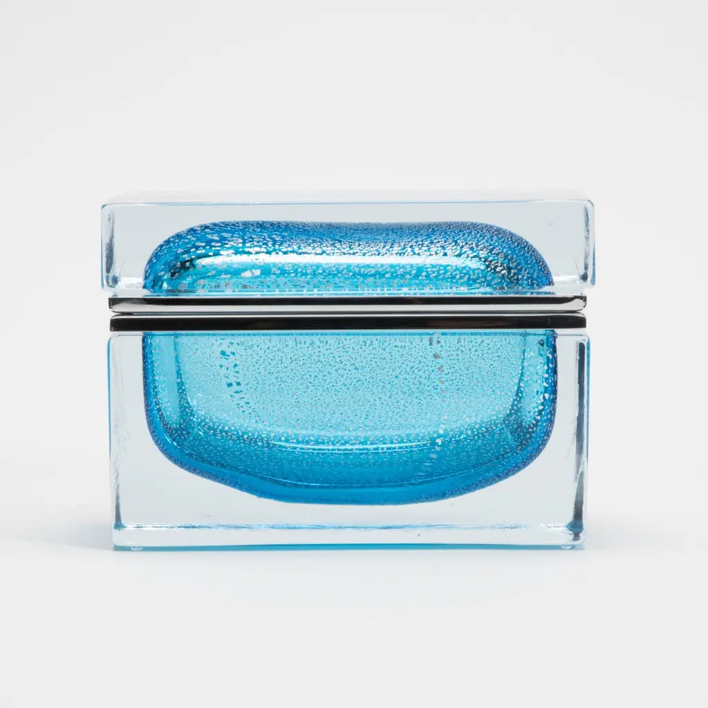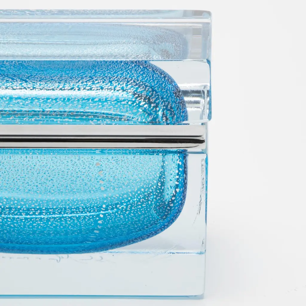 An exquisite showcase of contemporary Murano craftsmanship, this hand-blown giant box in aqua blue is a sculptural treasure that blends clarity, luminosity, and refinement. Encased in a thick, crystal-clear silhouette with softly rounded corners, the box features a mesmerizing play of silver leaf flecks that appear to drift in suspension—evoking sea foam caught in motion. The vibrant aquatic hue glows with a serene radiance, beautifully offset by the high-polish chrome frame that outlines the hinged lid with tailored precision. Every angle reveals new depths, where light refracts through undulating inner contours, creating a liquid-like effect that feels both architectural and ethereal. Entirely handmade in Italy and signed by the artisan, this functional objet d’art transcends its utilitarian form. Whether styled on a console, nightstand, or within a curated vitrine, it lends a refined splash of color and an unmistakable air of bespoke Italian luxury to any sophisticated interior.