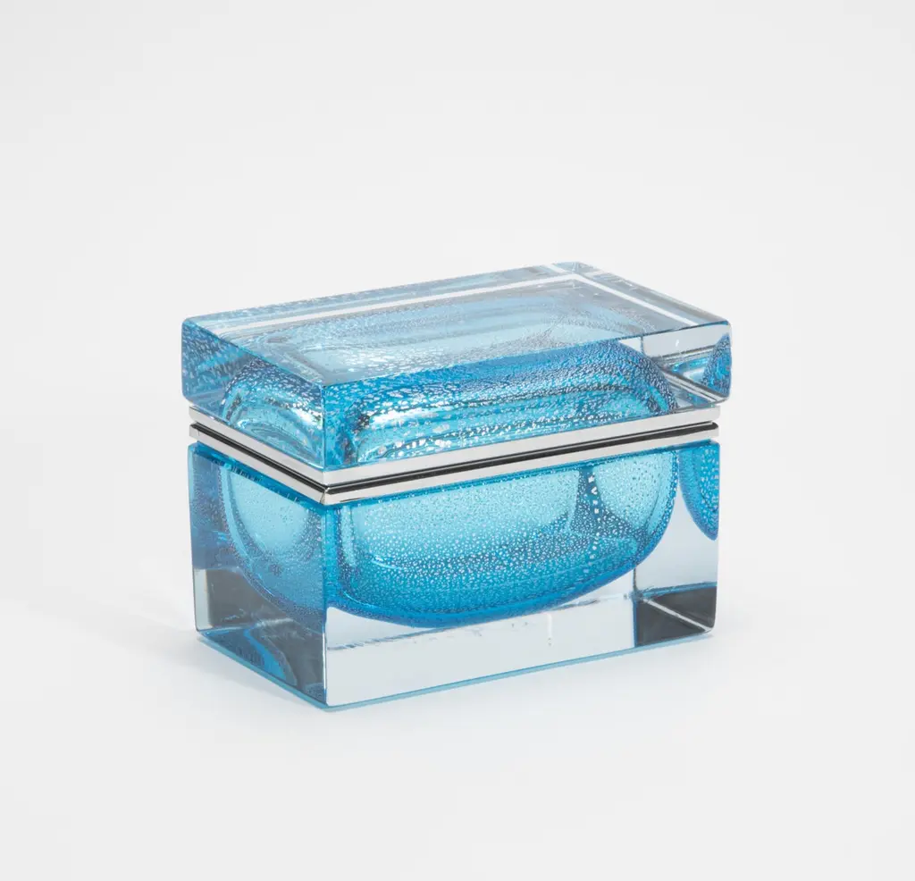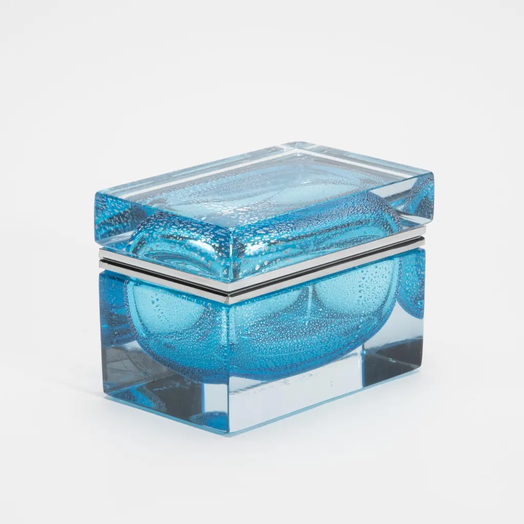 Hand-Blown Murano Box In Aqua Blue With Silver Flecks And Chrome Fittings