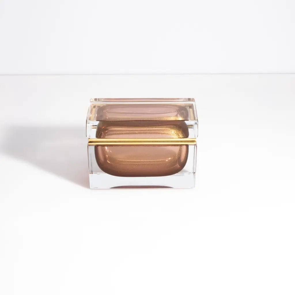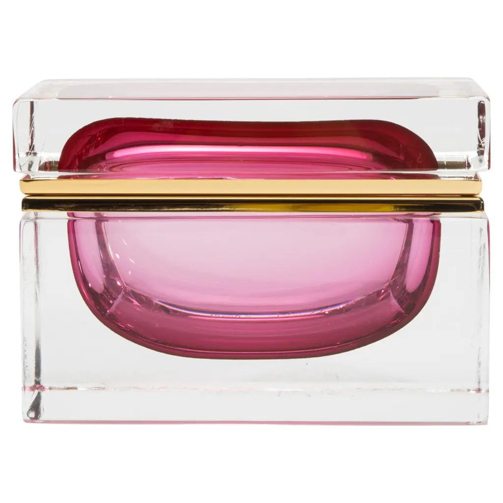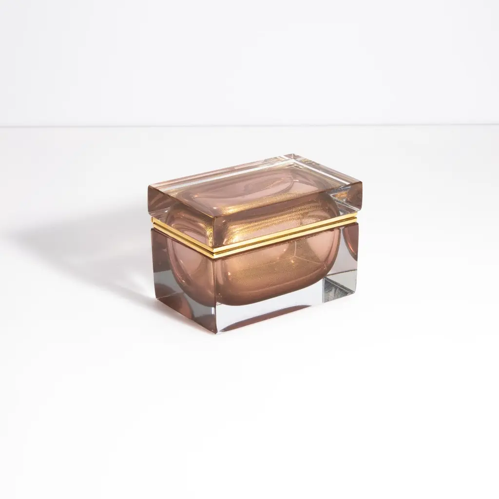 This evocative and alluring Murano glass box is a magnificent fusion of masterful craftsmanship and natural beauty. Handcrafted on the famed Venetian island of Murano, this box showcases the mesmerizing allure of amethyst, a gemstone revered for its captivating purple hues and spiritual significance.Each box is meticulously blown by skilled artisans, ensuring that every piece is unique and carries the unmistakable charm of handmade craftsmanship. The amethyst hue with the 24 Karat gold flecks infuses the glass with depth and richness, creating a stunning display of color that catches the light from every angle.With its generous size, this Murano box offers ample storage space for jewelry, trinkets, or other cherished keepsakes, making it both a functional and decorative piece. Whether displayed prominently on a dresser, coffee table, or mantelpiece, it serves as a striking focal point that adds a touch of luxury and elegance to any space.As a symbol of timeless beauty and exquisite artistry, the Hand-Blown Large Amethyst Murano Box is sure to become a cherished heirloom, treasured for generations to come.Reference Number: 197923C
