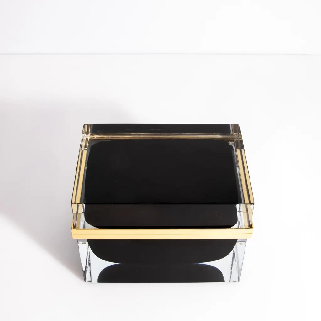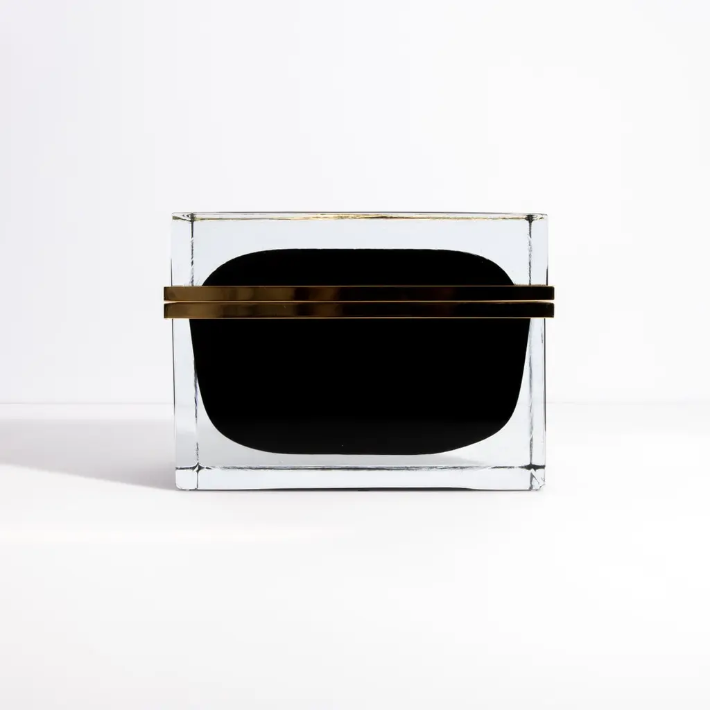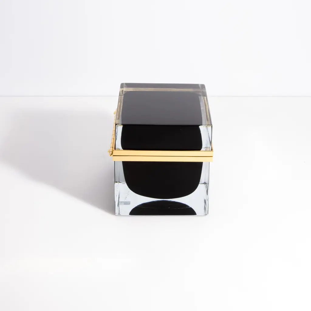 Discover the epitome of elegance with this exquisite Murano glass box, meticulously crafted in Murano, Italy. Available in both large and giant sizes, this box exudes sophistication with its pristine condition, ensuring it is brand new and flawless. The exterior is a captivating clear crystal that seamlessly transitions into the sleek onyx black glass interior. This unique combination creates a dynamic visual effect that captures and plays with light beautifully, making it a true statement piece for any luxury setting.The interior of this magnificent box is lined with rich onyx black, providing a striking contrast to its crystalline exterior. The deep, glossy onyx black finish inside not only enhances its luxurious appeal but also ensures it is as practical as it is beautiful. Perfect for storing cherished items, this box combines function with opulent design, making it a versatile addition to any upscale decor. The seamless blend of clear crystal and onyx black glass showcases the meticulous craftsmanship involved in its creation.Accentuating its luxurious design, this box features elegant brass fittings that add a warm, sophisticated touch to its timeless elegance. The brass elements provide a perfect contrast to the clear crystal and the deep onyx black interior, highlighting the modern sophistication and attention to detail that Murano is renowned for. Crafted in Murano, Italy, this box stands as a testament to superior craftsmanship and luxurious design. Whether displayed prominently on a mantel or used as an elegant storage solution, this box is sure to impress and elevate any space with its timeless beauty and refined elegance. All Murano Glass boxes are in excellent condition and signed for MOGUL.