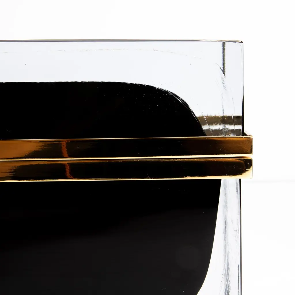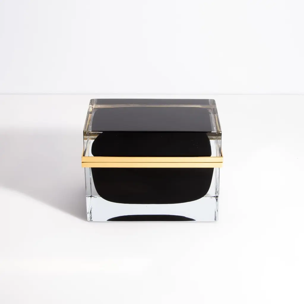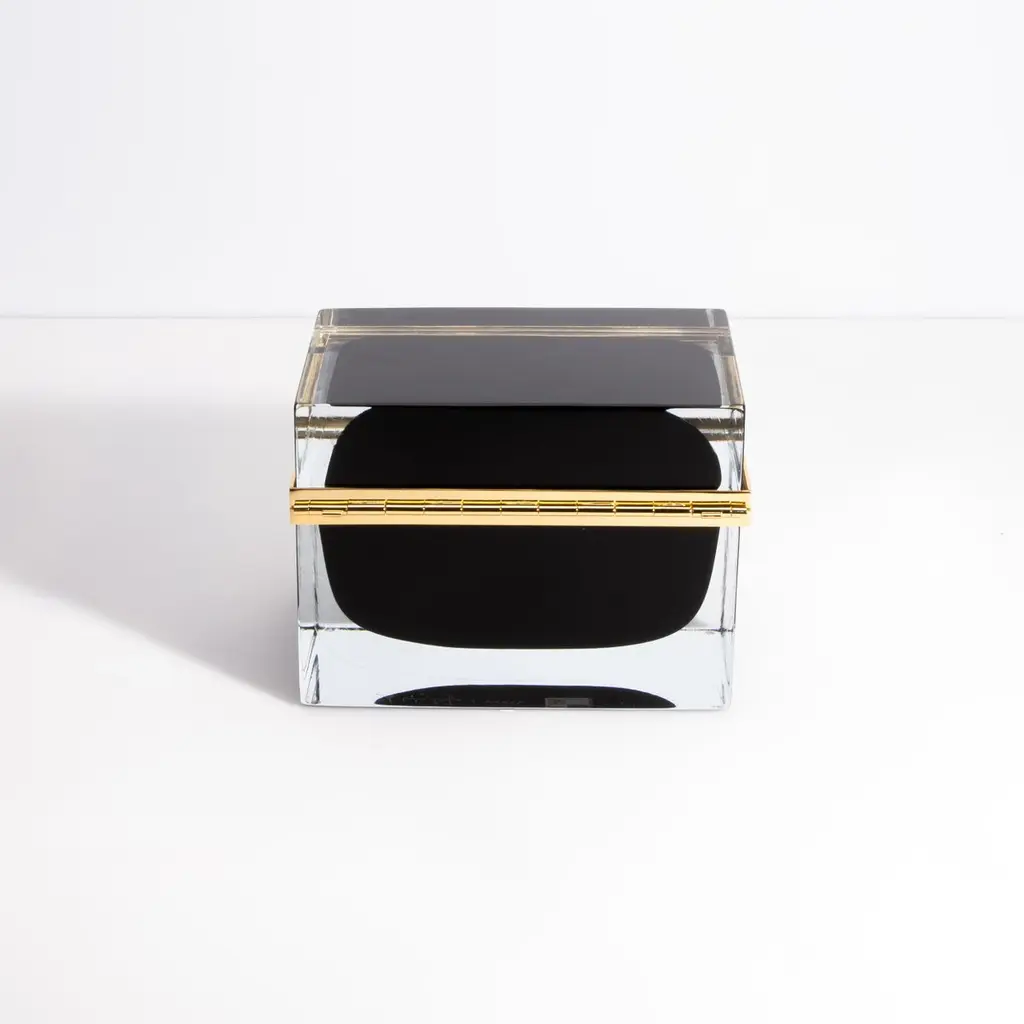 Discover the epitome of elegance with this exquisite Murano glass box, meticulously crafted in Murano, Italy. Available in both large and giant sizes, this box exudes sophistication with its pristine condition, ensuring it is brand new and flawless. The exterior is a captivating clear crystal that seamlessly transitions into the sleek onyx black glass interior. This unique combination creates a dynamic visual effect that captures and plays with light beautifully, making it a true statement piece for any luxury setting.The interior of this magnificent box is lined with rich onyx black, providing a striking contrast to its crystalline exterior. The deep, glossy onyx black finish inside not only enhances its luxurious appeal but also ensures it is as practical as it is beautiful. Perfect for storing cherished items, this box combines function with opulent design, making it a versatile addition to any upscale decor. The seamless blend of clear crystal and onyx black glass showcases the meticulous craftsmanship involved in its creation.Accentuating its luxurious design, this box features elegant brass fittings that add a warm, sophisticated touch to its timeless elegance. The brass elements provide a perfect contrast to the clear crystal and the deep onyx black interior, highlighting the modern sophistication and attention to detail that Murano is renowned for. Crafted in Murano, Italy, this box stands as a testament to superior craftsmanship and luxurious design. Whether displayed prominently on a mantel or used as an elegant storage solution, this box is sure to impress and elevate any space with its timeless beauty and refined elegance. All Murano Glass boxes are in excellent condition and signed for MOGUL.