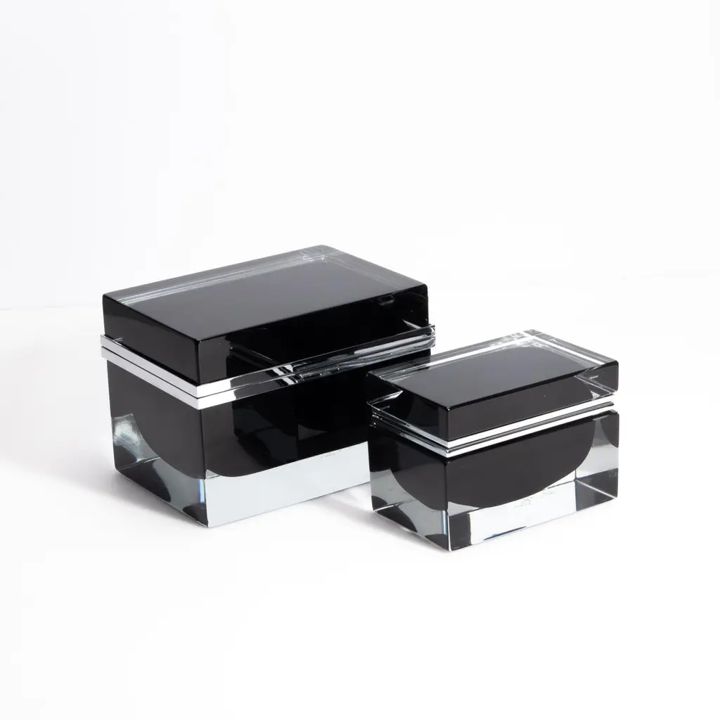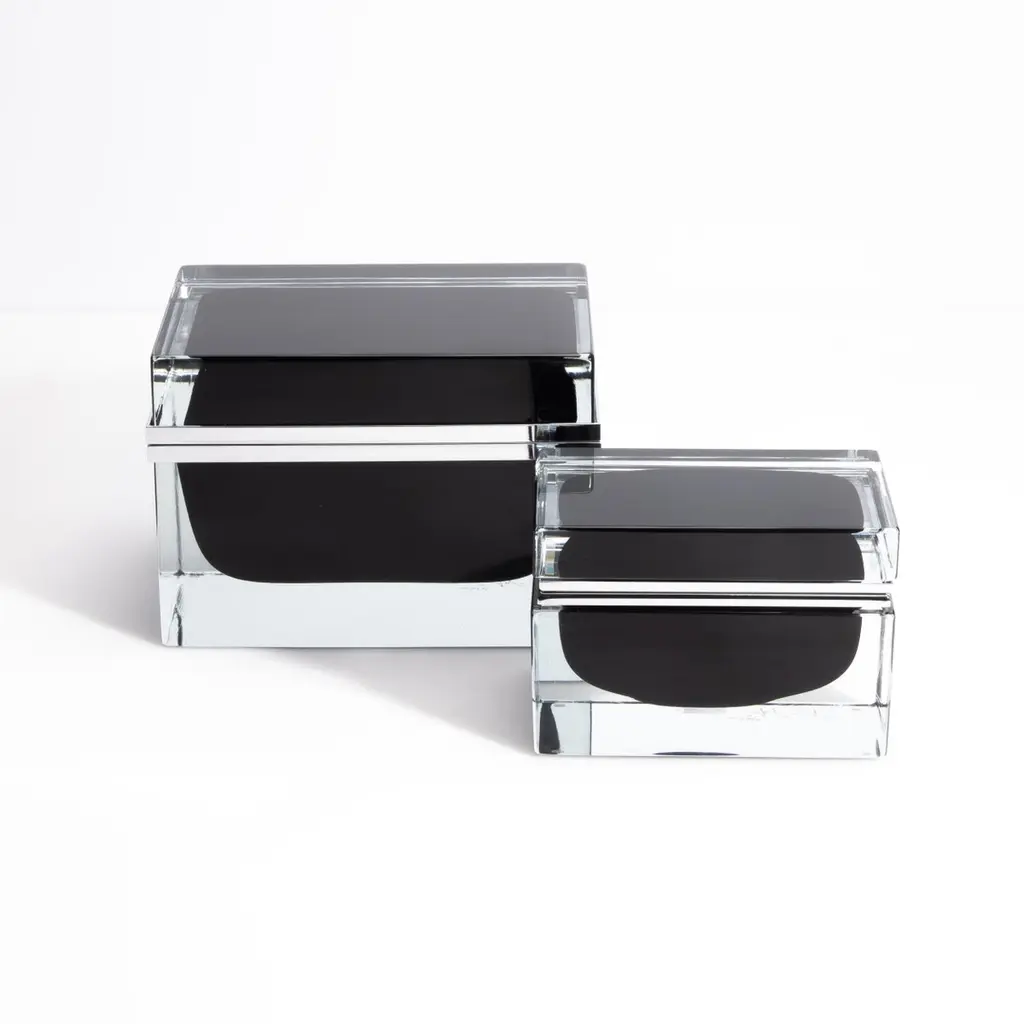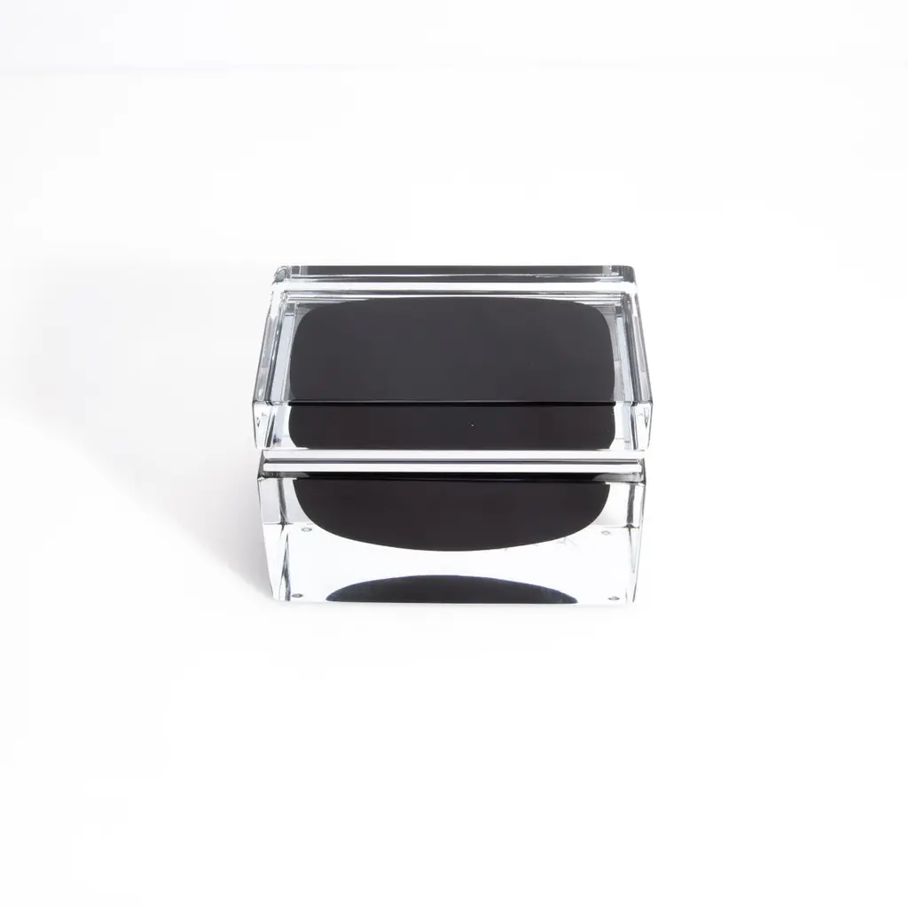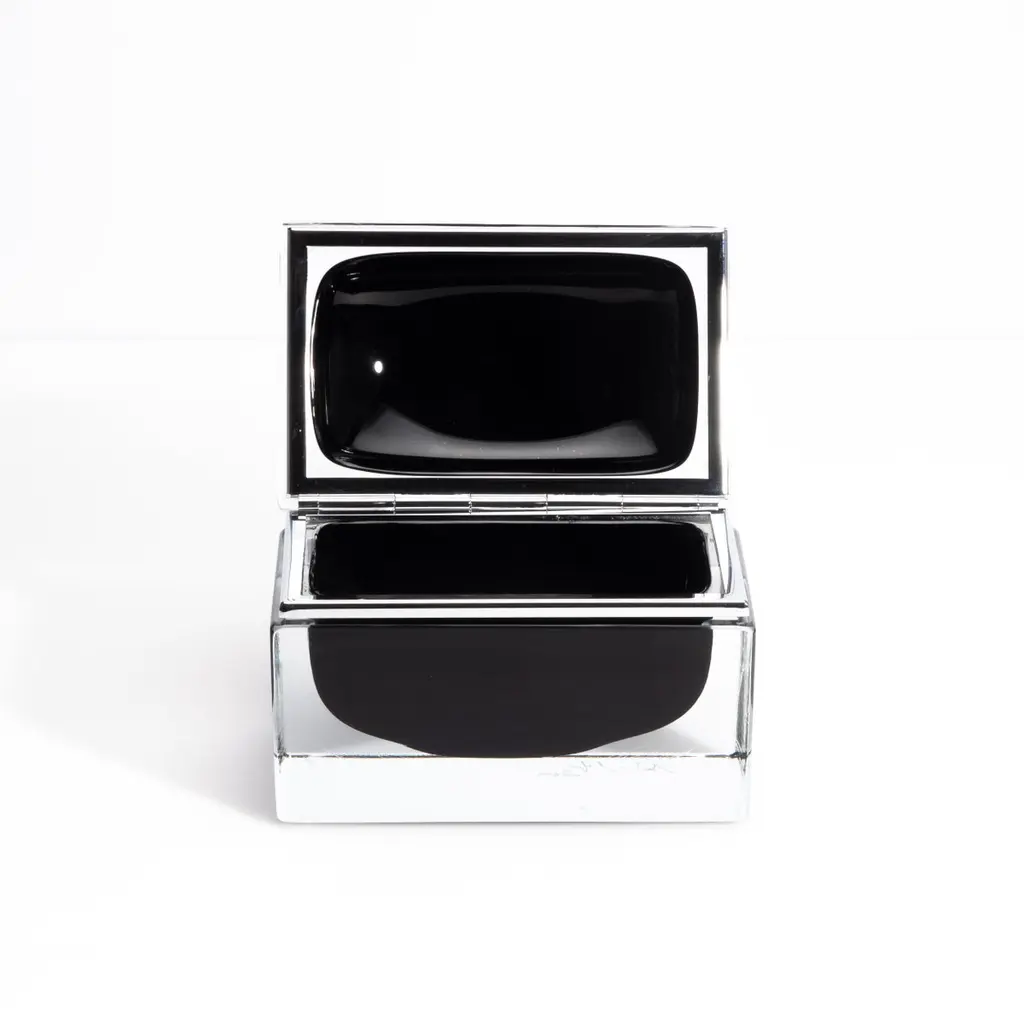 Discover the epitome of elegance with this exquisite Murano glass box, meticulously crafted in Murano, Italy. Available in both large and giant sizes, this box exudes sophistication with its pristine condition, ensuring it is brand new and flawless. The exterior is a captivating clear crystal that seamlessly transitions into the sleek onyx black glass interior. This unique combination creates a dynamic visual effect that captures and plays with light beautifully, making it a true statement piece for any luxury setting.The interior of this magnificent box is lined with rich onyx black, providing a striking contrast to its crystalline exterior. The deep, glossy onyx black finish inside not only enhances its luxurious appeal but also ensures it is as practical as it is beautiful. Perfect for storing cherished items, this box combines function with opulent design, making it a versatile addition to any upscale decor. The seamless blend of clear crystal and onyx black glass showcases the meticulous craftsmanship involved in its creation.Accentuating its luxurious design, this box features sleek chrome fittings that add a contemporary and sophisticated touch to its timeless elegance. The chrome elements provide a perfect contrast to the clear crystal and the deep onyx black interior, highlighting the modern sophistication and attention to detail that Murano is renowned for. Crafted in Murano, Italy, this box stands as a testament to superior craftsmanship and luxurious design. Whether displayed prominently on a mantel or used as an elegant storage solution, this box is sure to impress and elevate any space with its timeless beauty and refined elegance.All Murano Glass boxes are in excellent condition and signed for MOGUL.Reference Number: G320055