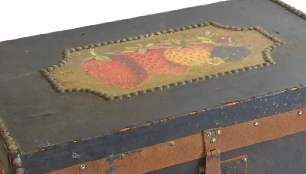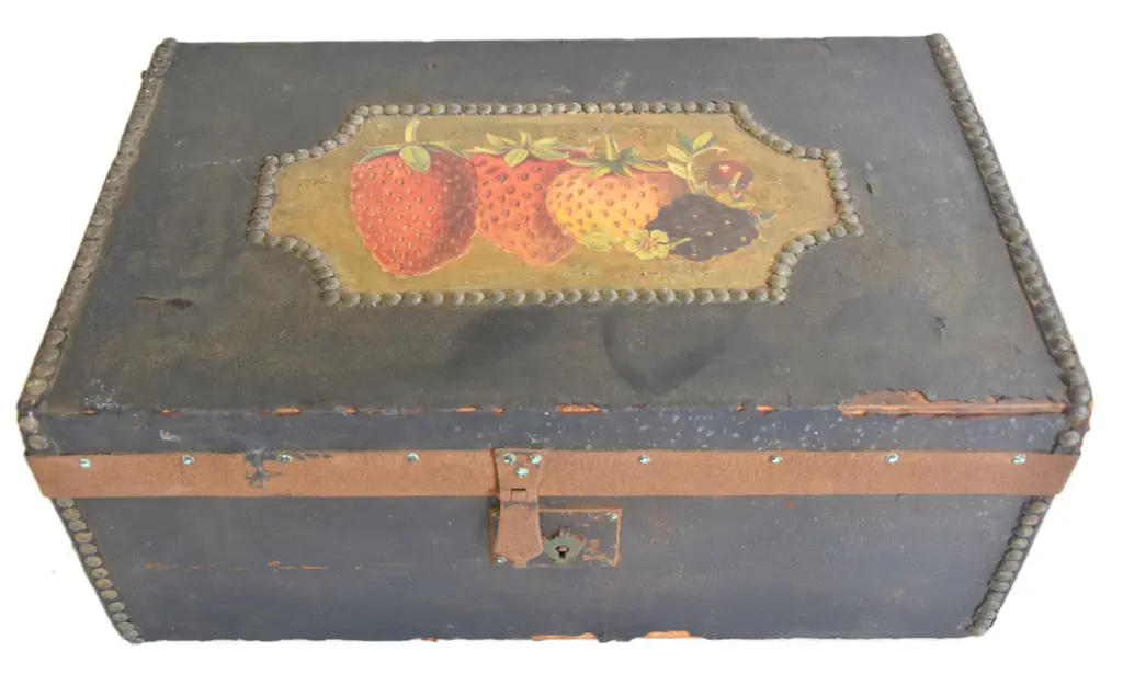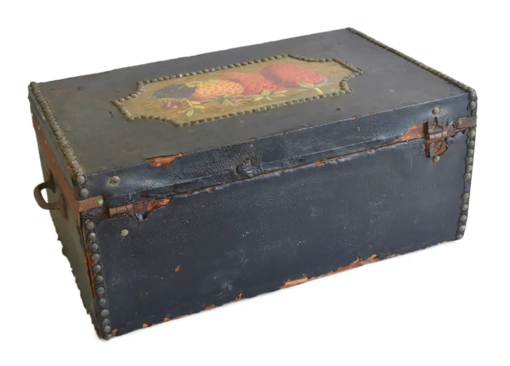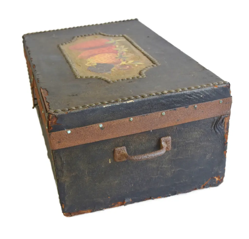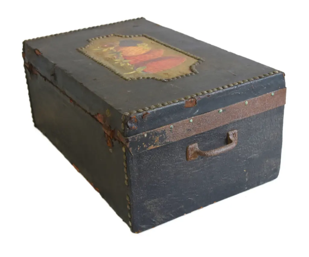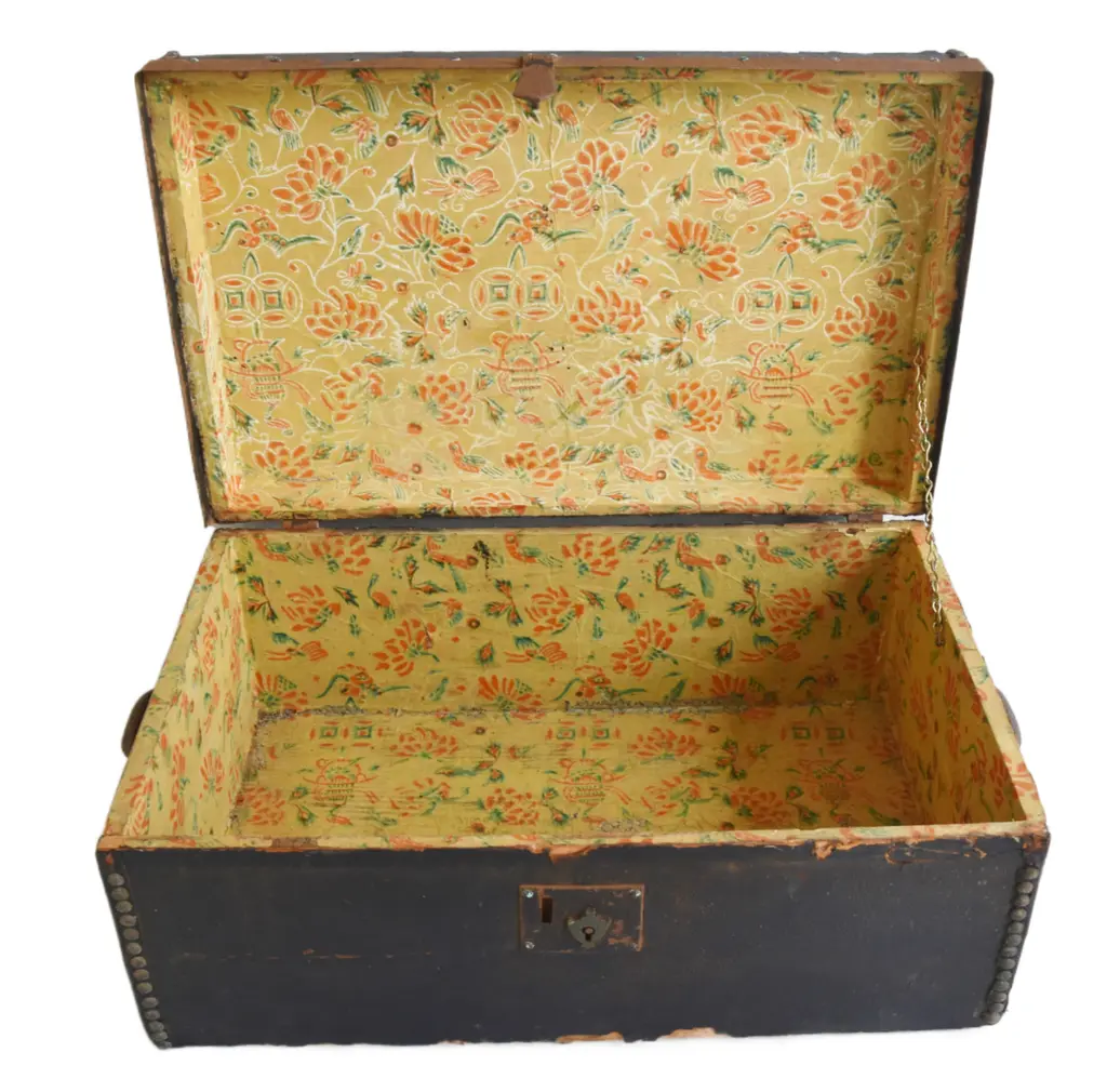Antique hand-made and nail-tack leather-clad decorated box. No key, lock does not work. No maker's mark. Very good antique condition, wear consistent with age and use.