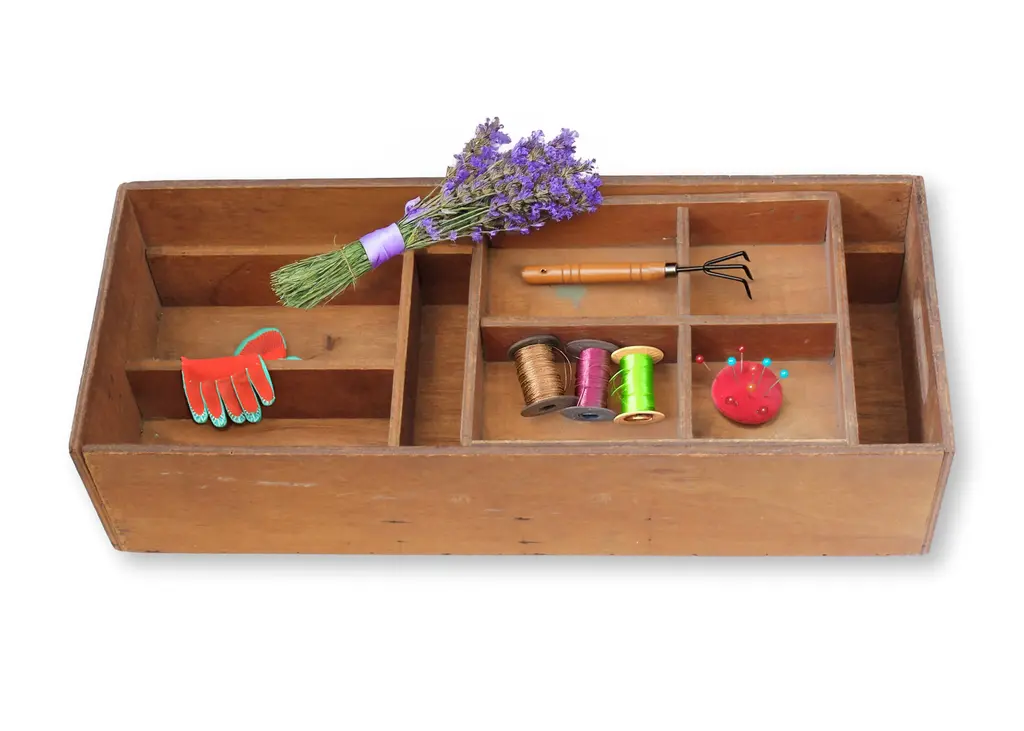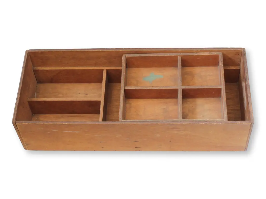 Handmade midcentury wooden storage box with removable interior tray. Thoughtfully divided for organizing tools, hardware, or craft supplies. Cutout handles make it easy to carry from project to project. A functional piece with warm patina and vintage charm�������perfect for the workshop, studio, or kitchen.