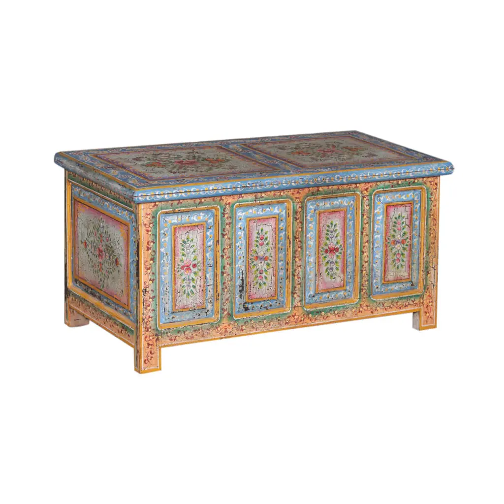 This reclaimed teak wood box features intricate floral designs in a variety of vibrant hues. It serves as both a practical and one-of-a-kind addition to your household.