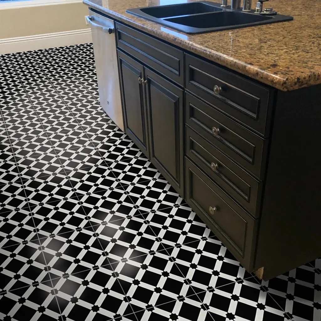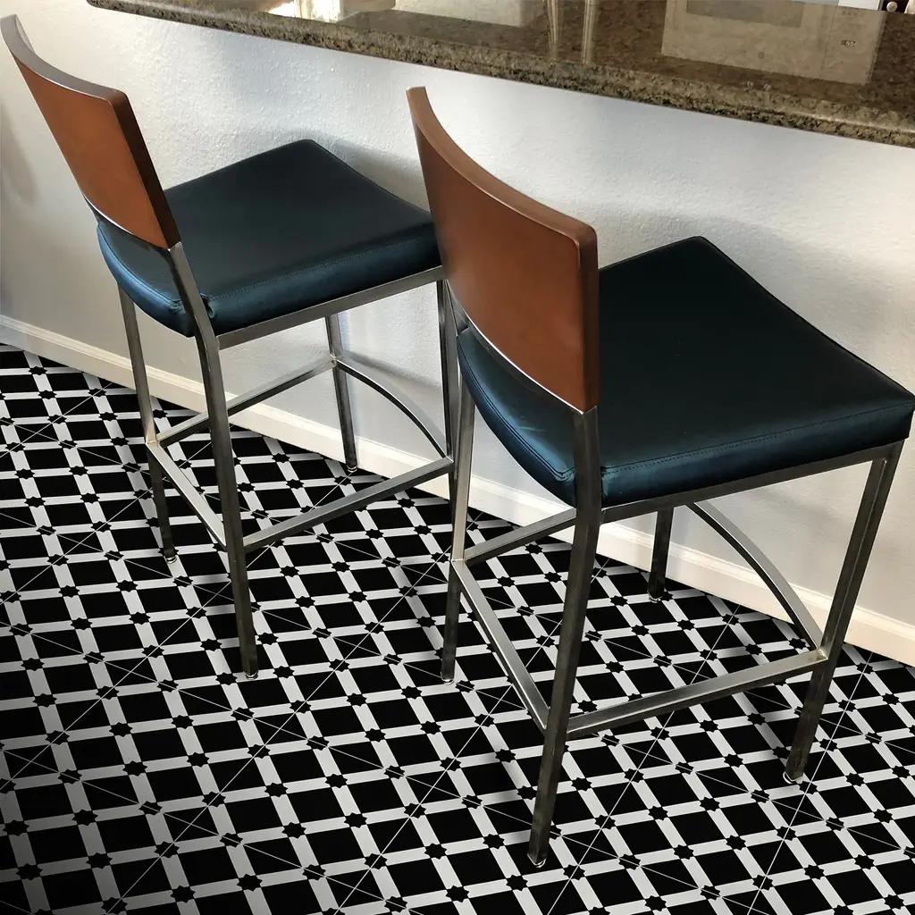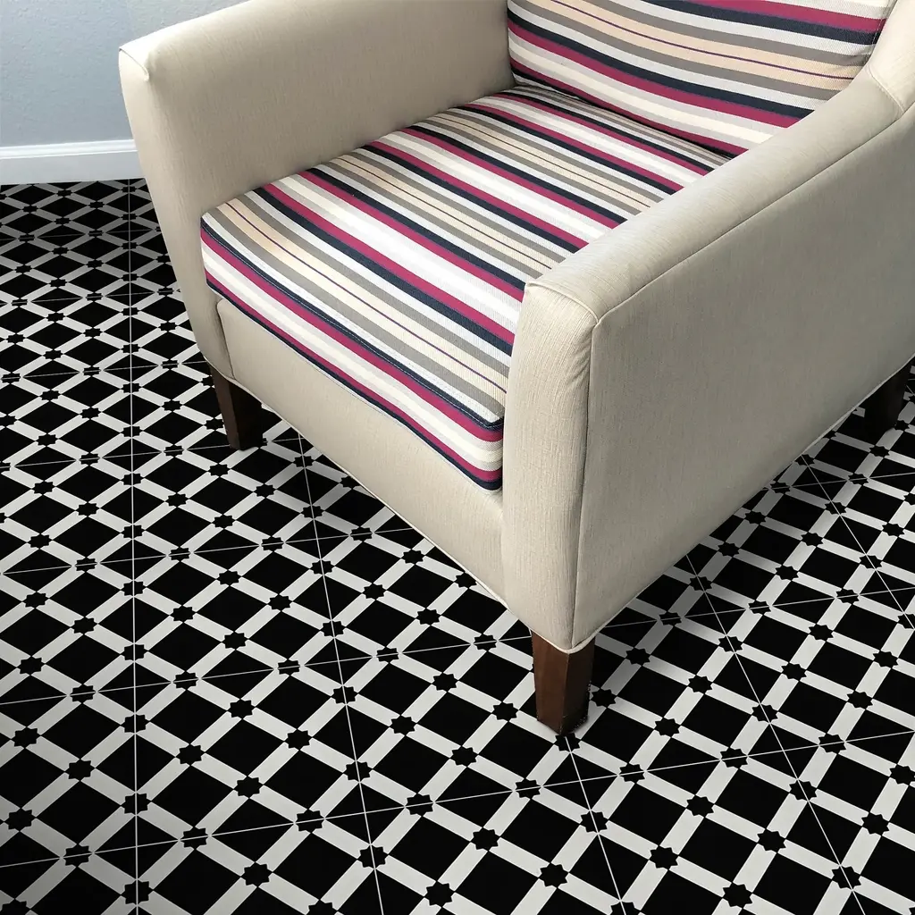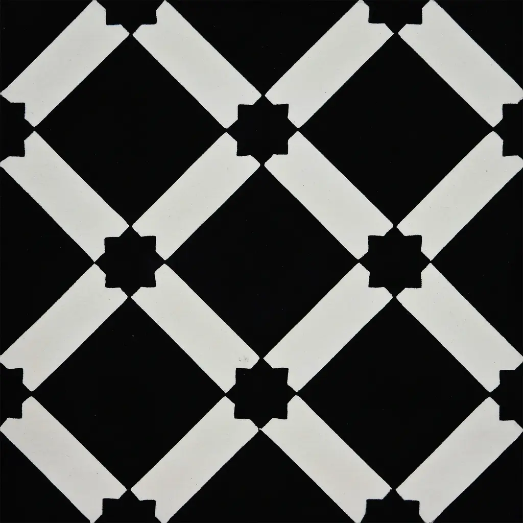 This playful, geometric pattern will work well in both contemporary and traditional environments and can be enjoyed both indoors and outdoors for many years. Made of cement and granite, the black and white pattern of these tiles will add vibrancy and liveliness to your home. Pack of 12 tiles when ordering a box (8x8), Sample is 1 tile only, maximum of 4 samplesFeatures:· Handmade in Morocco· Decorative floor and wall tiles· Made of cement materials· Professional installation is recommended.· Eco-friendly· Indoor or outdoor use· Geometric pattern· 12 tiles per box, covering 5.22 square feet.· 2.3 tiles per square foot· Each tile measures 8 inches wide x 8 inches longStory Behind the Art: "It's more than tile, it's art." That simple statement is what sets the craftsmanship of Moroccan Mosaic apart from the rest. Based in the small city of Sale, Moroccan Mosaic is a family business going back 4 generations. When Simo, the current head of the business graduated from university in New York, he had little interest in the family business. But on a return trip home, he saw that the business was not doing well and set about reviving it. One important change he made was introducing black, grey, and white designs to appeal to American and European customers. It worked. When he started, they employed 2 workers and now they have nearly 80 on staff. The workshop itself is fairly simple, and the techniques used to create the tiles are steeped in tradition. Some modern equipment is available, though the workers prefer to use the more rustic tools. The creative process is time intensive and done by hand, as Simo insists on no corners be cut or production be rushed. Environmentally responsible and resource efficient, no chemicals are used at any step. For example, colors used come from nature literally. Green comes from mint leaves, orange from orange peel, and black from charcoal. The tiles themselves are a simple mixture of cement, sand, and granite powder. Moroccan Mosaic hires only local workers, teaching them a valued skill as well as paying them fair wages. Simo's goals for his business are to share the tradition of gorgeous Moroccan tile, grow the business, and employ more and more workers. The handcrafted touch of artisan skill will create variations in color, size and design. Color differences may occur between the actual product and your computer screen. If buying two of the same item, slight differences will occur from piece to piece. Imported Please note: Orders over 180-pounds or in 7 or more boxes will be shipped via Freight carrier and our Oversized Item Delivery/policy will apply. Please click here for more information. Please be aware that if you order more than 151 pounds of tile or flooring, the order may need to be shipped Freight and our Oversized Item Delivery/Return policy will apply. Please click here for more information.