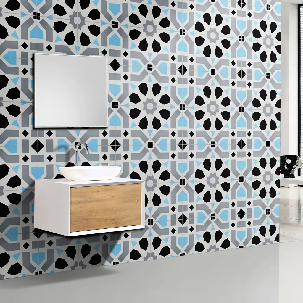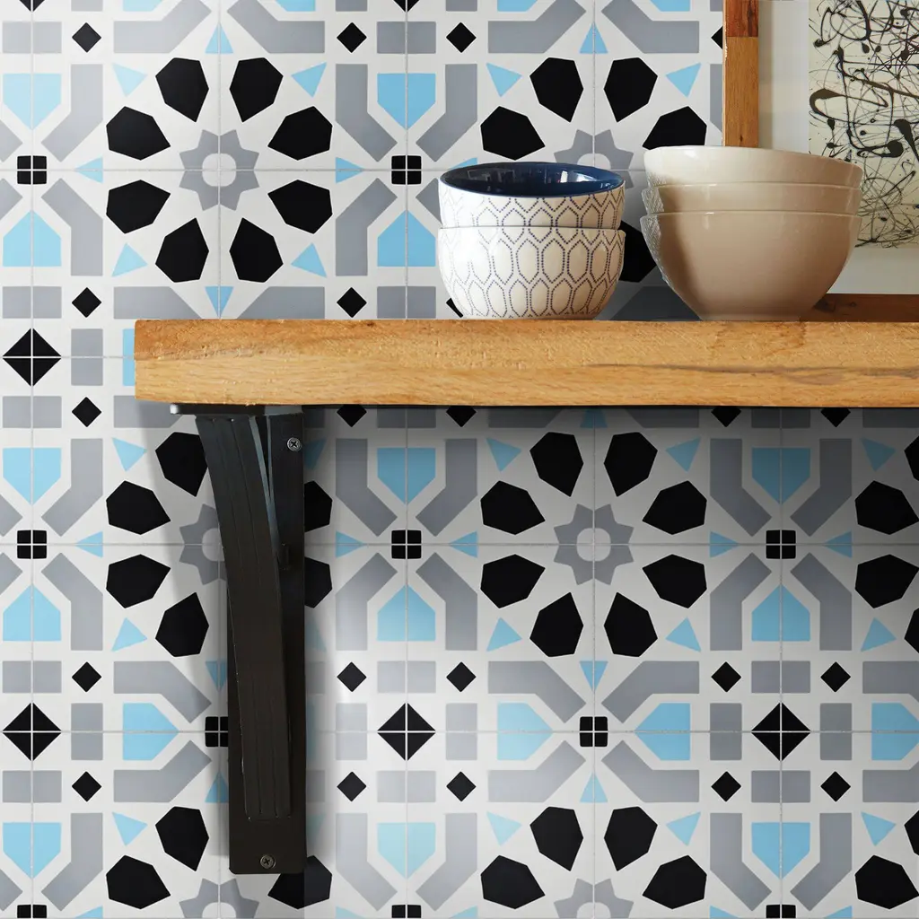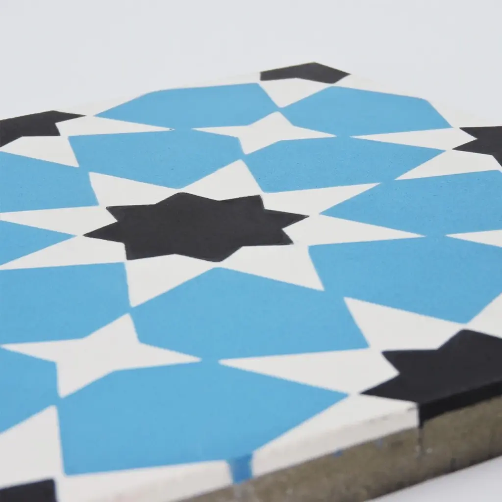 Spruce up the look of your home or patio with this pack of twelve Azilal Moroccan tiles. Handmade by master craftsmen in Morocco, these tiles can be placed on your floor or walls inside or outside your home. These tiles feature an intricate interlocking geometric pattern that becomes even better the more tiles you add to it. Features:Story Behind the Art:"It's more than tile, it's art." That simple statement is what sets the craftsmanship of Moroccan Mosaic apart from the rest. Based in the small city of Sale, Moroccan Mosaic is a family business going back 4 generations. When Simo, the current head of the business graduated from university in New York, he had little interest in the family business. But on a return trip home, he saw that the business was not doing well and set about reviving it. One important change he made was introducing black, grey, and white designs to appeal to American and European customers. It worked. When he started, they employed 2 workers and now they have nearly 80 on staff. The workshop itself is fairly simple, and the techniques used to create the tiles are steeped in tradition. Some modern equipment is available, though the workers prefer to use the more rustic tools. The creative process is time intensive and done by hand, as Simo insists on no corners be cut or production be rushed. Environmentally responsible and resource efficient, no chemicals are used at any step. For example, colors used come from nature literally. Green comes from mint leaves, orange from orange peel, and black from charcoal. The tiles themselves are a simple mixture of cement, sand, and granite powder. Moroccan Mosaic hires only local workers, teaching them a valued skill as well as paying them fair wages. Simo's goals for his business are to share the tradition of gorgeous Moroccan tile, grow the business, and employ more and more workers.