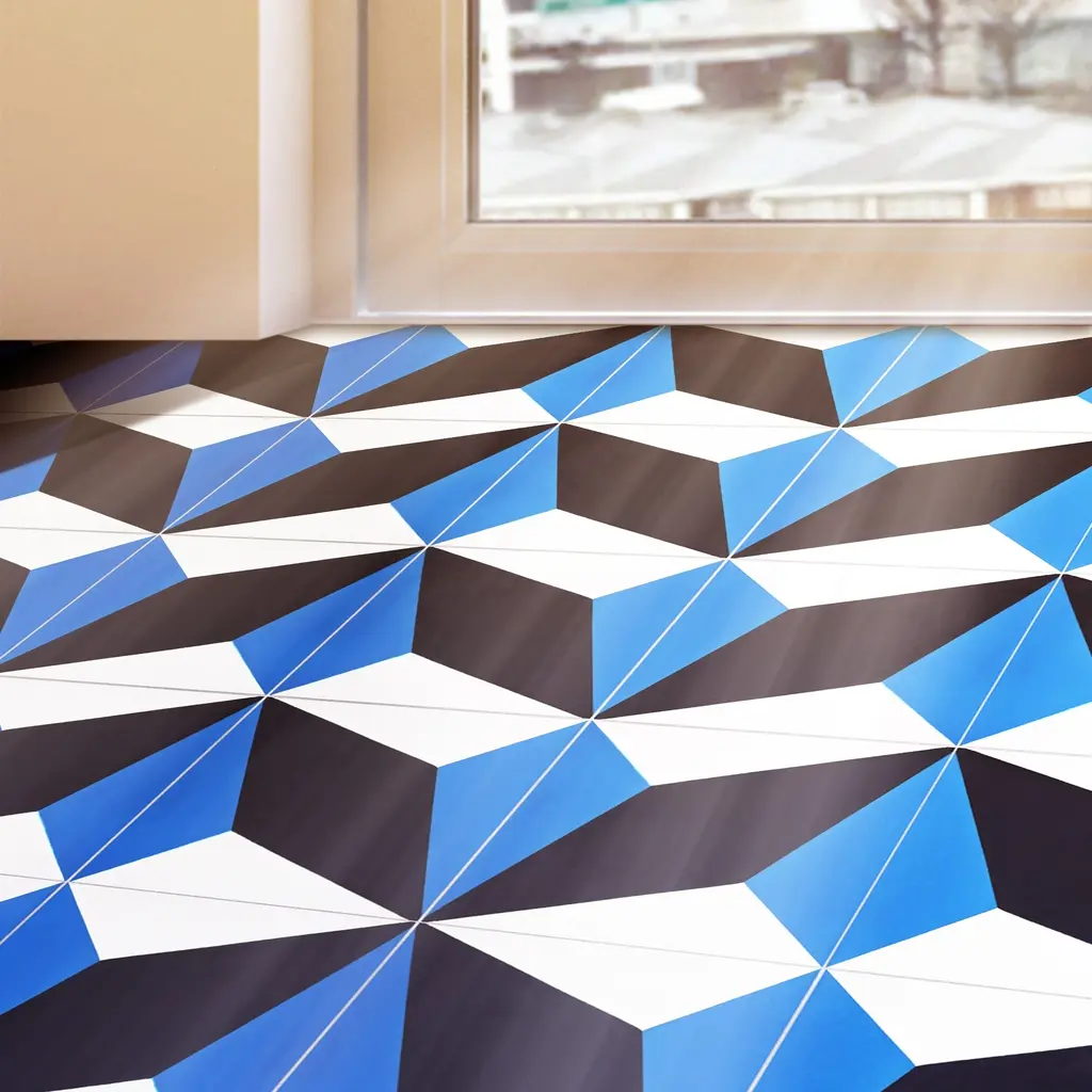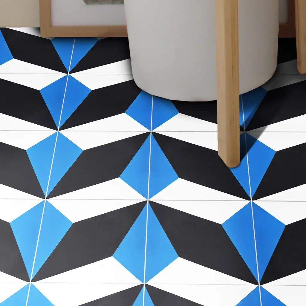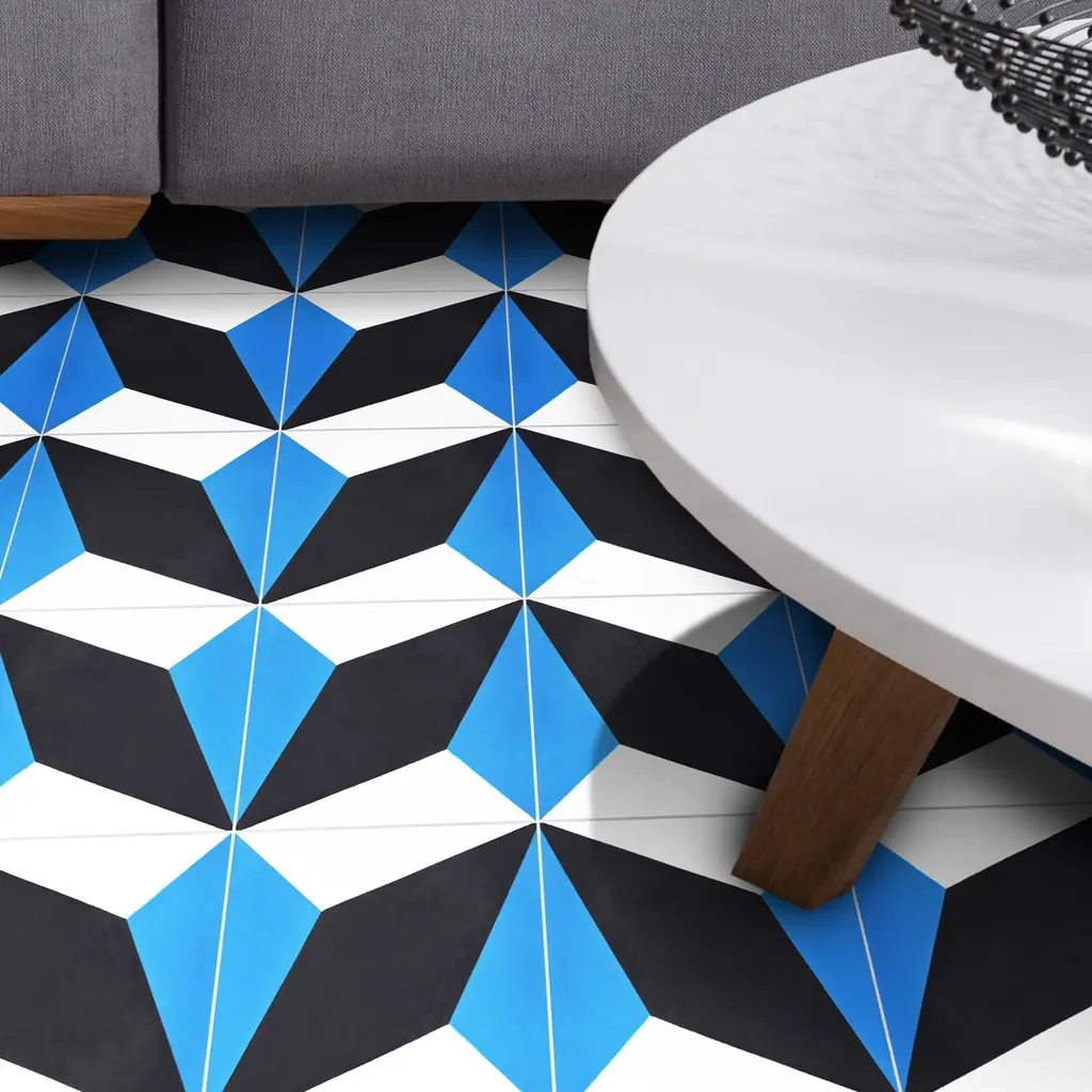 Diamond is a 3-D futuristic cement tile. Its unique and alluring design will attract everyone and will add the perfect illusions to any area in your home. Its black, white, and blue colors add a little modern touch to the futuristic design of the tile. Diamond will look amazing in any room.Features:Story Behind the Art: "It's more than tile, it's art." That simple statement is what sets the craftsmanship of Moroccan Mosaic apart from the rest. Based in the small city of Sale, Moroccan Mosaic is a family business going back 4 generations. When Simo, the current head of the business graduated from university in New York, he had little interest in the family business. But on a return trip home, he saw that the business was not doing well and set about reviving it. One important change he made was introducing black, grey, and white designs to appeal to American and European customers. It worked. When he started, they employed 2 workers and now they have nearly 80 on staff. The workshop itself is fairly simple, and the techniques used to create the tiles are steeped in tradition. Some modern equipment is available, though the workers prefer to use the more rustic tools. The creative process is time intensive and done by hand, as Simo insists on no corners be cut or production be rushed. Environmentally responsible and resource efficient, no chemicals are used at any step. For example, colors used come from nature literally. Green comes from mint leaves, orange from orange peel, and black from charcoal. The tiles themselves are a simple mixture of cement, sand, and granite powder. Moroccan Mosaic hires only local workers, teaching them a valued skill as well as paying them fair wages. Simo's goals for his business are to share the tradition of gorgeous Moroccan tile, grow the business, and employ more and more workers. The handcrafted touch of artisan skill will create variations in color, size and design. Color differences may occur between the actual product and your computer screen. If buying two of the same item, slight differences will occur from piece to piece.