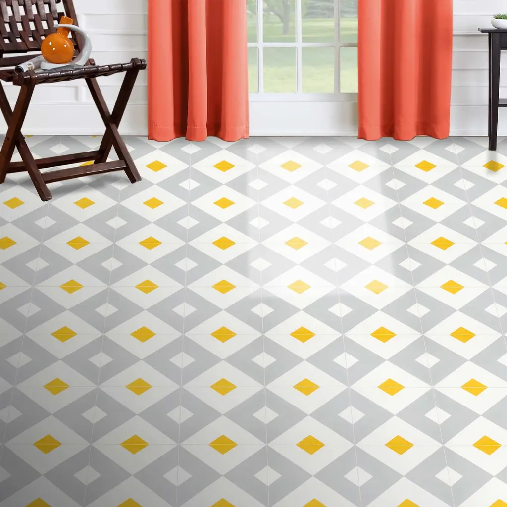 This playful, geometric pattern will work well in both contemporary and traditional environments and can be enjoyed both indoors and outdoors for many years. Made of cement and granite, the pattern of these tiles will add vibrancy and liveliness to your home. Features:Story Behind the Art:"It's more than tile, it's art." That simple statement is what sets the craftsmanship of Moroccan Mosaic apart from the rest. Based in the small city of Sale, Moroccan Mosaic is a family business going back 4 generations. When Simo, the current head of the business graduated from university in New York, he had little interest in the family business. But on a return trip home, he saw that the business was not doing well and set about reviving it. One important change he made was introducing black, grey, and white designs to appeal to American and European customers. It worked. When he started, they employed 2 workers and now they have nearly 80 on staff. The workshop itself is fairly simple, and the techniques used to create the tiles are steeped in tradition. Some modern equipment is available, though the workers prefer to use the more rustic tools. The creative process is time intensive and done by hand, as Simo insists on no corners be cut or production be rushed. Environmentally responsible and resource efficient, no chemicals are used at any step. For example, colors used come from nature literally. Green comes from mint leaves, orange from orange peel, and black from charcoal. The tiles themselves are a simple mixture of cement, sand, and granite powder. Moroccan Mosaic hires only local workers, teaching them a valued skill as well as paying them fair wages. Simo's goals for his business are to share the tradition of gorgeous Moroccan tile, grow the business, and employ more and more workers.