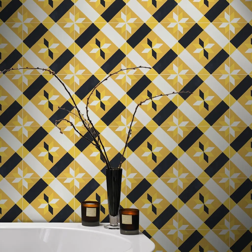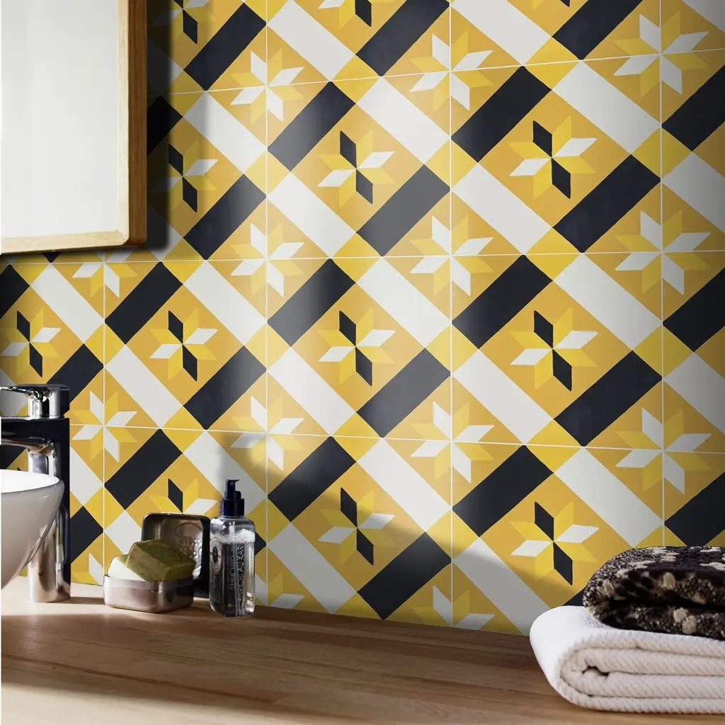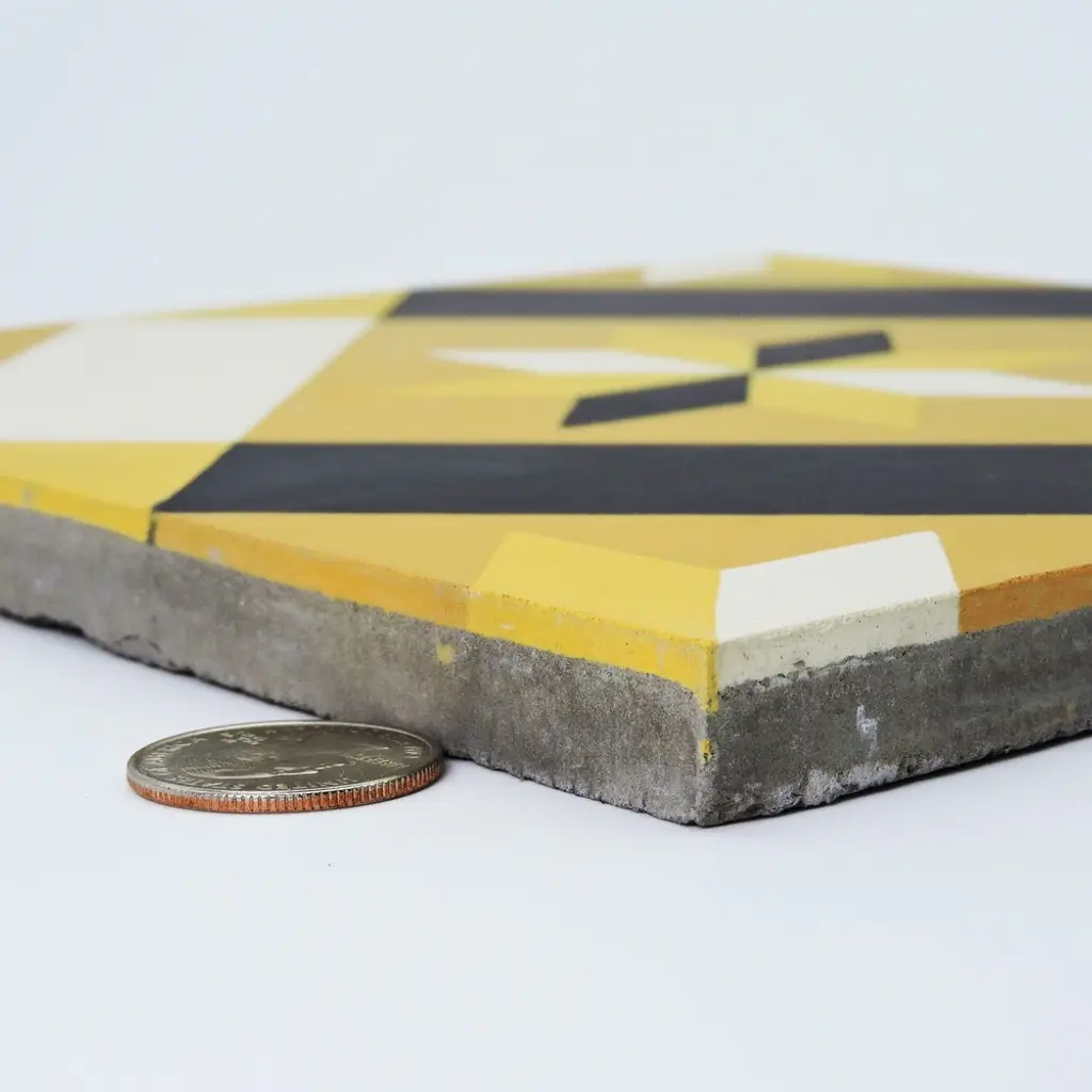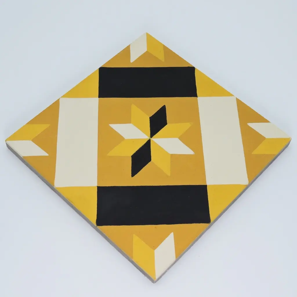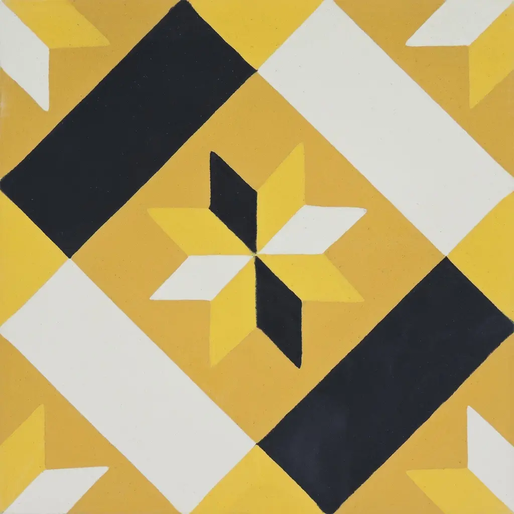 Kotoubia is a conventional cement tile. Its traditional and delicate design will complement any room. Its black, white, and yellow colors add a warm and welcoming appearance. Kotoubia will bring a fresh and elegant feeling to your home.Features:· Handmade in Morocco· Decorative floor and wall tiles· Made of cement materials· Professional installation is recommended.· Tiles need to be sealed before and after grouting.· Eco-friendly· Indoor or outdoor use· Geometric pattern· When ordering a box, 12 tiles come included. Sample is just 1 tile.· 12 tiles per box, covering 5.22 square feet.· 2.3 tiles per square foot· Each tile measures 8 inches wide x 8 inches longStory Behind the Art: "It's more than tile, it's art." That simple statement is what sets the craftsmanship of Moroccan Mosaic apart from the rest. Based in the small city of Sale, Moroccan Mosaic is a family business going back 4 generations. When Simo, the current head of the business graduated from university in New York, he had little interest in the family business. But on a return trip home, he saw that the business was not doing well and set about reviving it. One important change he made was introducing black, grey, and white designs to appeal to American and European customers. It worked. When he started, they employed 2 workers and now they have nearly 80 on staff. The workshop itself is fairly simple, and the techniques used to create the tiles are steeped in tradition. Some modern equipment is available, though the workers prefer to use the more rustic tools. The creative process is time intensive and done by hand, as Simo insists on no corners be cut or production be rushed. Environmentally responsible and resource efficient, no chemicals are used at any step. For example, colors used come from nature literally. Green comes from mint leaves, orange from orange peel, and black from charcoal. The tiles themselves are a simple mixture of cement, sand, and granite powder. Moroccan Mosaic hires only local workers, teaching them a valued skill as well as paying them fair wages. Simo's goals for his business are to share the tradition of gorgeous Moroccan tile, grow the business, and employ more and more workers.