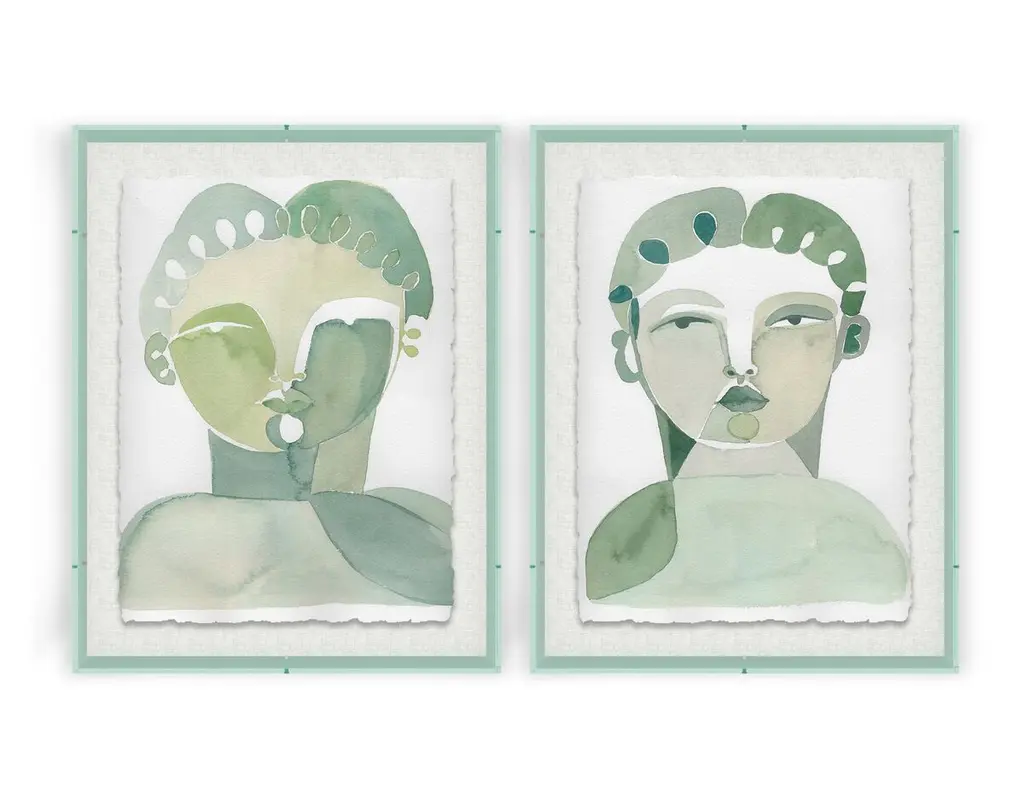 Seen first at One Kings Lane: Defined by its cool coloration and clever use of negative space, this diptych from Hayley Mitchell is rendered on high-quality watercolor paper and set under Plexiglas in acrylic shadowbox frames. Arrives ready to hang.Inspired by powerful woman from all walks of life, Hayley Mitchell portrays their strength and beauty with unique, bold brushstrokes, cubist faces, and nude figures. A native Texan, Hayley currently resides in Austin with her four small children.