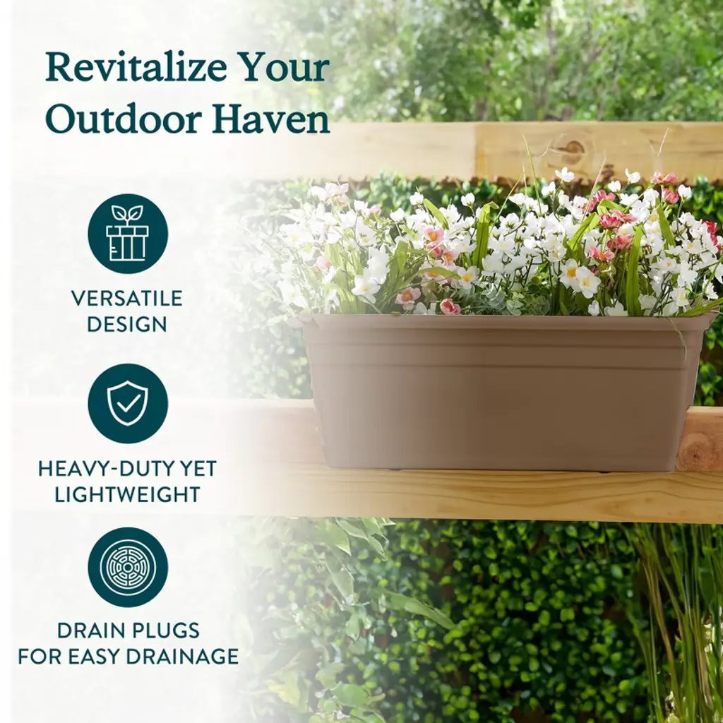 Decorate the exterior of your home and bring your front/backyard to life with the help of the HC Companies SPX24DB0E2112-Inch Outdoor Durable Plastic Deck Planter Box. Perfect for succulents, vegetable plants, and anything in between, this portable plastic planter is excellent for any outdoor setting. It measures 12 inches long and is rectangular, making it an ideal candidate for the patio, porch deck, or balcony. It's designed with a classic look too, meaning it enhances formal/informal planting opportunities. The rich natural colors will also allow them to fit into any setting. What really makes this planter unique is that it fits two different sizes of deck rails. It's perfect for 2 x 4-inch or 2 x 6-inch rails. Upgrade the exterior of your home and interject some life into your surroundings by using this accent planter box from HC Companies.