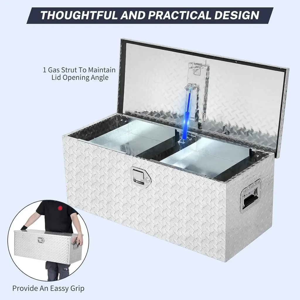 This truck toolbox is constructed with high-density aluminum and a non-slip surface while being highly resistant to oxidation, ensuring it maintains an attractive appearance and stable performance in harsh environments over time. Overall size: 35.4 "X15.2 "X14.2" This spacious truck bed tool box providing plenty of room for buckets, maintenance tools, fire extinguishing canisters, warning signs, and other items in your truck. It's versatile and can be used in pickups, trucks, trailers, RVs, and even at home. Features wider carrying handles on both sides, making the tool box easy to grip even with gloves on. Moreover, it comes with an easy-to-open-and-close gas strutted notched lid to assist with opening and closing, hold the lid in place and allow for a soft close. The toolbox features a wide range of applications such as being used for pickup trucks, trailers, RVs, and warehouses; Improve your storage game with this toolbox. A stainless steel lock keeps your tools and supplies secure, protecting against theft and weather elements. Fully welded seam construction and a weatherproof seal allow this toolbox to protect your items from the rain in all types of harsh weather conditions.