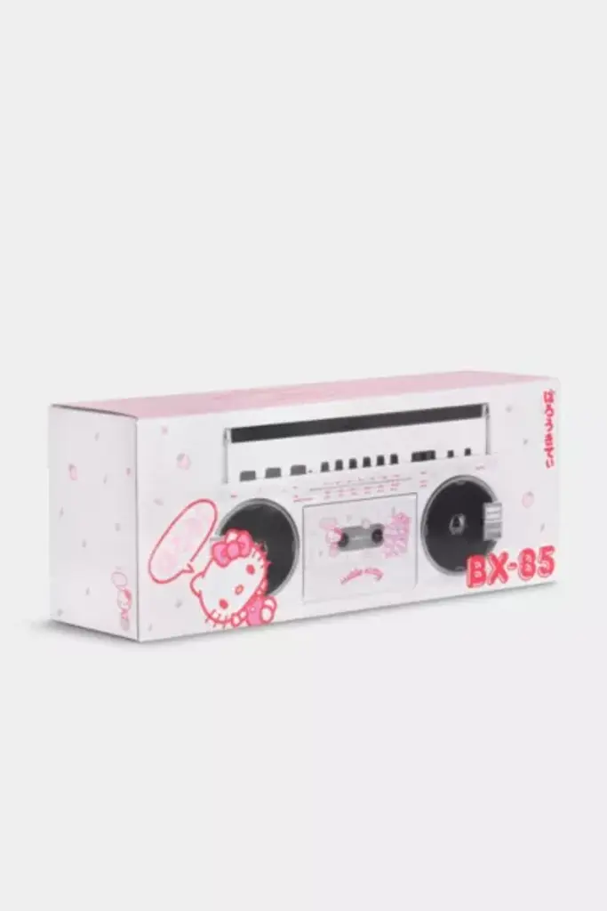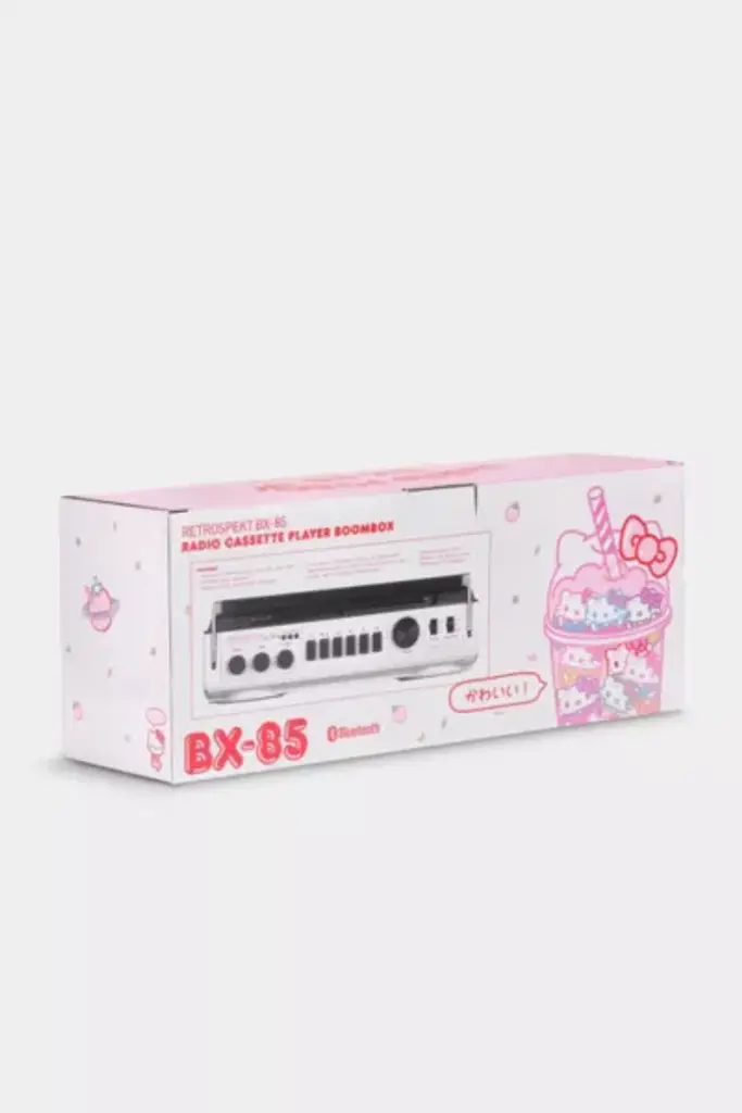 Wrapped in the universally-recognizable elements of Hello Kitty’s most classic aesthetic, this Retrospekt BX-85 cassette player boombox brings the retro boombox experience to a new generation. **Content** \- It features a built-in cassette player and radio while also allowing for external devices to be connected via Bluetooth®. \- The device includes a removable power cord but can also be powered by 4x D batteries (not included) for maximum portability. \- International customers will need to use a step-up converter (not included) or batteries to operate this boombox.