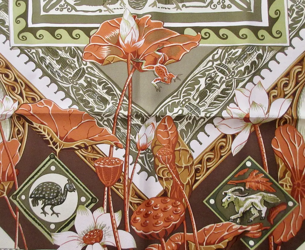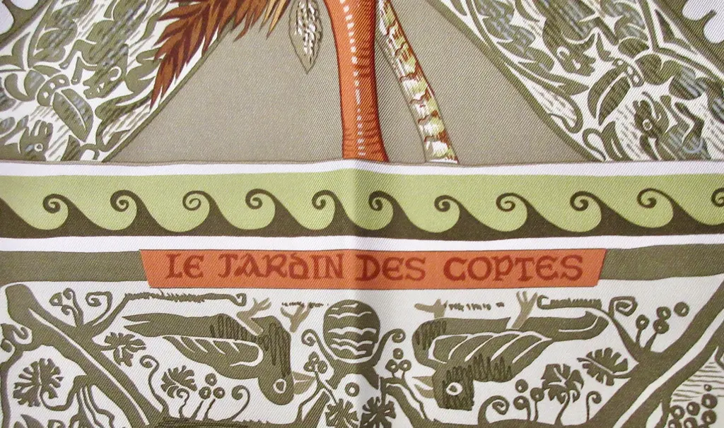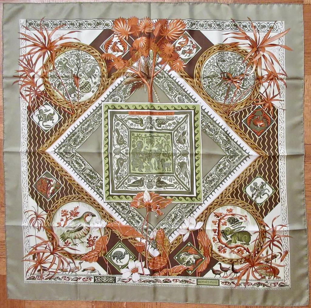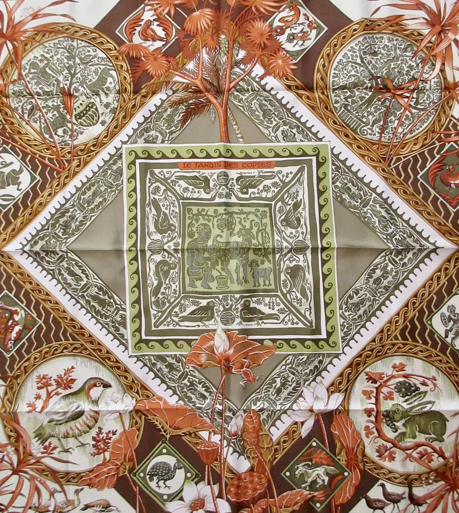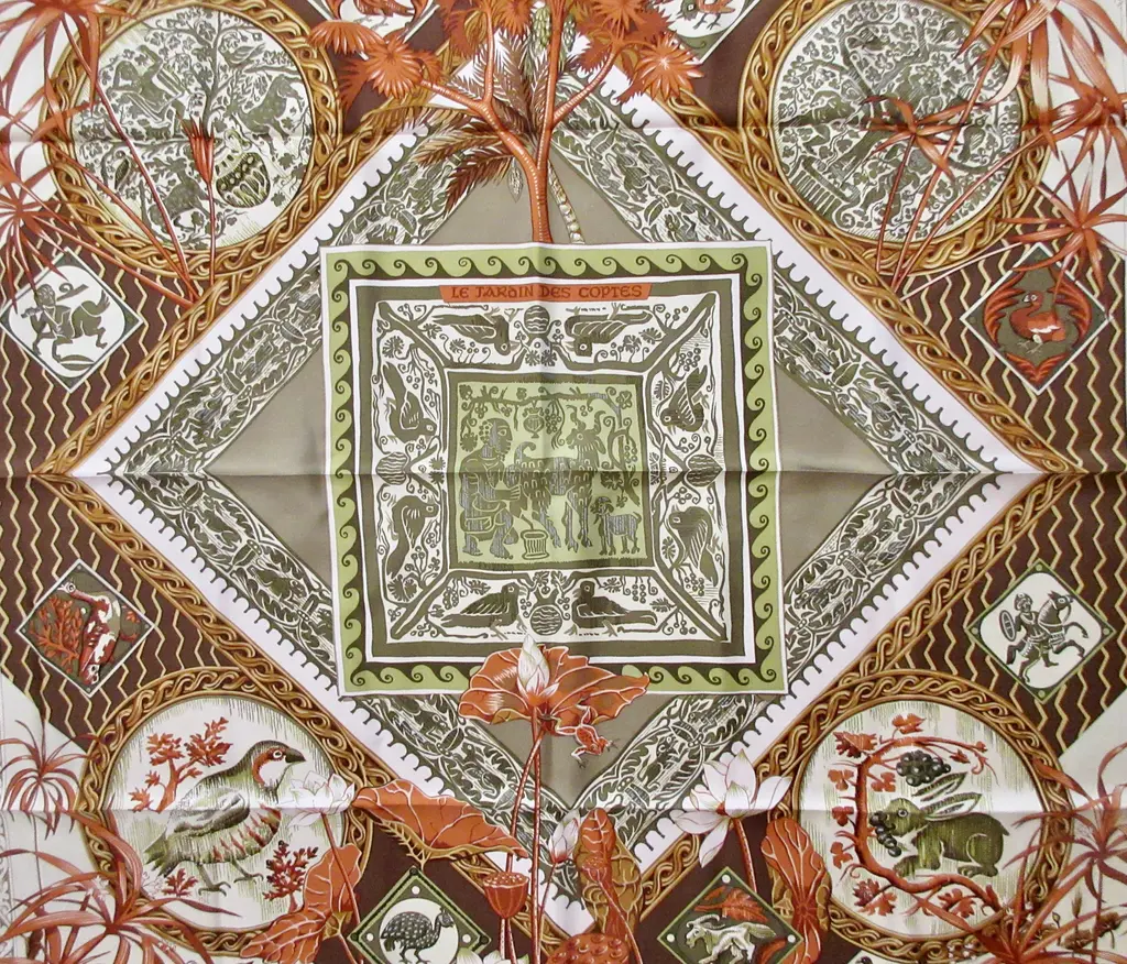 One of the most sought-after Hermès scarf designs, Le Jardin des Coptes boasts the flora and fauna of an ancient civilization. Here it is in an astonishingly beautiful olive and orange colorway. Designed by Laurence Bourthoumieux aka Toutsy in 2004. Care tag attached. Presented in its orange Hermes box.