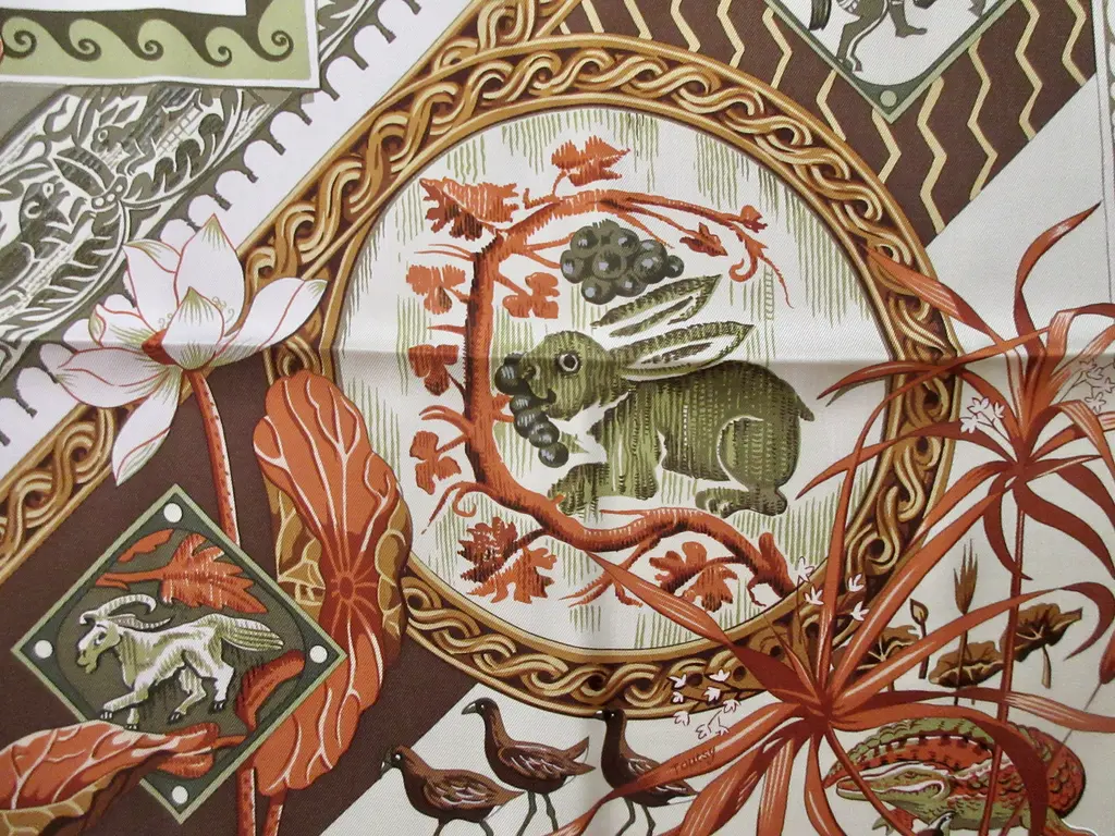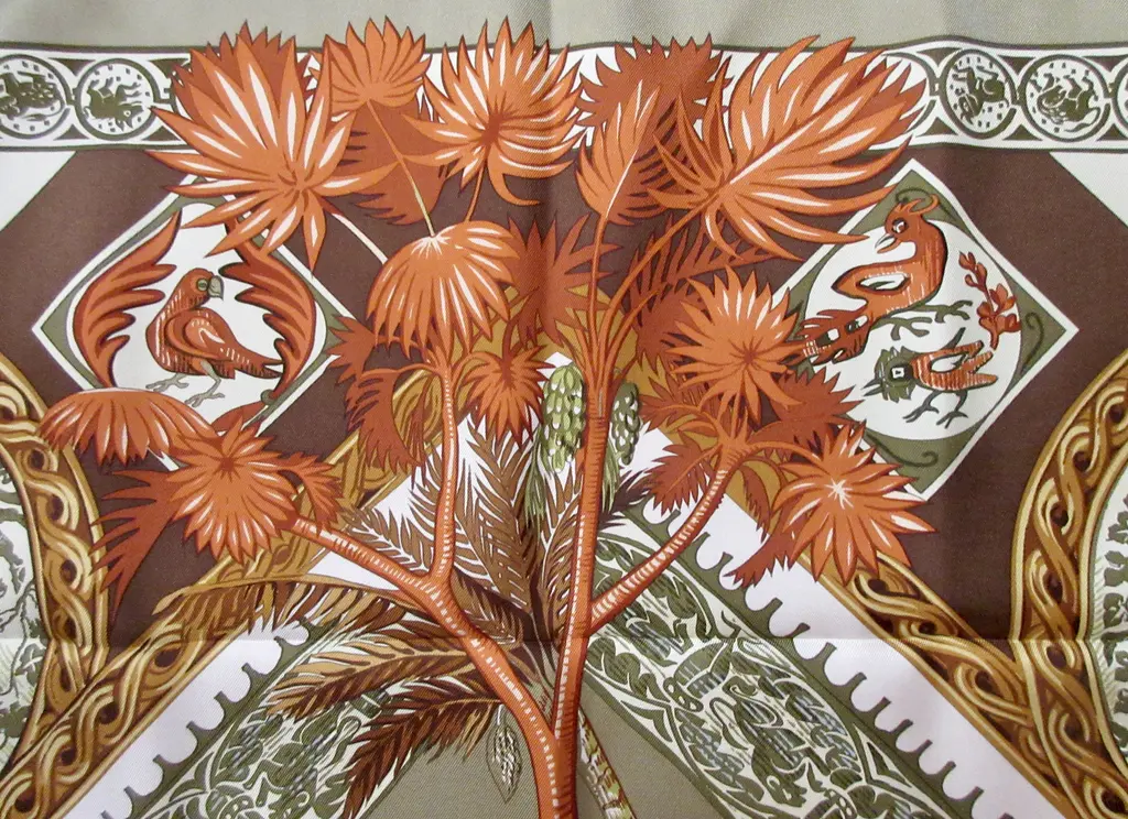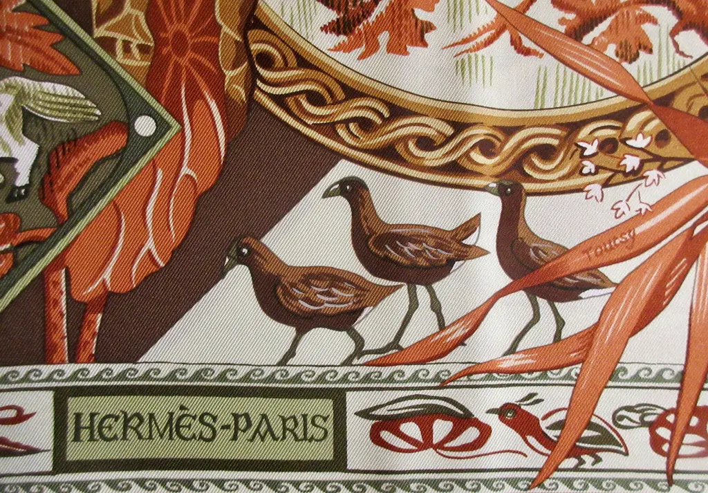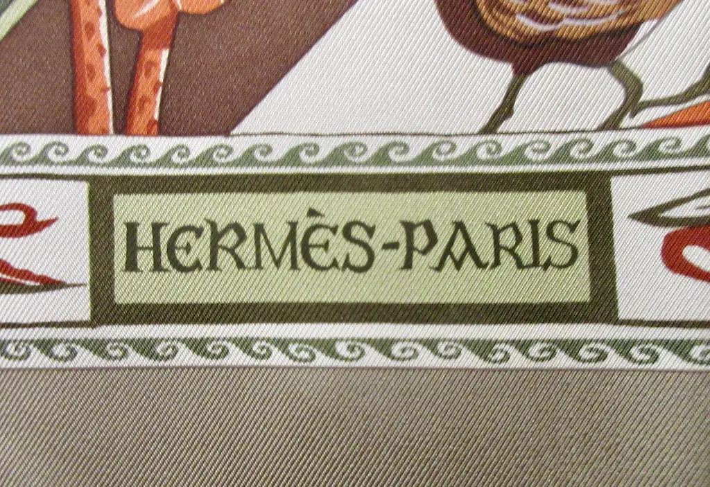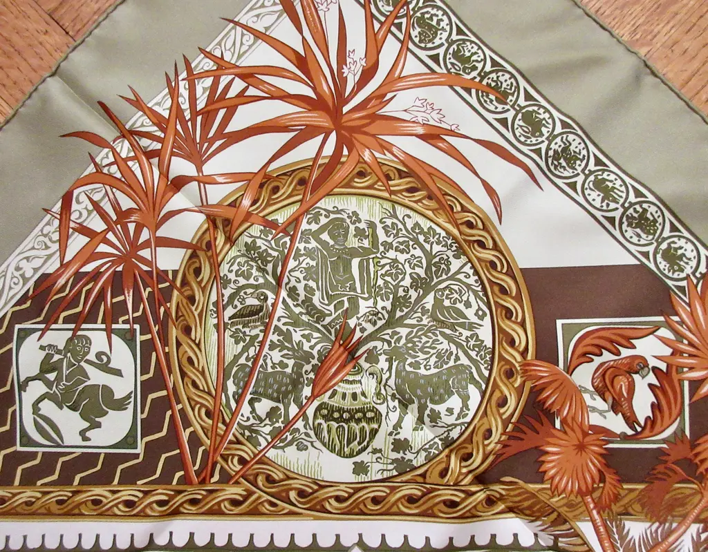 One of the most sought-after Hermès scarf designs, Le Jardin des Coptes boasts the flora and fauna of an ancient civilization. Here it is in an astonishingly beautiful olive and orange colorway. Designed by Laurence Bourthoumieux aka Toutsy in 2004. Care tag attached. Presented in its orange Hermes box.