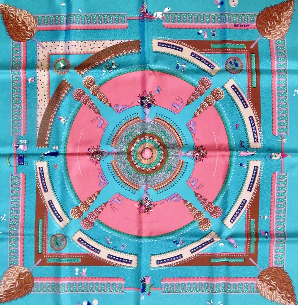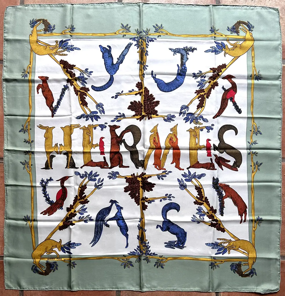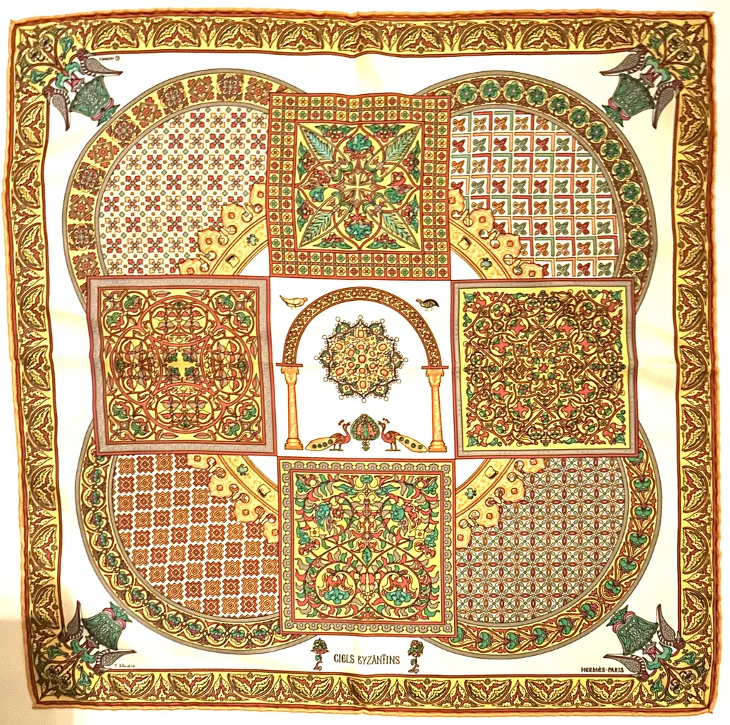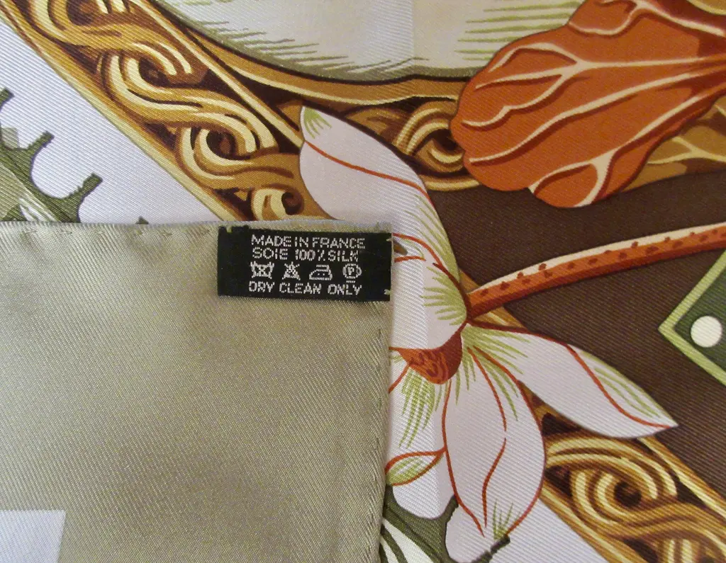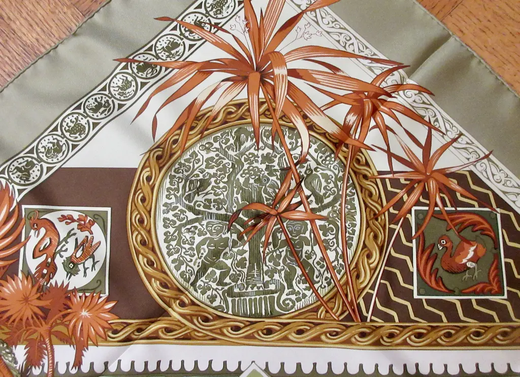 One of the most sought-after Hermès scarf designs, Le Jardin des Coptes boasts the flora and fauna of an ancient civilization. Here it is in an astonishingly beautiful olive and orange colorway. Designed by Laurence Bourthoumieux aka Toutsy in 2004. Care tag attached. Presented in its orange Hermes box.