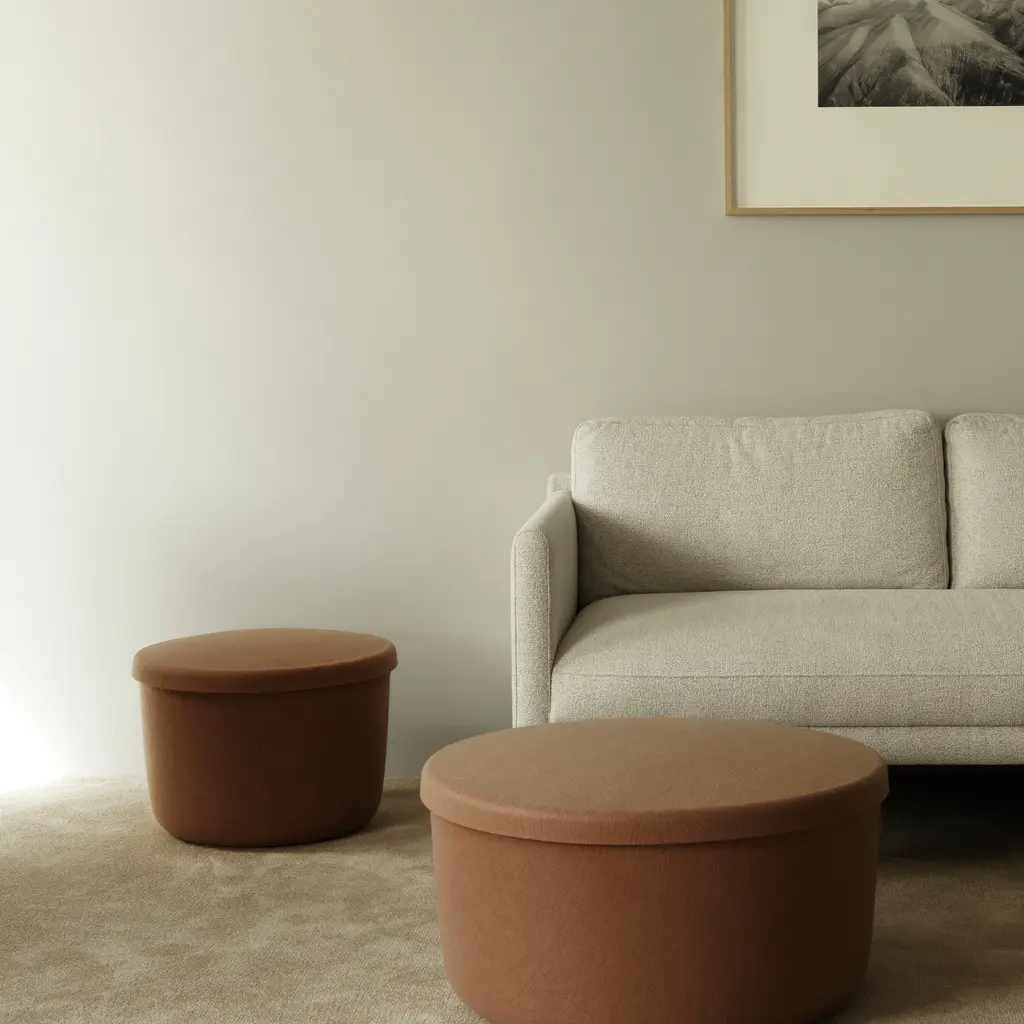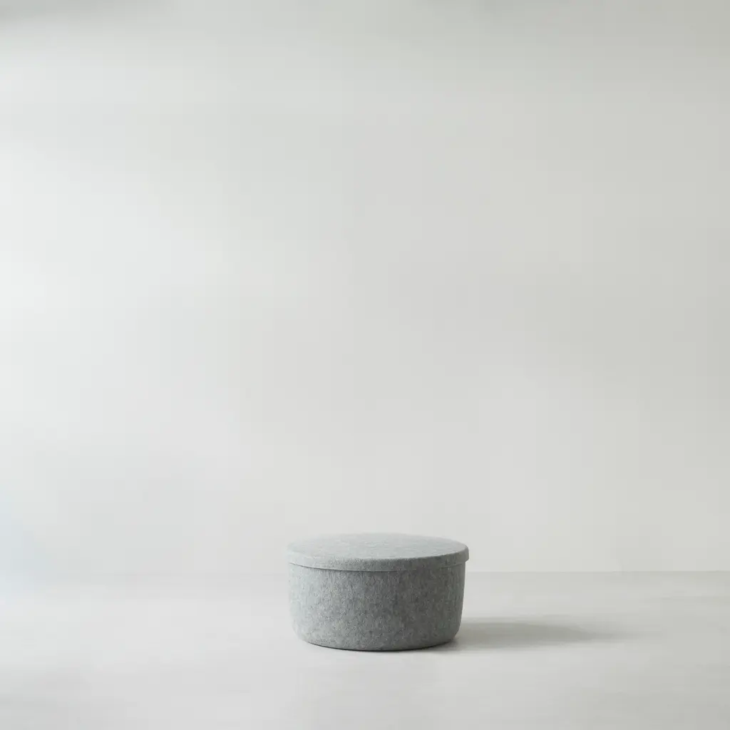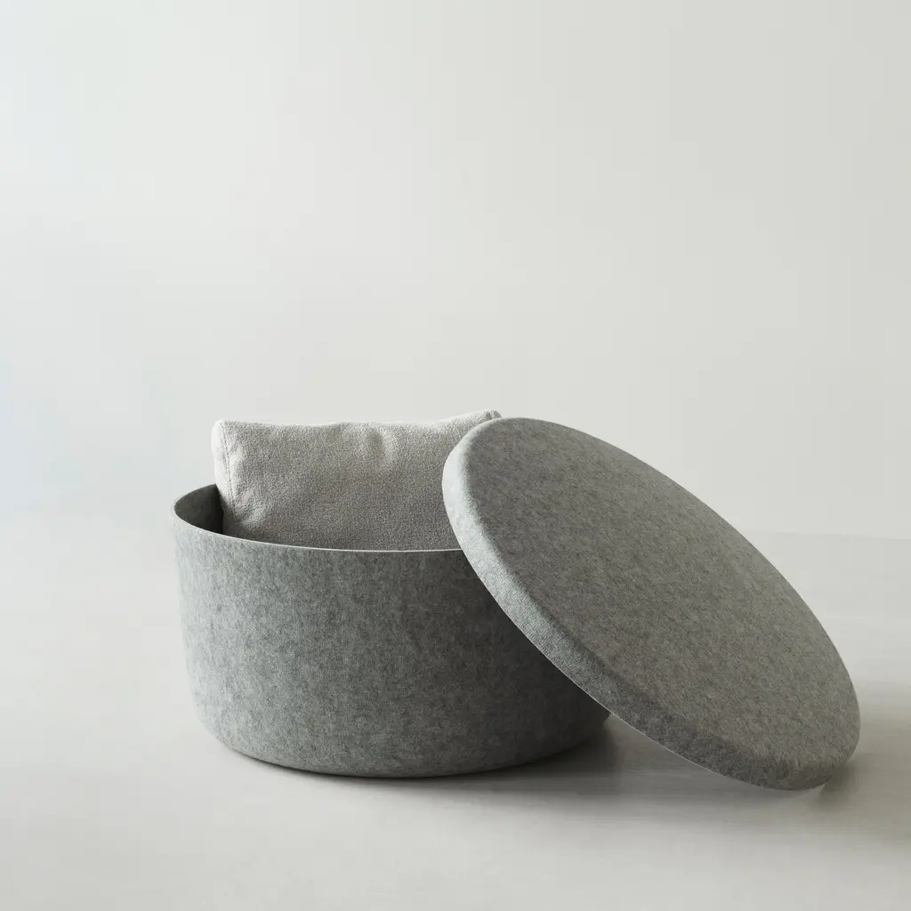 Relax, put up your feet and keep things tidy at the same time with Hide, a multipurpose pouf and storage container. Crafted from PET felt, a remarkable fabric made from recycled post-consumer plastic bottles, the top lid opens to conveniently stash things like toys, blankets and cushions while the unit also doubles as a soft table or additional seating in a pinch.