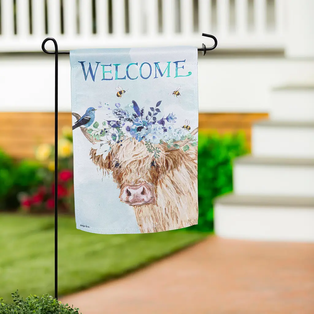 This charming flag adds an extra special touch to any home. It features an adorable highland cow surrounded by flowers design. Each Evergreen applique flag is carefully crafted from multiple layers of 310 denier nylon made from recycled plastic that can withstand a variety of weather conditions. We combine pieces of fade-resistant, strong fabric with tight, detailed stitching to create a dimensional mosaic effect. The soft yet heavyweight material illuminates beautifully in sunlight. Each flag features a sleeve that fits standard flagpoles or stands, sold separately. Due to the nature of the packaging, wrinkling may have occurred. Once item is unfolded and mounted on hardware, the creases will naturally fall out. Spot clean only. Never put in a dryer. When not in use, flags can be hung in a closet or placed in a storage container.