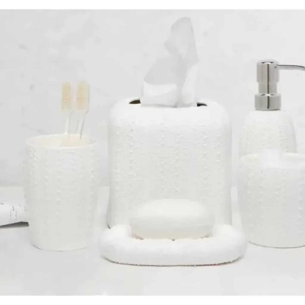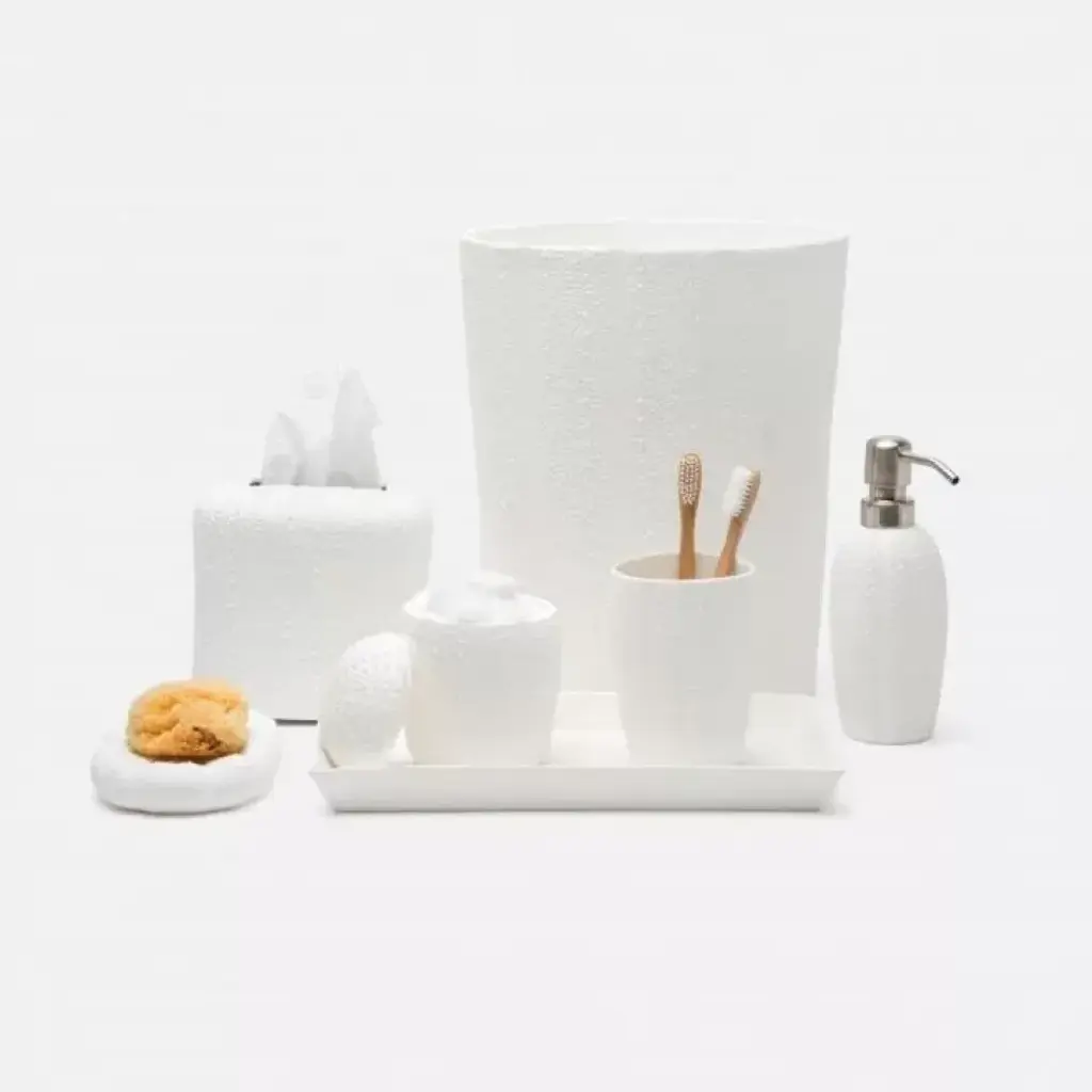 Our Hilo brings the beauty of the sea to your bath. Crisp, white porcelain adorned with a delicate sea urchin pattern provides a perfect combo of new and natural. The set’s curved edges add a softness and the canister’s lid resembles the unique sea creature itself. The designers at Pigeon & Poodle believe the details of a home are just as important as the furniture. A gorgeous toothbrush holder or handcrafted canister can elevate an entire bath, the perfect frame can heighten the feel of a whole space, and a good-looking storage basket can be your look’s missing link. With thoughtful design and top-notch craftsmanship, Pigeon & Poodle create home accessories with the care and attention typically reserved for larger pieces of décor.