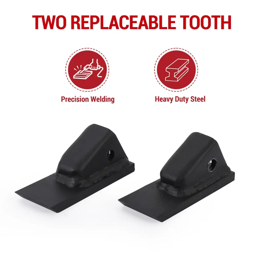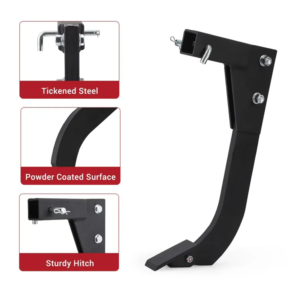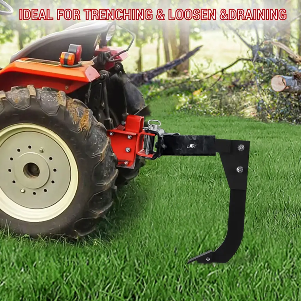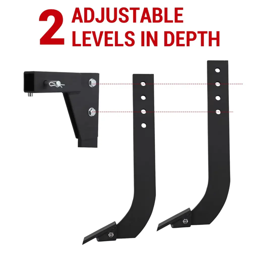 Introducing the Hitch Mounted Ripper Heavy Duty Subsoiler for ATV/UTV tractors. Crafted from high-strength carbon steel, this tool ensures durability without deformation. With replaceable ripper teeth and all necessary installation hardware included, this subsoiler offers long-lasting performance. The four adjustable holes on the box scraper shank allow for height adjustments every 2 inches (5 cm). Compatible with most ATVs/UTVs featuring a 2-inch receiver, it promises easy assembly.