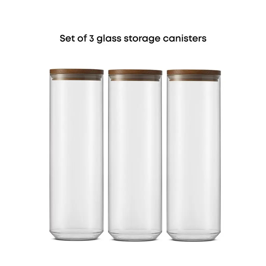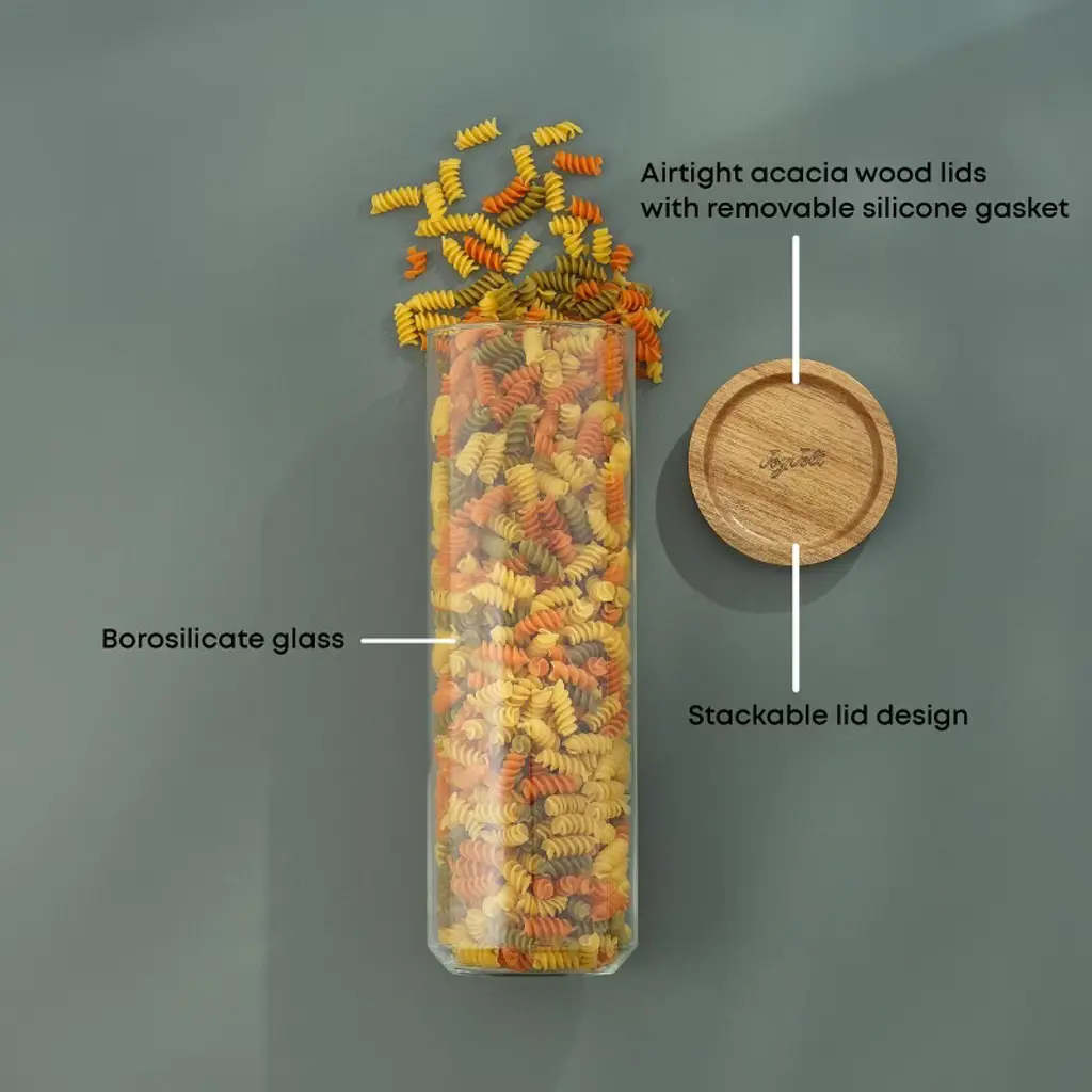 For the ingredients that need a little extra room—whether you're stocking up or staying organized. This trio of glass canisters with wood lids are perfect for spaghetti, breadsticks, and long grains (no snapping or squeezing needed!). Big on storage, sleek in style.