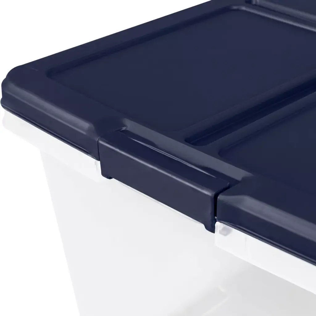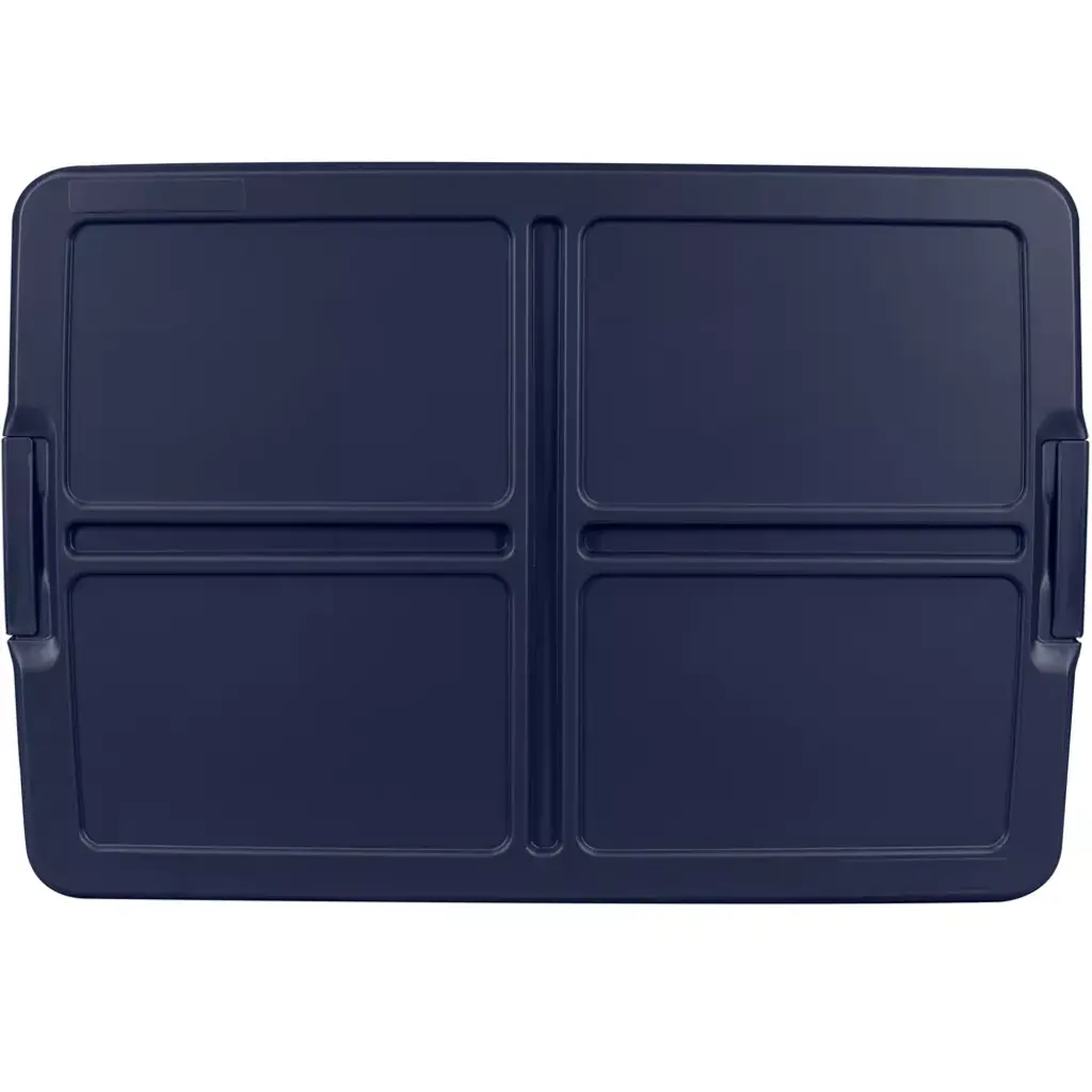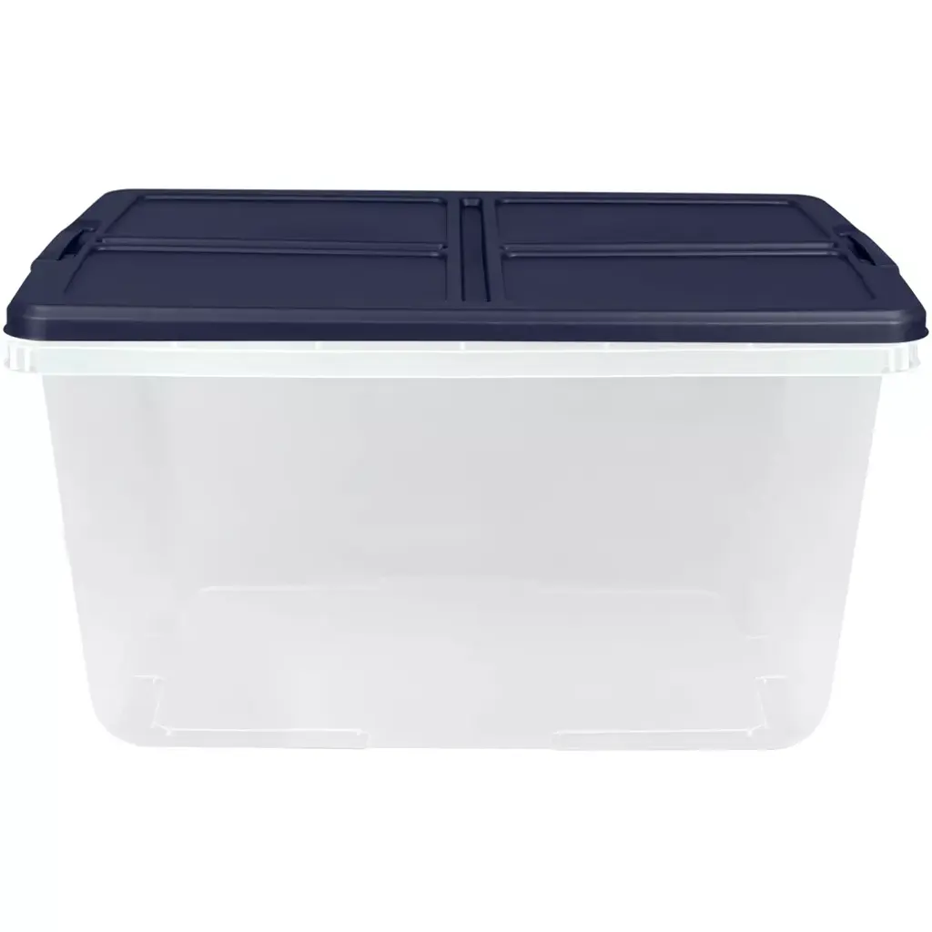 Available in multiple stackable configurations, 66-qt storage bins feature double-rimmed walls to prevent bowing and buckling, while latched handles keep the lids securely attached to the base. What's more, crossbars built into the plastic containers lids provide an extra level of strength and durability. Perfect for office, workshop, and garage storage solutions. This storage bin is ideal for anywhere you need to stack smart and save space. Interior Base Dimensions: 12.19"W x 18.75"L. Exterior Dimensions: 16.8"W x 23.98"L x 13.04"H.