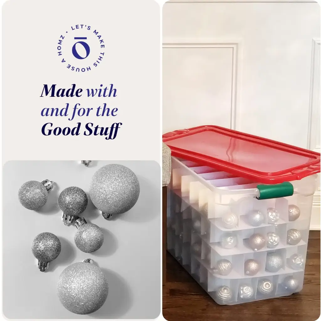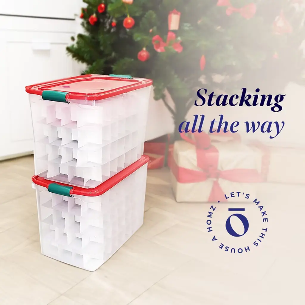 Celebrate this yuletide season with a clean space by keeping decorations organized with the Homz 112 Qt Latching Holiday Plastic Storage Container Tote Box 2 Pack. With these totes, you can easily make homes spotless by having your favorite holiday decorations, clothing, gift wraps, and more neatly stored away. Made from durable see-through plastic that withstands ongoing use, this holiday storage container has removable dividers that provide space for ornaments and latching handles for comfortable transport and stacking. Most importantly, you don't have to worry about losing items since the lid features sturdy ergonomic latches locking the cover tightly and securely. Thanks to their large-sized design, you can store these containers for off-season shed, attic, basement, and crawl space storage. When not in use, you can nest the storage containers inside one another for premium space-saving efficiency. Save yourself from the stress that comes with constant mess with the Homz 112 Qt Latching Holiday Plastic Storage Container Tote Box 2 Pack.