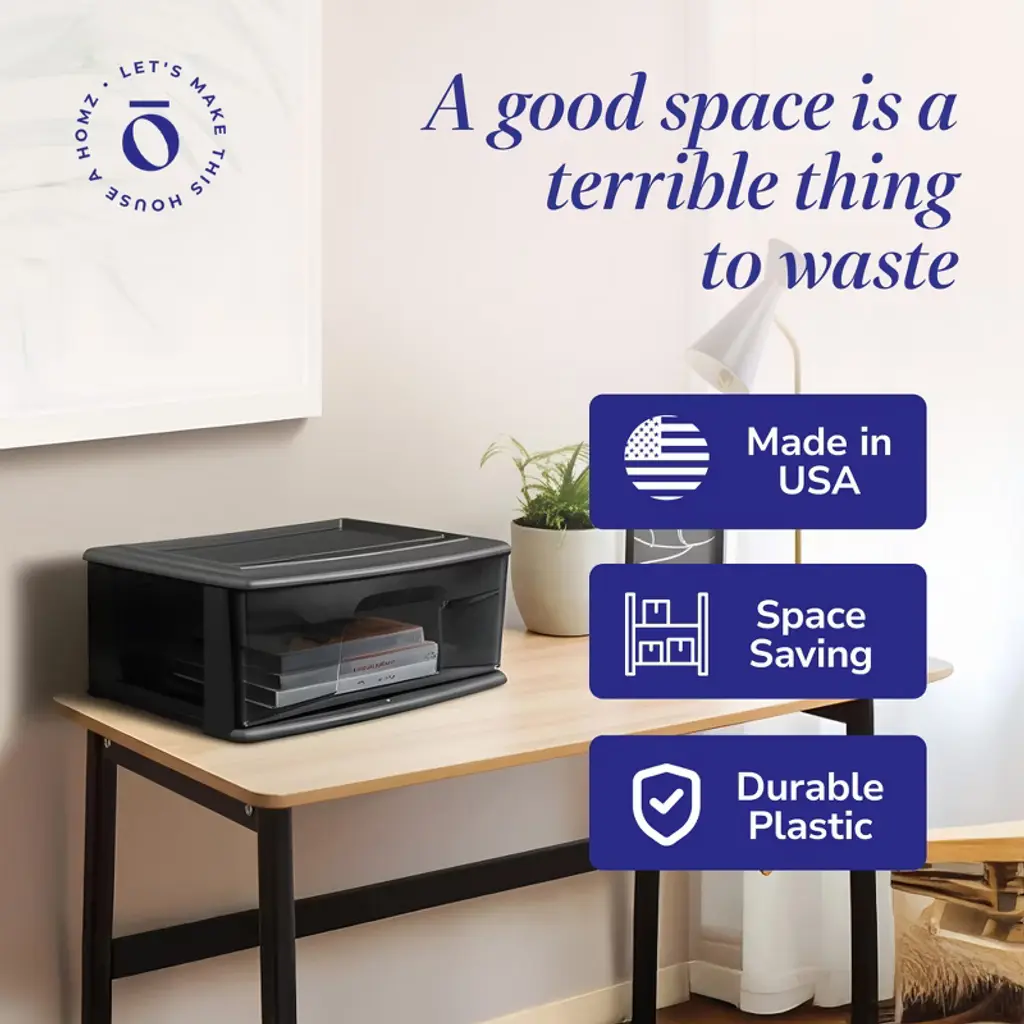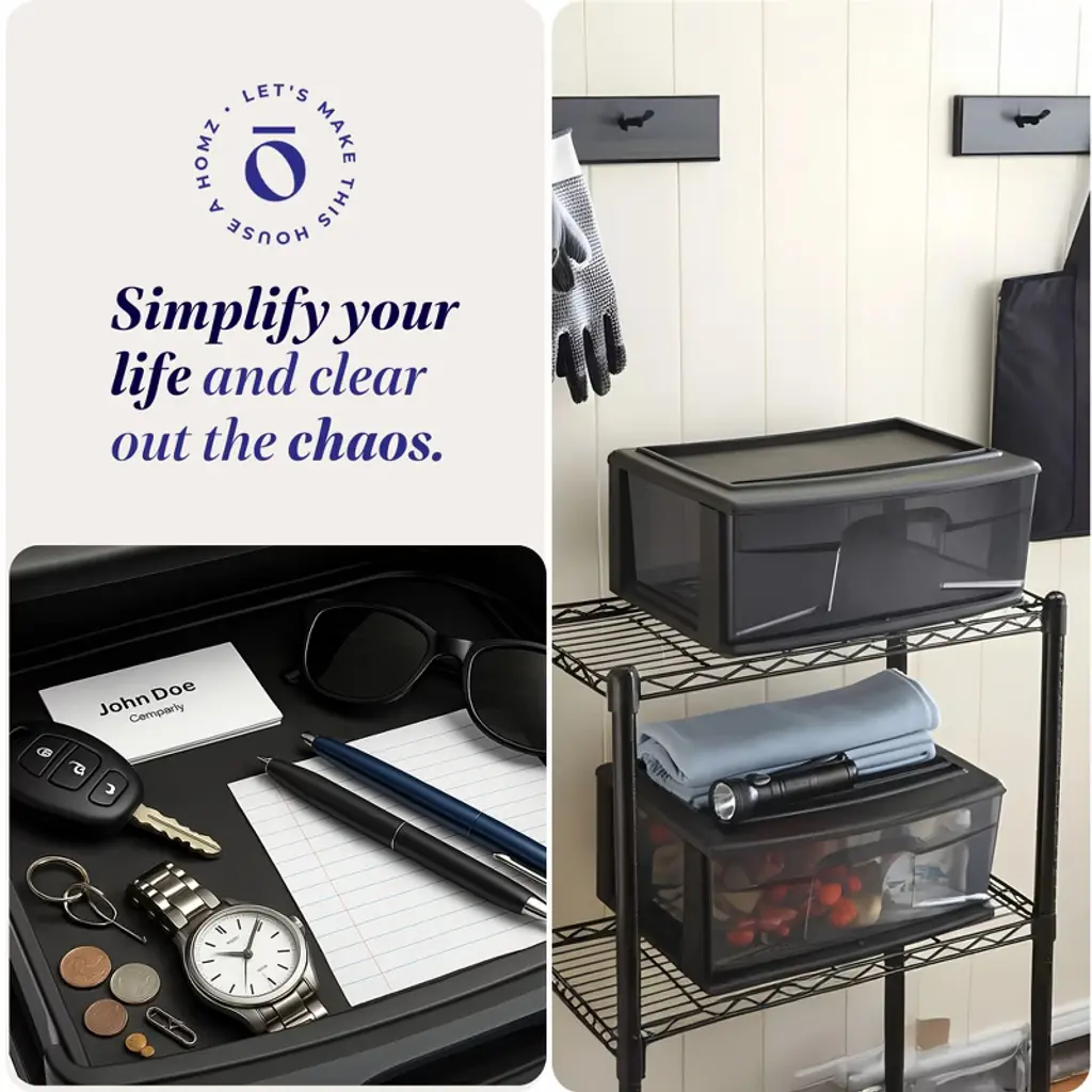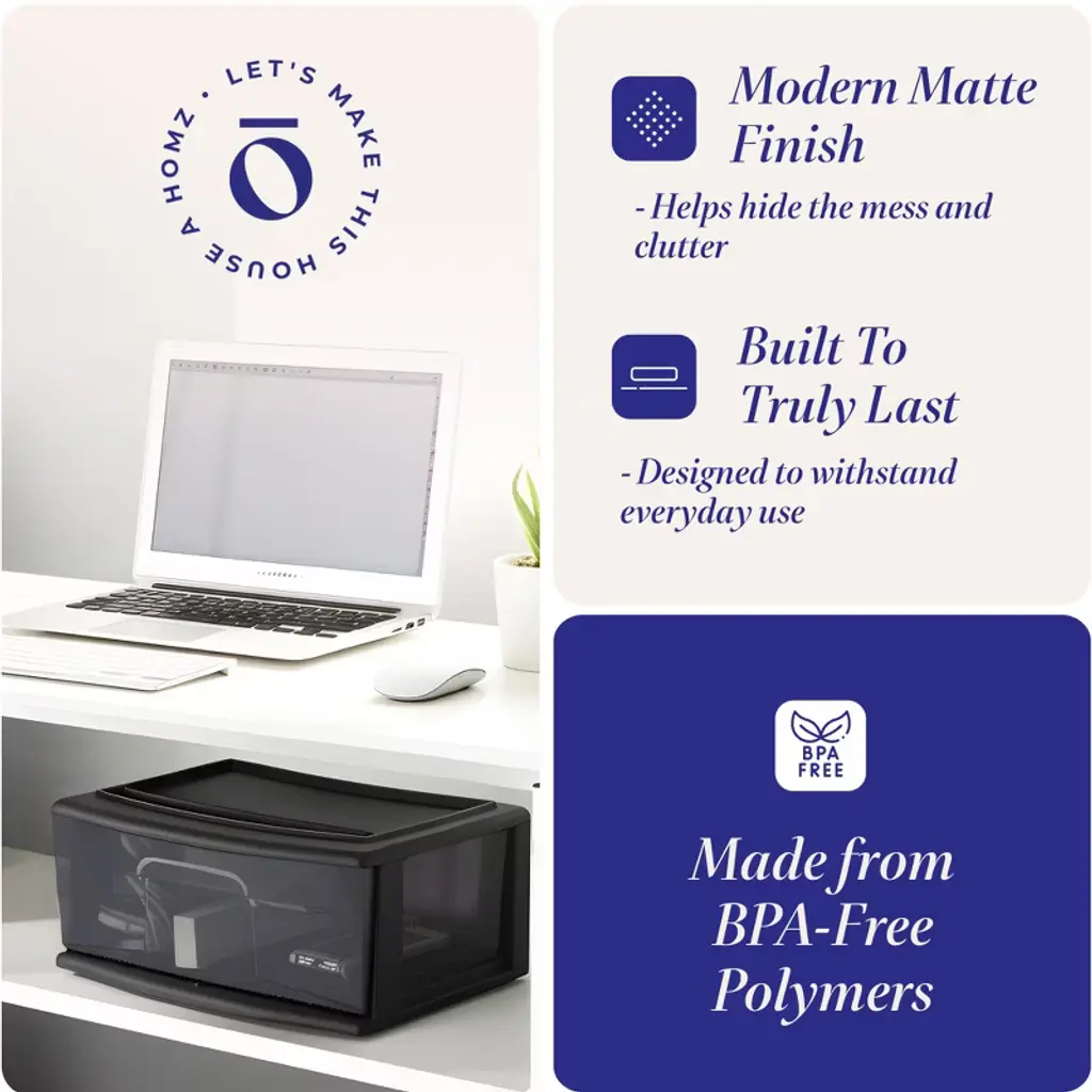 Introducing the Homz 1-Drawer Cart Organizer, the perfect solution for storing and organizing small to wide body-sized items in any room in your home or office. This versatile cart has 1 spacious, smoke-tinted plastic drawer that is easy to remove whenever you need to transport or reorganize the contents. The recessed lid provides a functional space for school accessories, office supplies, paperwork, bathroom items, and more, helping you stay organized and efficient. This wide-body storage cart measures 21.5"L x 15"W x 9"H, offering ample storage space while maintaining a compact footprint, perfect to fit next to walls or in between furniture. Whether you're looking to tidy up your bedroom, dorm room, laundry room, kitchen, pantry, bathroom, office, garage, or any other space, this cart is the ideal organizational solution. Use it for personal items, shoes, art supplies, seasonal decorations, and more! HOMZ believes that no clutter should be left behind. Our wide collection of storage containers is durable, efficient, space-saving, and some would even say sexy. Pick up a few containers to tame your worst mess and bring order to the chaos. Elevate your home with the Plastic Storage Cart.