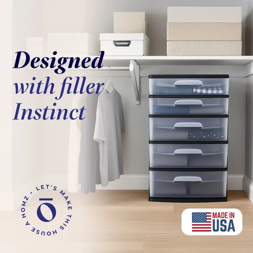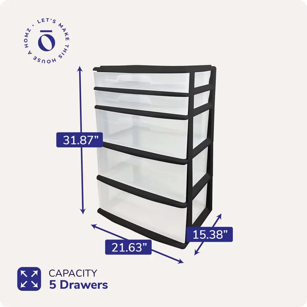 Say goodbye to the chaos of clutter in your home with the Homz Plastic 5-Drawer Storage Container Tower. This versatile cabinet is a game-changer for home, office, classroom, and crafting spaces. With a pristine black frame and clear drawers, it seamlessly blends functionality with aesthetics. Boasting five generously sized drawers, this tower offers ample space for a variety of items, from art supplies and craft essentials to clothing and office supplies. The extra-wide design provides a substantial storage solution, while the clear drawers ensure effortless visibility of your stored treasures. Whether you're aiming to declutter your living space or enhance efficiency in your workspace, this organizer tower is up for the task. The drawers effortlessly glide in and out, making access a breeze. Crafted with durability in mind, the sturdy plastic frame ensures long-lasting use, whether it's holding heavy office files or delicate sewing materials. Measuring dimensions of 15.38 inches in length, 21.63 inches in width, and 31.87 inches in height, it strikes the balance between offering ample storage capacity and fitting seamlessly into your available space. The elegant black frame adds a touch of sophistication, making it suitable for various settings. Transform chaos into order with the Homz Plastic 5-Drawer Storage Container Tower. Experience the joy of a well-organized environment and unlock your space's true potential.