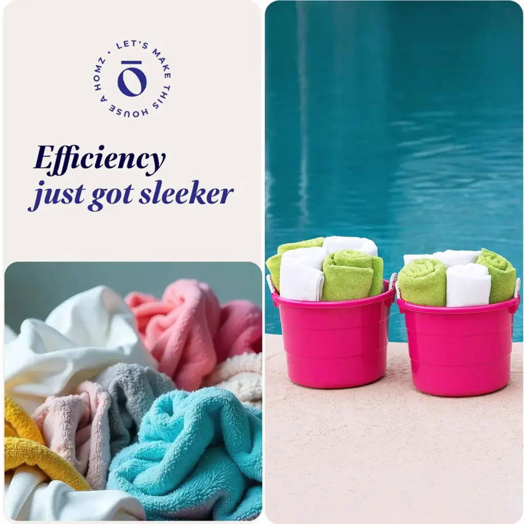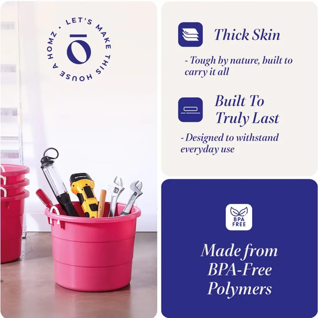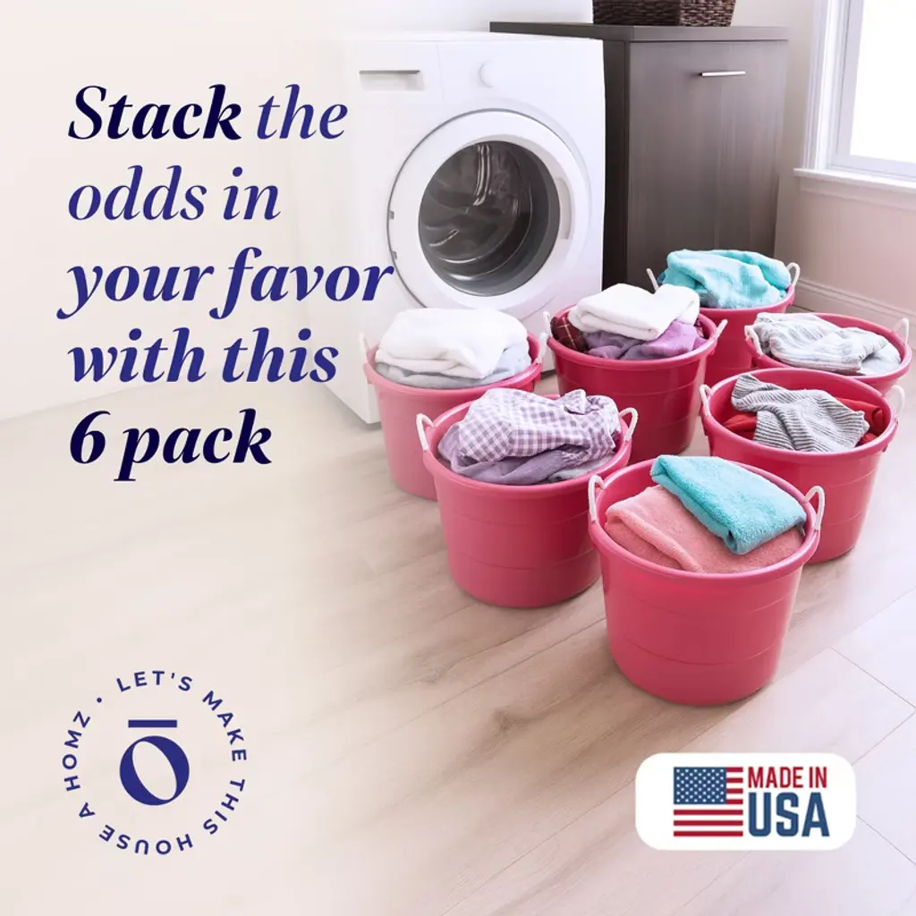 Introducing the HOMZ Rope Handle Indoor or Outdoor Storage Bucket Tubs, the ultimate solution for your home organization and storage needs. This set of 6 large 18 gallon large buckets with handles offers endless possibilities for tidying up any space. These easy access storage bins are constructed with durable plastic materials and built to withstand tough conditions, so you can use them on your deck or in your garage, basement, shed, or greenhouse. These big buckets are equipped with rugged nylon rope handles on each side that make transporting heavy loads a breeze, making them ideal for a wide variety of tasks around your home. These versatile storage tubs are ready for anything! They adapt to your needs effortlessly whether as a laundry tub hamper, party drink bucket cooler, plastic toy bin, utility bucket, mixing tub for arts and crafts activities, beach or poolside container for toys and towels, harvesting bin for fruits and vegetables, and more. Whatever you need them for, these large plastic tubs step up to the challenge, providing flexible storage solutions for every corner of your home. These round plastic tub containers feature an open-top design and can support up to 50 lbs. of supplies, tools, and equipment, so you can keep your items easily accessible yet fully contained. This bucket storage tub set has a nestable feature that reduces their footprint even more when they aren't in use, so you can easily stack them. These heavy-duty plastic large storage tubs can handle whatever you throw in them without cracking or breaking. Whenever they get dirty, simply hose them down for quick cleaning. HOMZ believes that no clutter should be left behind. Our wide collection of storage containers is durable, efficient, space-saving, and some would even say sexy. Pick up a few containers to tame your worst mess and bring order to the chaos.