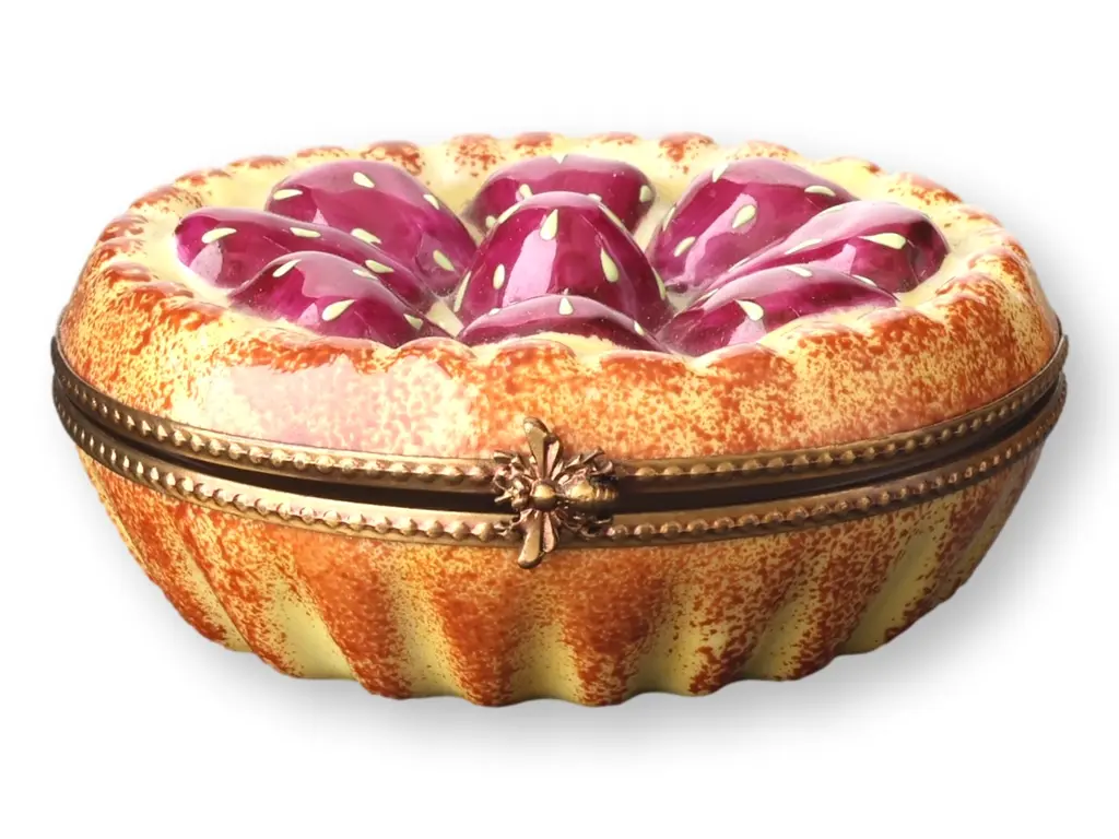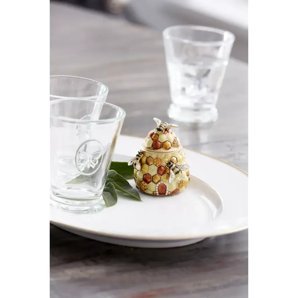 Our jeweled honey bees are busy filling each honeycomb with vibrant enamels and sparkling crystals! The Honey beehive box glistens with hand-painted butterscotch, caramel and golden enamels with hand-set topaz Swarovski crystals. Lift the lid on this 14K gold finished box to reveal a grape enameled lining. A sweet gift!