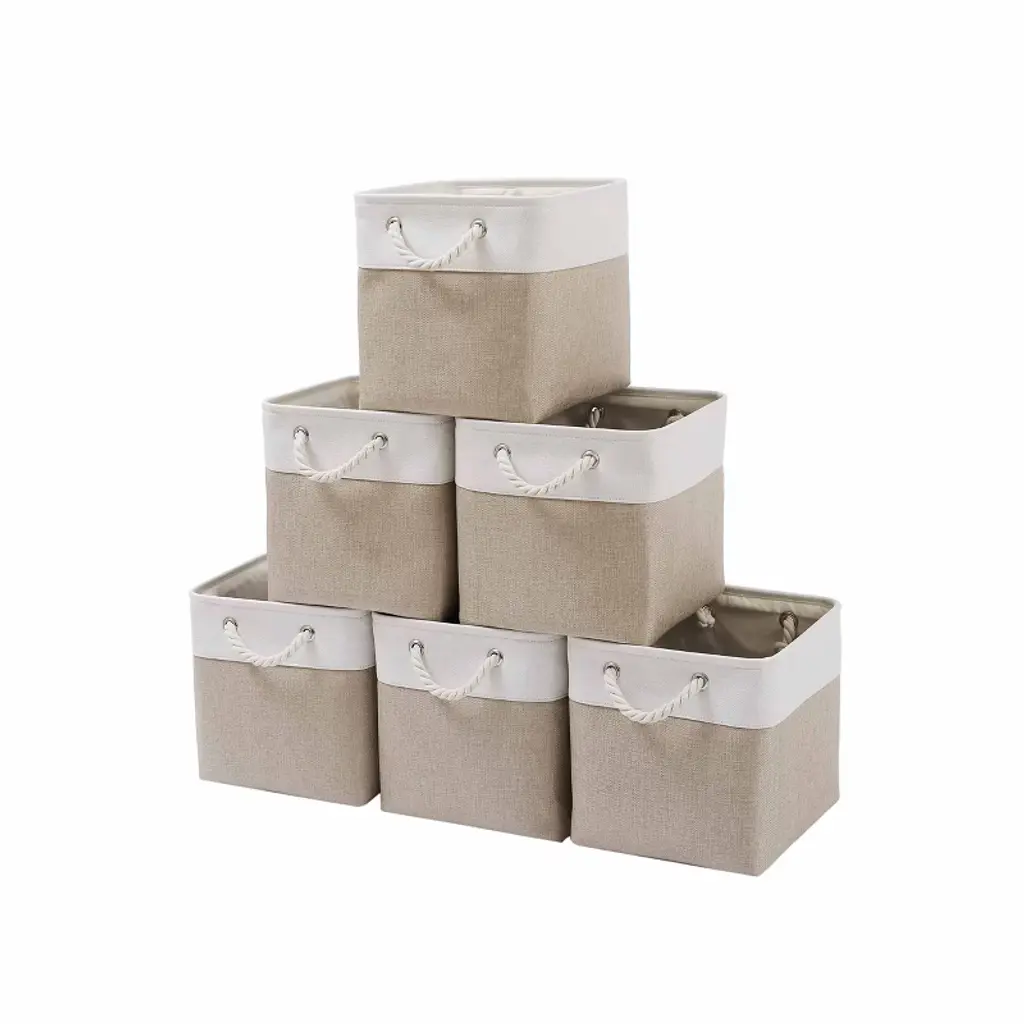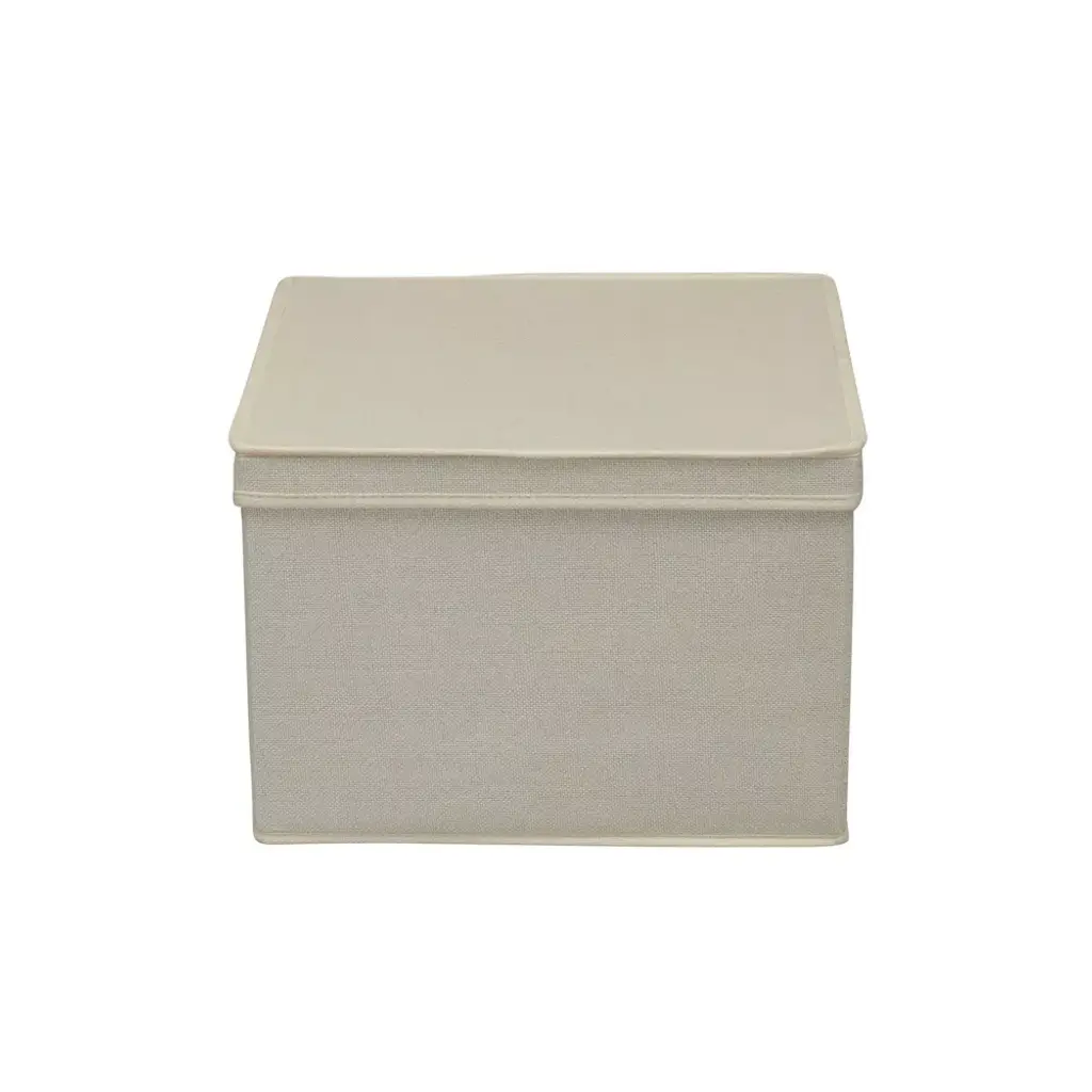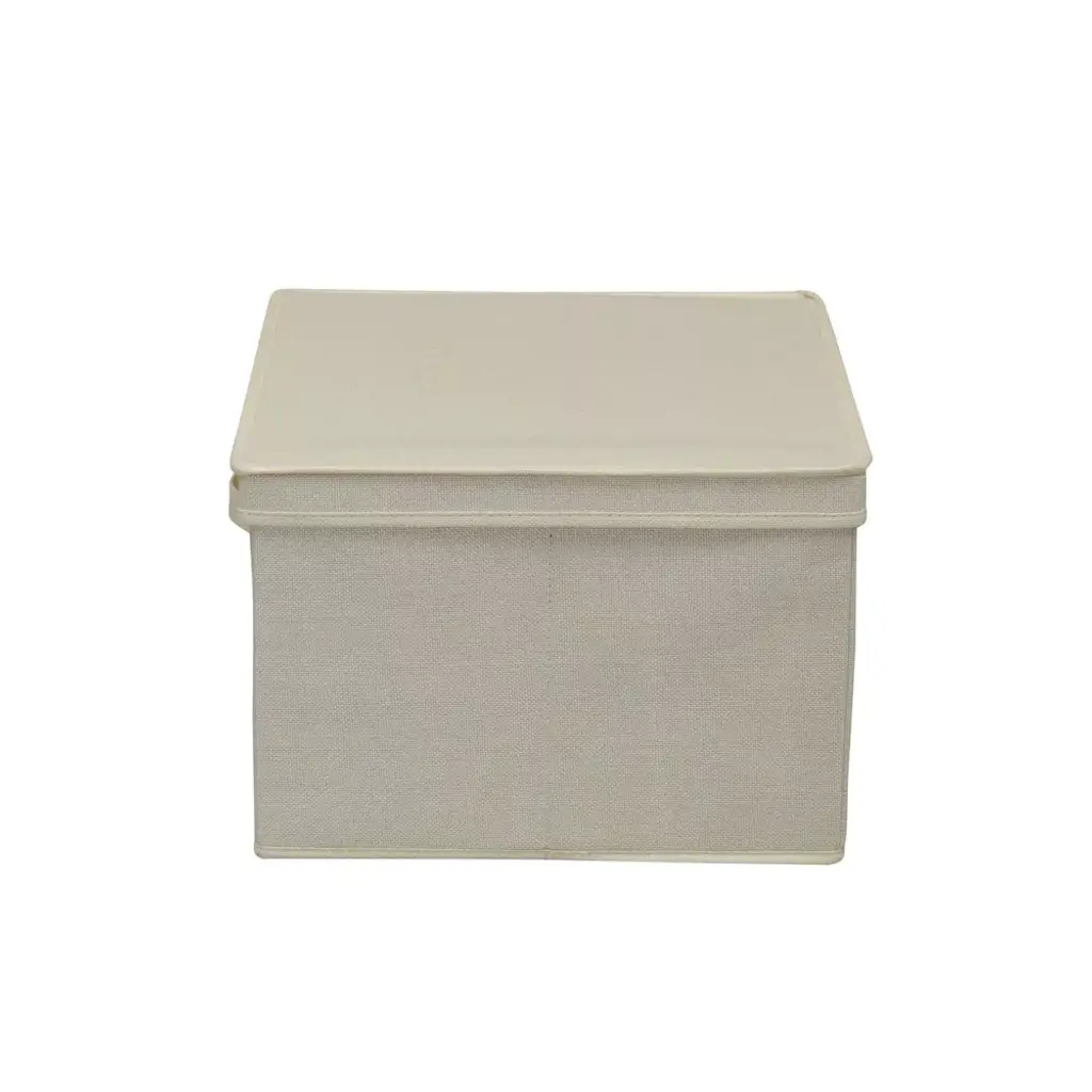 This versatile and stylish square storage box with lid offers exceptional organizational possibilities for any closet or storage area in your home. Its classic design and neutral color offer an aesthetically pleasing alternative to oft-cluttered areas of your home. The box is made of a durable poly-cotton canvas blend and is reinforced with sturdy cardboard for added stability, durability, and stackability. The material offers exceptional protection from dirt and other common household elements that can damage your stored items. At the same time, the material is breathable, so your woven items won’t become stale or odorous regardless of how long they’re stored. For added convenience, each box includes a single decorative for easy and immediate, one-handed access when stored on a tall shelf or under a bed. These large storage boxes offer a functional and stylish solution for any home storage application. Bedrooms, bathrooms, attics, basements--these boxes offer simple storage when and where you need it. They are perfect for blankets, accessories, off-season clothing, towels, craft supplies and anything else in need of order and organization. When not in use, the box can be folded flat and tucked away as to not occupy excess space in your home’s closet or storage area. Decorative and practical, this storage box with lid is the perfect way to get your clutter organized and out of the way. The product dimensions are 10 inches high, 15 inches wide, and 15 inches deep.