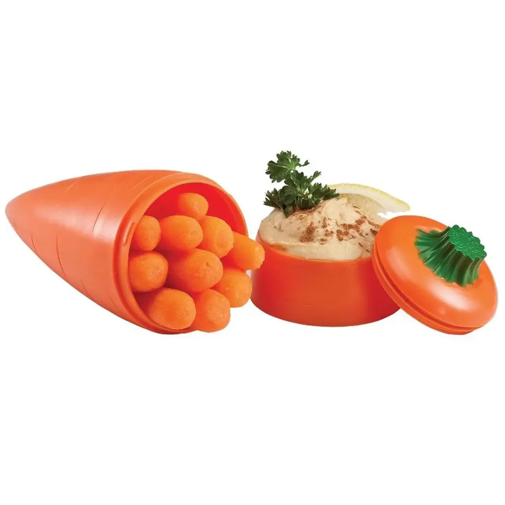Healthy Eating On-the-Go...Office, School, Travel.Carry baby carrots and your favorite dip. Great for carrots & hummus or carrots & ranch dressing. The set consists of a carrot container and a dip container with a lid. All attach together for easy transport. Good for you, good for your wallet, good for the planet.BPA Free, Dishwasher Safe, Reusable, Recyclable. Measures approximately 7" long.